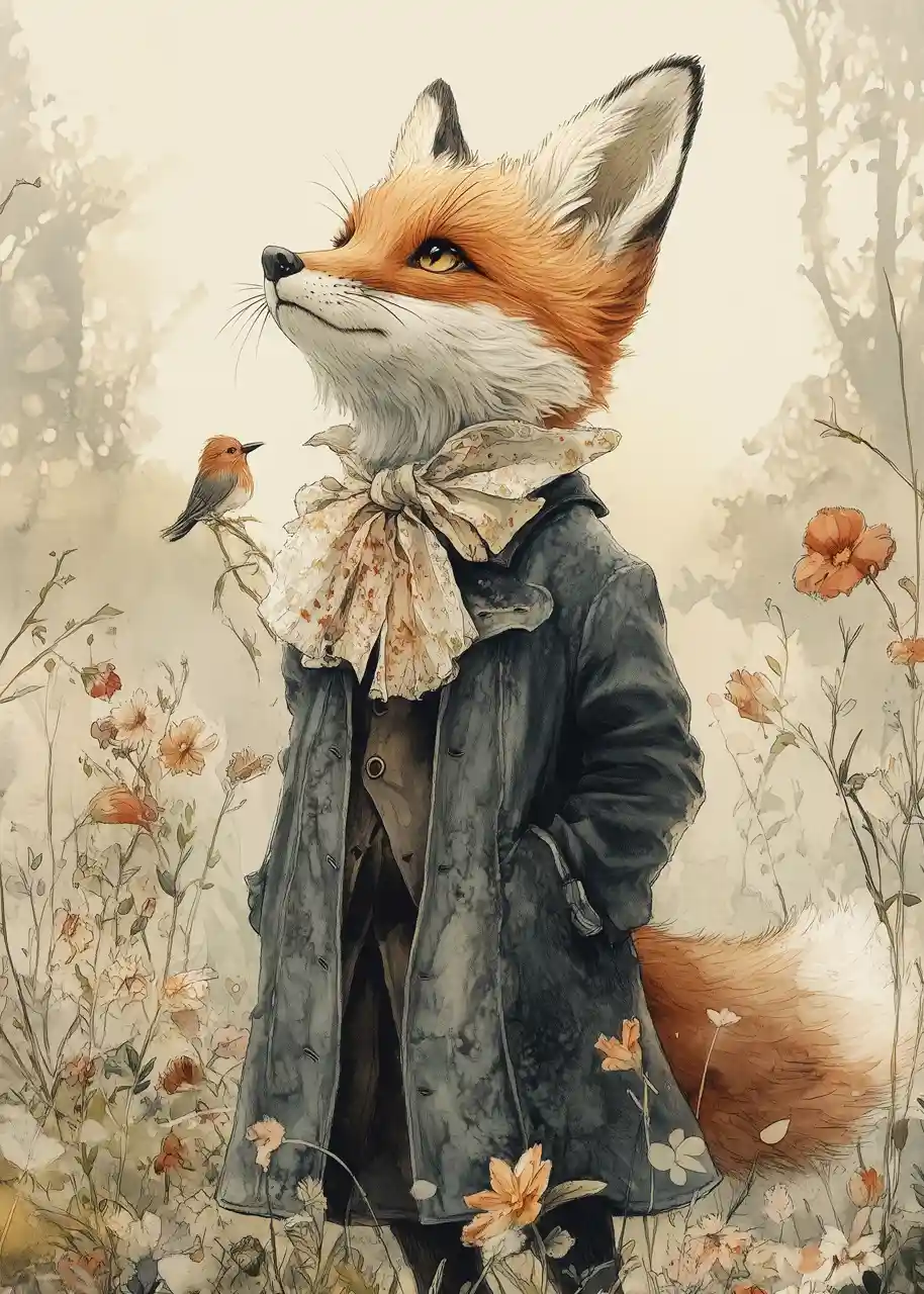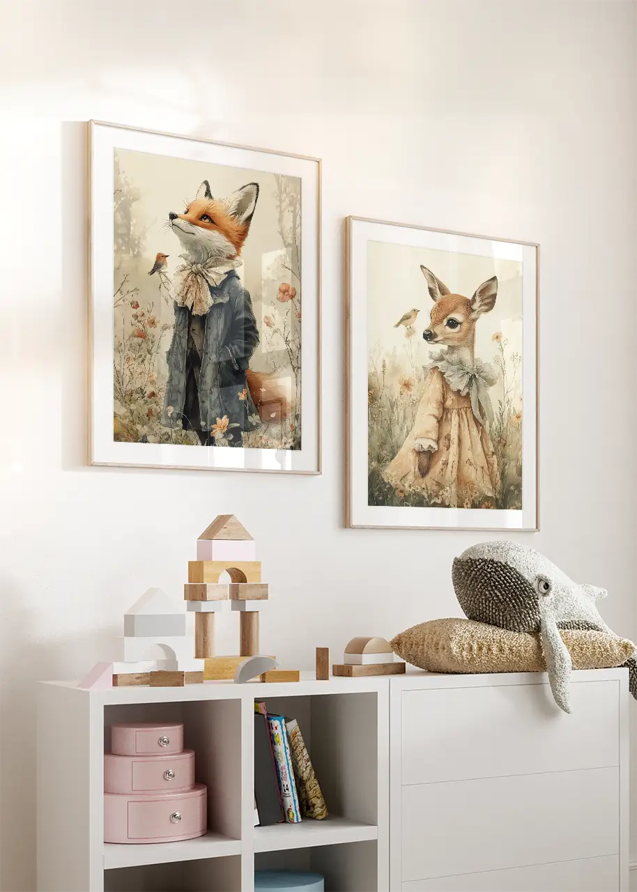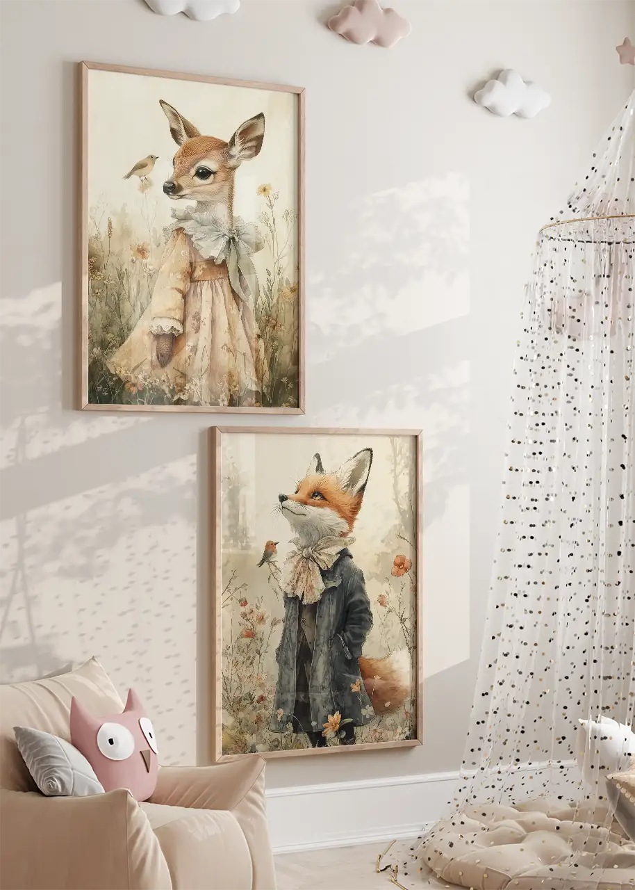 Ten zestaw plakatów z naszej oryginalnej kolekcji „Baśniowe zwierzęta” przeniesie każdego do magicznego świata, gdzie zwierzęta stają się bohaterami bajkowych opowieści. Każda ilustracja w tym zestawie to unikalna scena, pełna subtelnych detali, które oczarowują zarówno dzieci, jak i dorosłych. Eleganckie postacie zwierząt, ubrane w stylizowane stroje i wkomponowane w naturalne, pełne kwiatów tło przyciągają spojrzenia i pobudzają wyobraźnię. Dzięki wyjątkowemu połączeniu oryginalnej formy, delikatnych, pastelowych kolorów i wyrazistych detali te obrazy przypominają ilustracje z klasycznych książek dla dzieci, co dodatkowo wzbudza nostalgię. Ten zestaw dwóch plakatów idealnie nadaje się do dziecięcego pokoju, gdzie stworzy przytulną, baśniową atmosferę sprzyjającą zabawie i marzeniom. Wybierz swoje ulubione „Baśniowe zwierzęta” i pozwól, aby te urocze, magiczne ilustracje wypełniły Waszą domową przestrzeń ciepłem i urokiem, dodając jej unikalnego charakteru. Te plakaty to także doskonały pomysł na prezent, który zachwyci zarówno małych, jak i dużych miłośników sztuki i bajek.