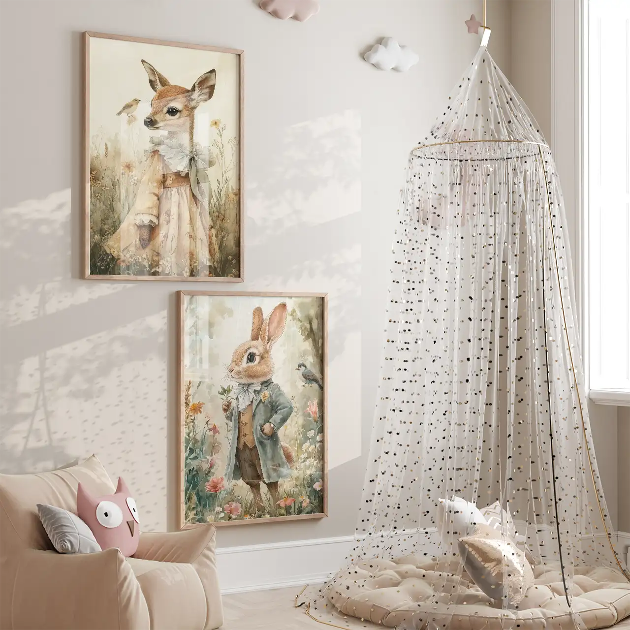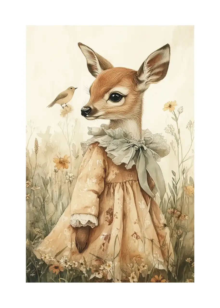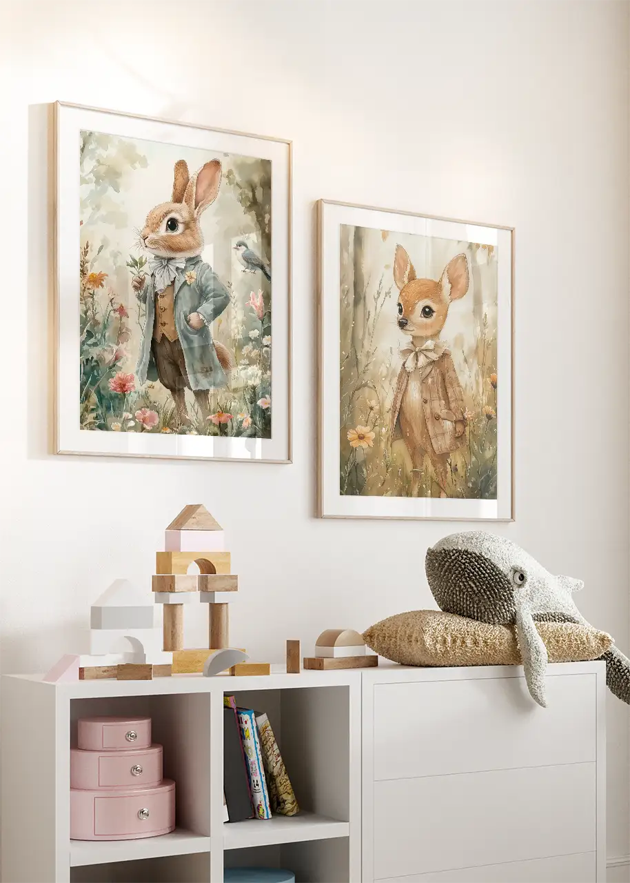 Ten zestaw plakatów z naszej oryginalnej kolekcji „Baśniowe zwierzęta” przeniesie każdego do magicznego świata, gdzie zwierzęta stają się bohaterami bajkowych opowieści. Każda ilustracja w tym zestawie to unikalna scena, pełna subtelnych detali, które oczarowują zarówno dzieci, jak i dorosłych. Eleganckie postacie zwierząt, ubrane w stylizowane stroje i wkomponowane w naturalne, pełne kwiatów tło przyciągają spojrzenia i pobudzają wyobraźnię. Dzięki wyjątkowemu połączeniu oryginalnej formy, delikatnych, pastelowych kolorów i wyrazistych detali te obrazy przypominają ilustracje z klasycznych książek dla dzieci, co dodatkowo wzbudza nostalgię. Ten zestaw dwóch plakatów idealnie nadaje się do dziecięcego pokoju, gdzie stworzy przytulną, baśniową atmosferę sprzyjającą zabawie i marzeniom. Wybierz swoje ulubione „Baśniowe zwierzęta” i pozwól, aby te urocze, magiczne ilustracje wypełniły Waszą domową przestrzeń ciepłem i urokiem, dodając jej unikalnego charakteru. Te plakaty to także doskonały pomysł na prezent, który zachwyci zarówno małych, jak i dużych miłośników sztuki i bajek.