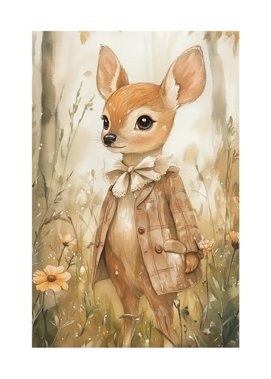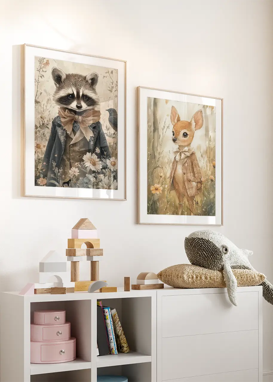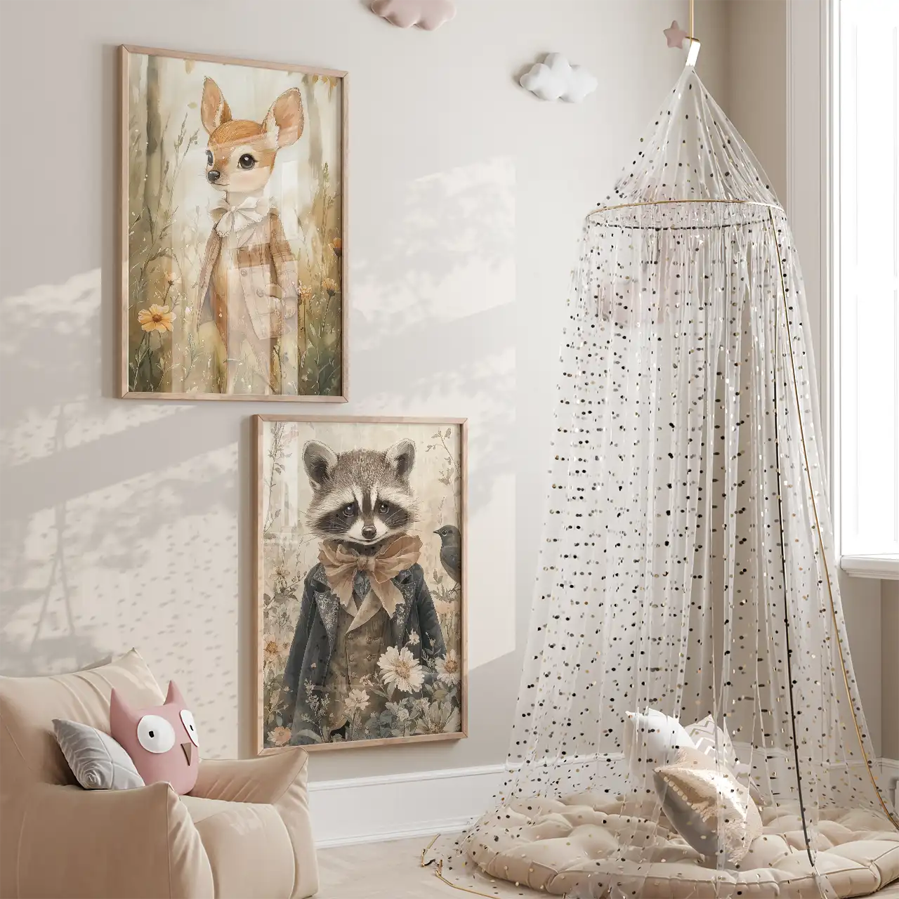 Ten zestaw plakatów z naszej oryginalnej kolekcji „Baśniowe zwierzęta” przeniesie każdego do magicznego świata, gdzie zwierzęta stają się bohaterami bajkowych opowieści. Każda ilustracja w tym zestawie to unikalna scena, pełna subtelnych detali, które oczarowują zarówno dzieci, jak i dorosłych. Eleganckie postacie zwierząt, ubrane w stylizowane stroje i wkomponowane w naturalne, pełne kwiatów tło przyciągają spojrzenia i pobudzają wyobraźnię. Dzięki wyjątkowemu połączeniu oryginalnej formy, delikatnych, pastelowych kolorów i wyrazistych detali te obrazy przypominają ilustracje z klasycznych książek dla dzieci, co dodatkowo wzbudza nostalgię. Ten zestaw dwóch plakatów idealnie nadaje się do dziecięcego pokoju, gdzie stworzy przytulną, baśniową atmosferę sprzyjającą zabawie i marzeniom. Wybierz swoje ulubione „Baśniowe zwierzęta” i pozwól, aby te urocze, magiczne ilustracje wypełniły Waszą domową przestrzeń ciepłem i urokiem, dodając jej unikalnego charakteru. Te plakaty to także doskonały pomysł na prezent, który zachwyci zarówno małych, jak i dużych miłośników sztuki i bajek.