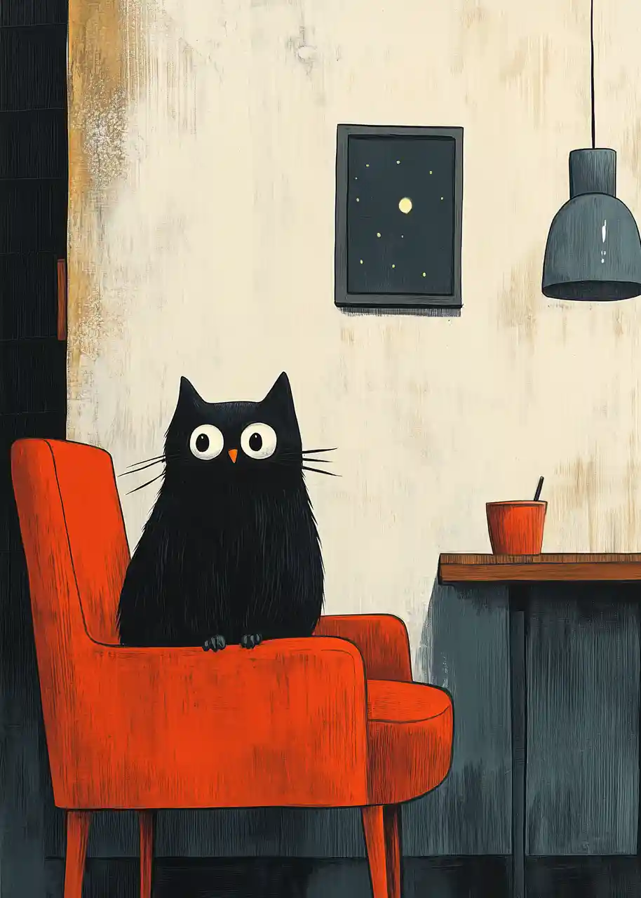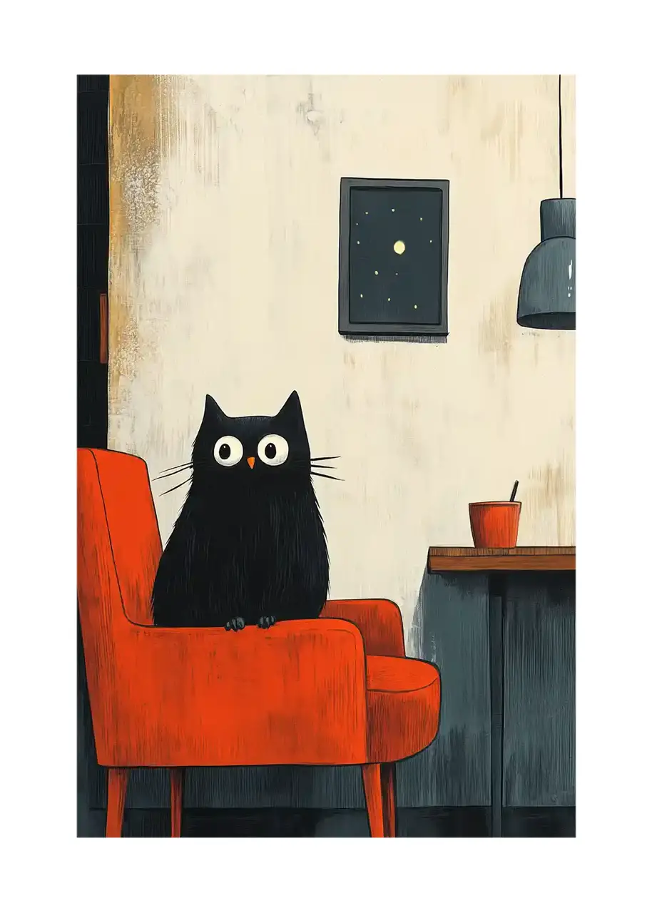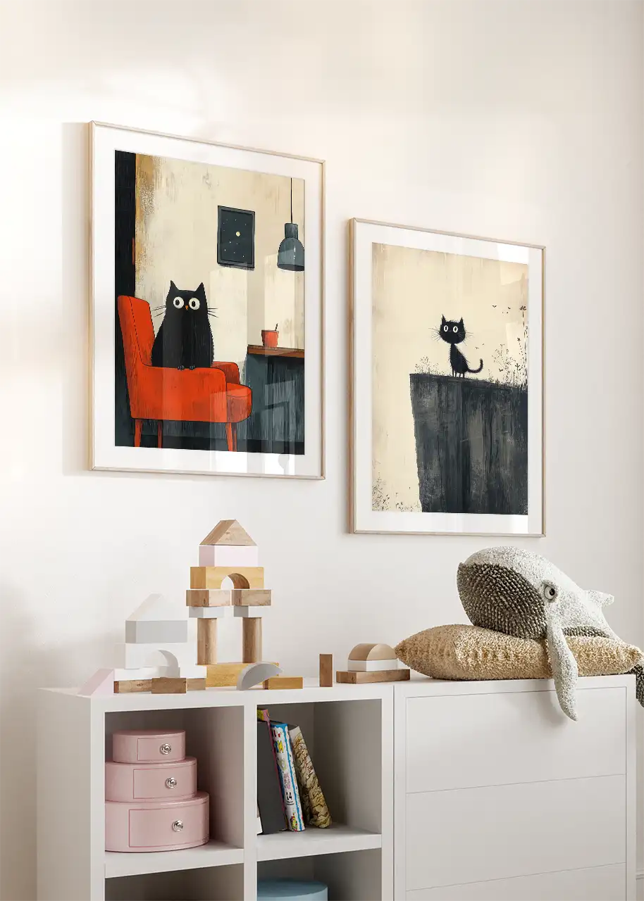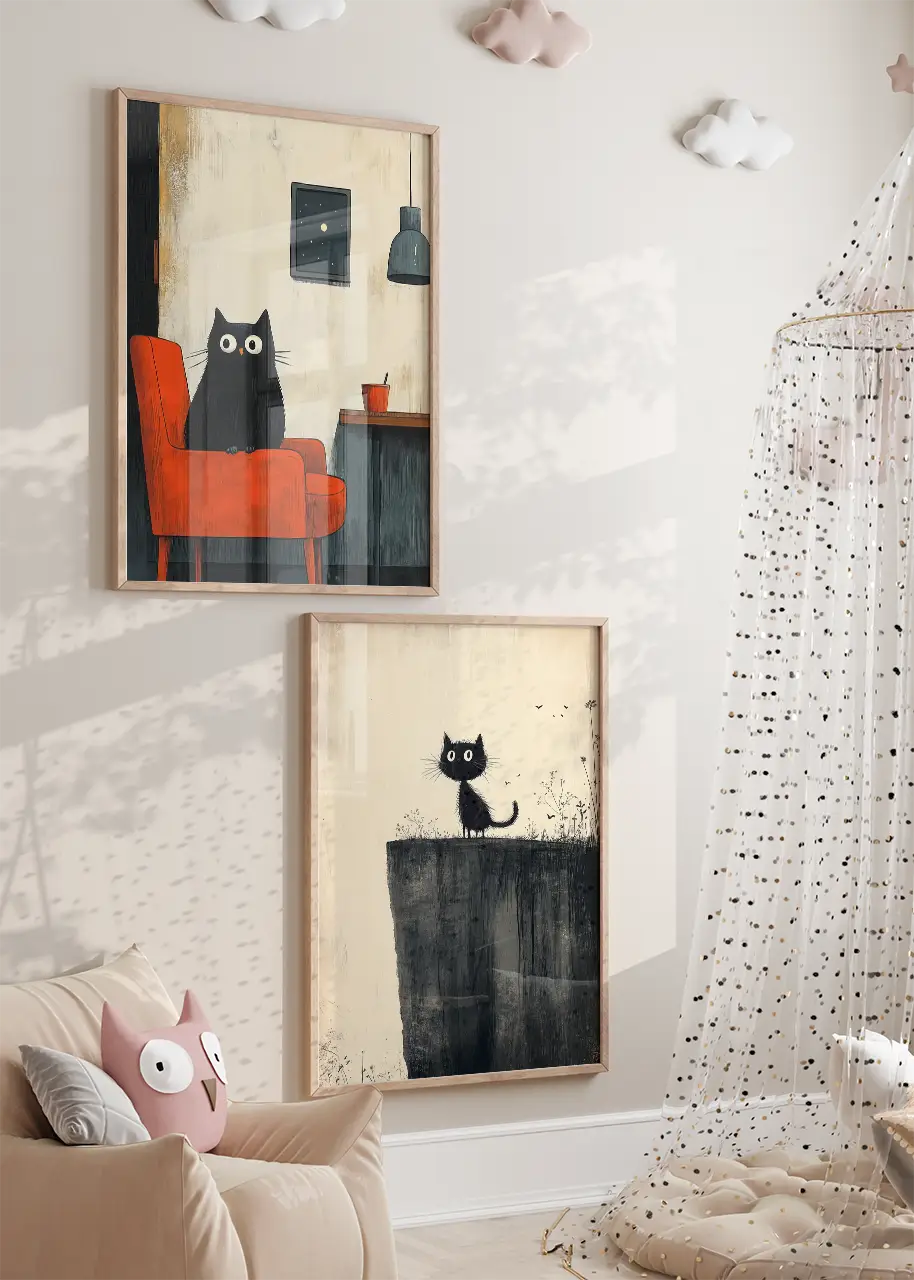 Zestaw plakatów „Czarne koty” przedstawia dwie ilustracje z motywem czarnych kotków w minimalistycznym, artystycznym stylu. Każda grafika prezentuje kota w innej scenie – jeden siedzi na czerwonym fotelu w przytulnym wnętrzu, a drugi spogląda z wysokiej półki lub parapetu.