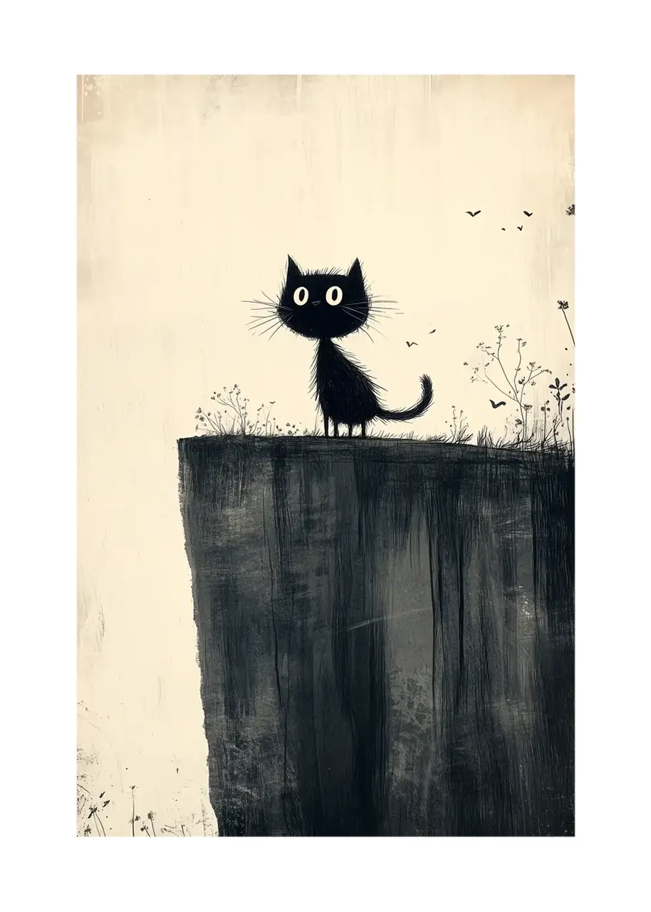 Oba plakaty tworzą spójną kompozycję wizualną. Kontrast czarnych sylwetek kotów z jasnym tłem sprawia, że grafiki są czytelne i dekoracyjne.