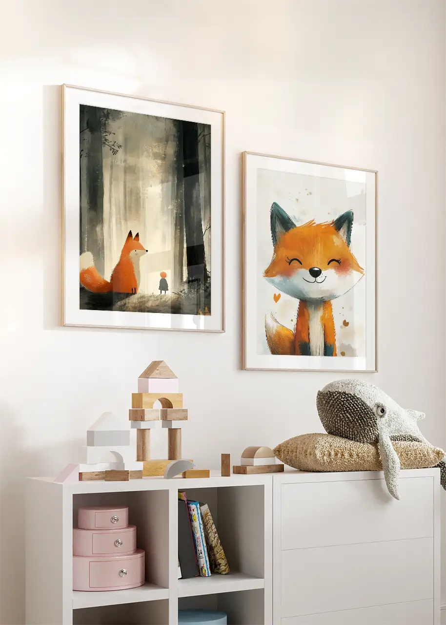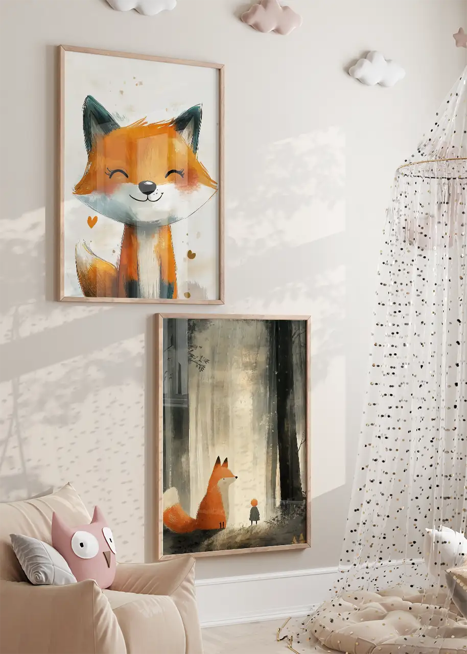 Ten zestaw plakatów to piękna opowieść o liskach, które ożywiają baśniowy las swoim urokiem i radosną energią. Jeden plakat przedstawia uśmiechniętego lisa, którego wyraz pyszczka emanuje pozytywną energią i ciepłem, natomiast drugi ukazuje magiczną leśną scenerię, w której lis towarzyszy małej postaci w wędrówce po tajemniczym lesie. To idealna dekoracja do dziecięcego pokoju, która wniesie do wnętrza odrobinę natury i bajkowego klimatu. Zestaw sprawdzi się również jako wyjątkowy prezent dla najmłodszych i ich rodziców.