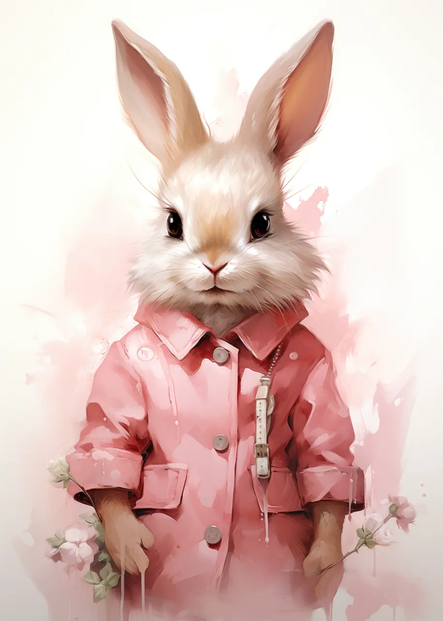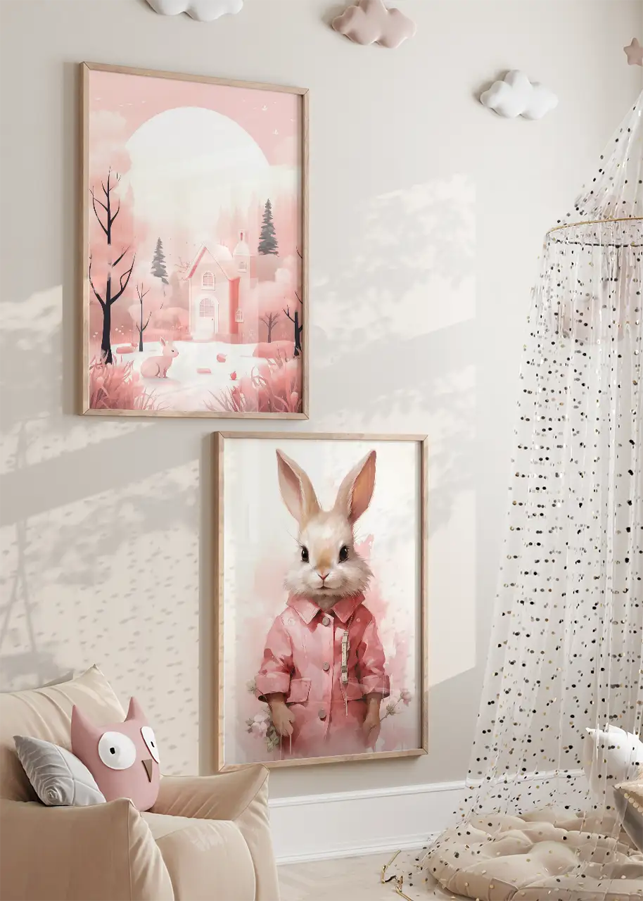 Ten zestaw plakatów dla dzieci to połączenie baśniowej atmosfery i subtelnej elegancji w pastelowych odcieniach różu. Jeden z obrazów przedstawia malowniczy krajobraz z uroczym domkiem i spokojną polaną, a drugi dużego, eleganckiego zająca w różowym płaszczu przeciwdeszczowym, którego wyrazista postać przyciąga uwagę. Delikatny styl i harmonijna kolorystyka sprawiają, że ten nieoczywisty zestaw świetnie sprawdzi się jako dekoracja dziecięcego pokoju lub przytulnego zakątka w każdym domu. To propozycja dla tych, którzy cenią sobie dekoracje z odrobiną fantazji.