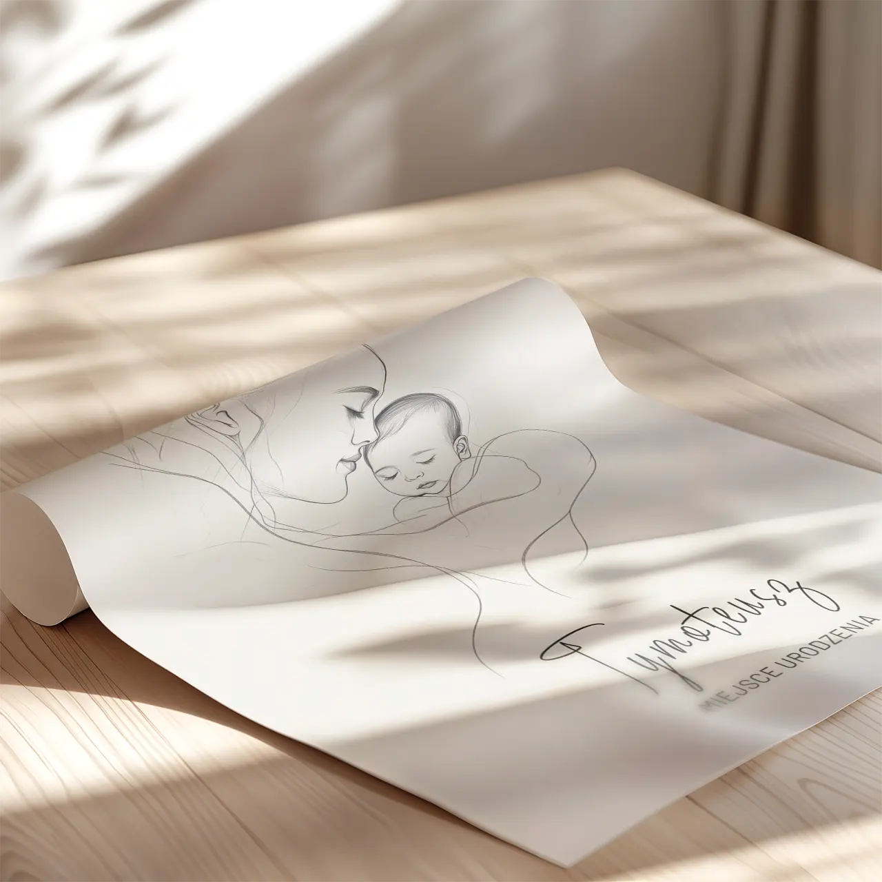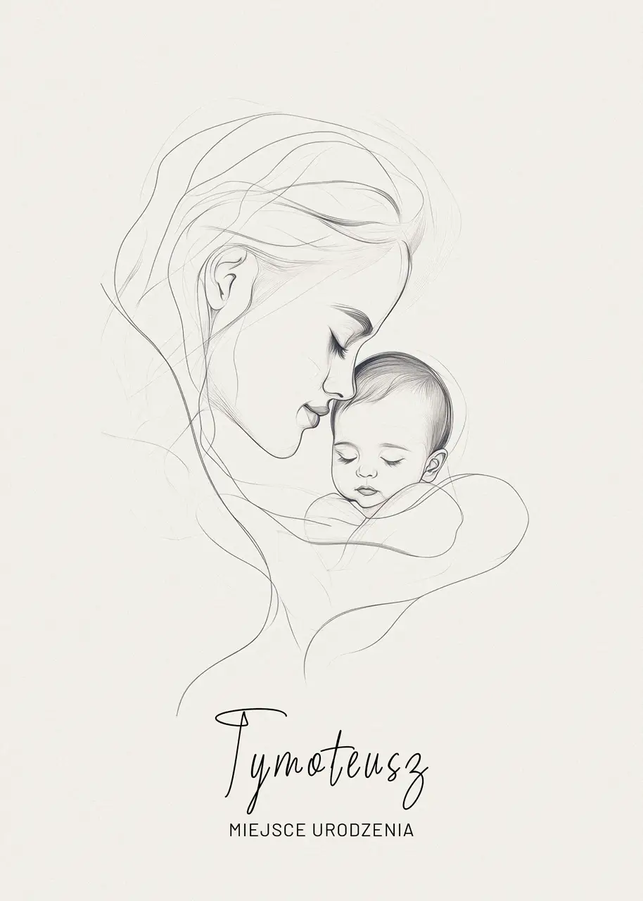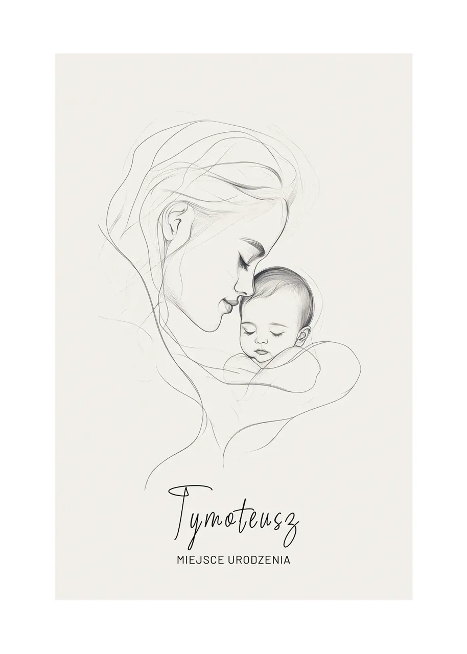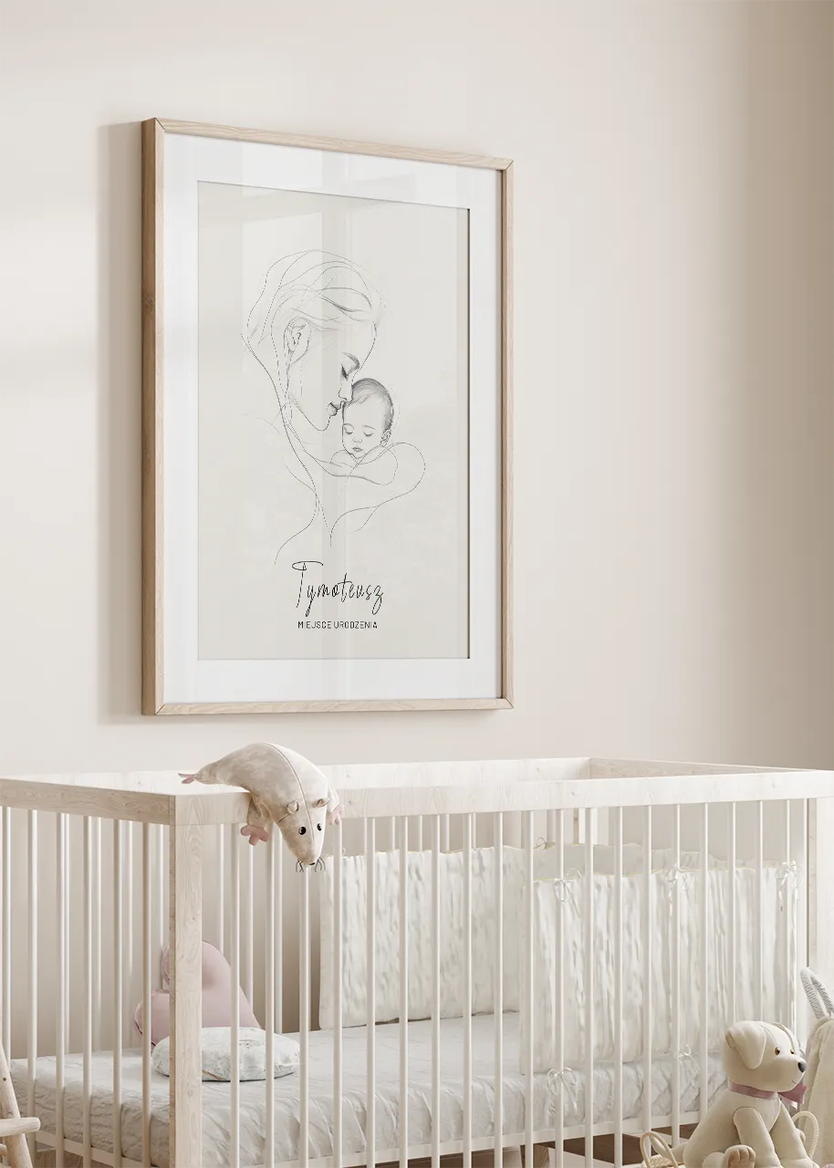 Wzruszająca historia zamknięta w subtelnych liniach. Przedstawia moment, w którym wszystko inne przestaje się liczyć – ciepło matczynej bliskości i spokój śpiącego dziecka. Ta oryginalna metryczka dziecka to więcej niż dekoracja – to obraz uczuć, które tworzą fundament rodziny. Powieś go w dziecięcym pokoju i ciesz się doskonałą pamiątką na długie lata. Minimalistyczny styl tej grafiki doskonale wpasuje się zarówno w nowoczesne, jak i klasyczne wnętrza.