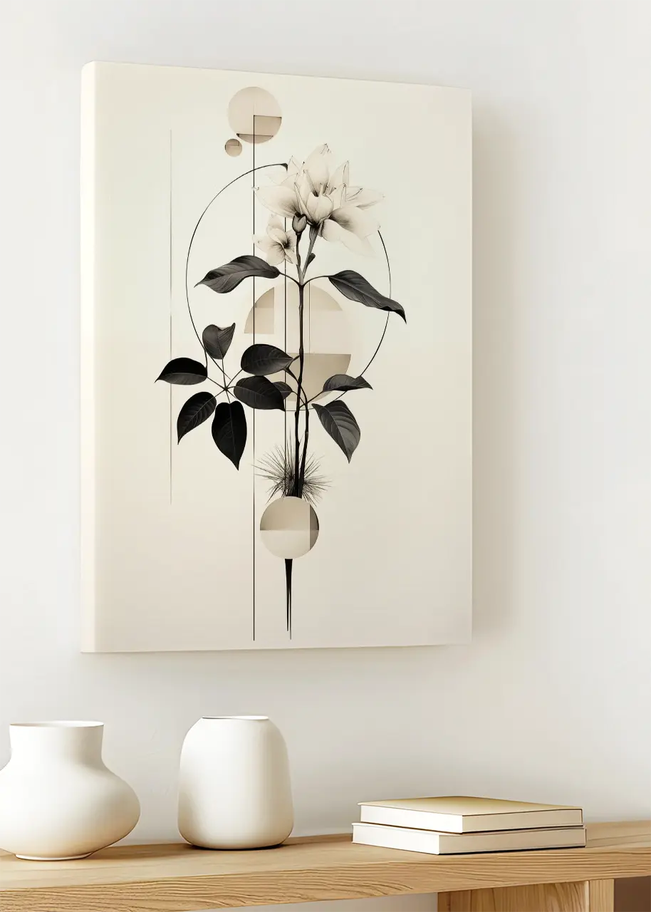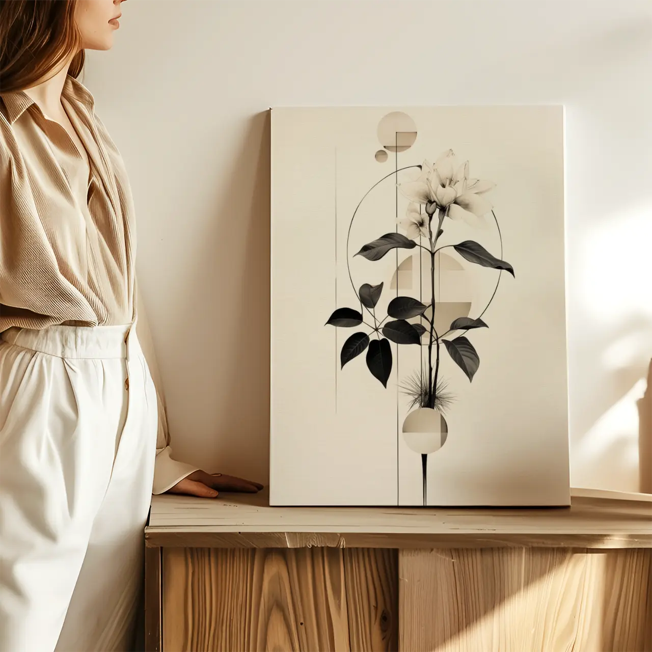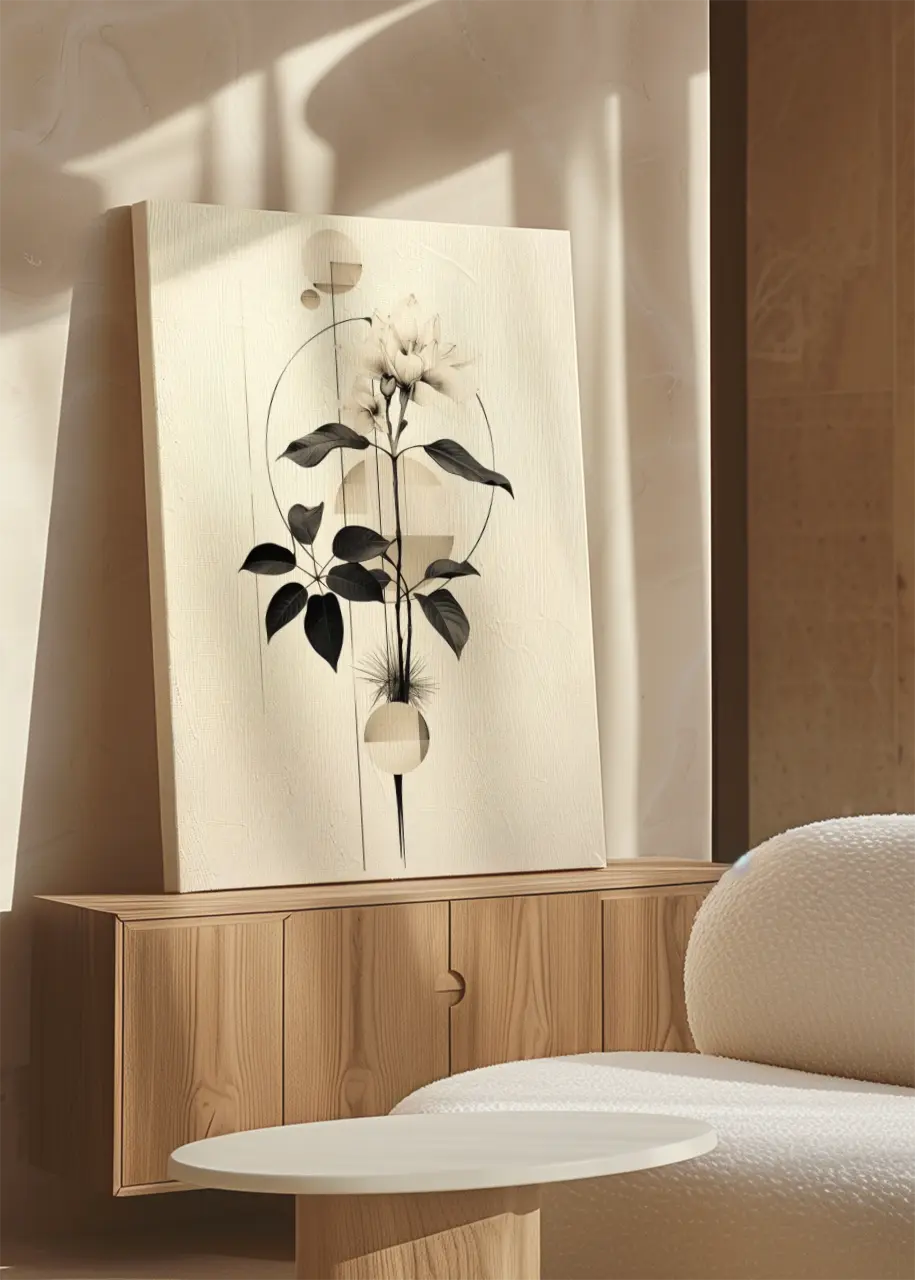 Obraz „Roślinne wariacje IV” to subtelna kompozycja inspirowana naturą, przedstawiająca stylizowaną roślinę z kwiatami i liśćmi w minimalistycznej formie. Delikatna ilustracja została uzupełniona o geometryczne elementy, które nadają grafice nowoczesnego charakteru.