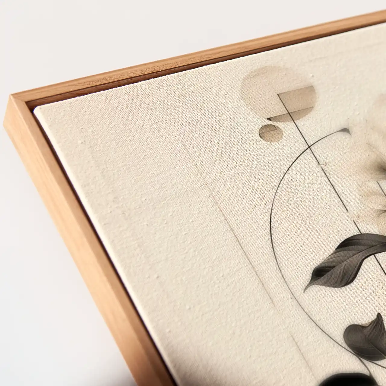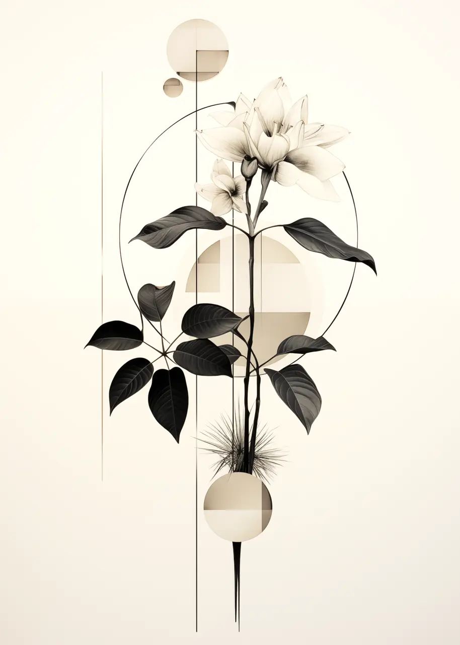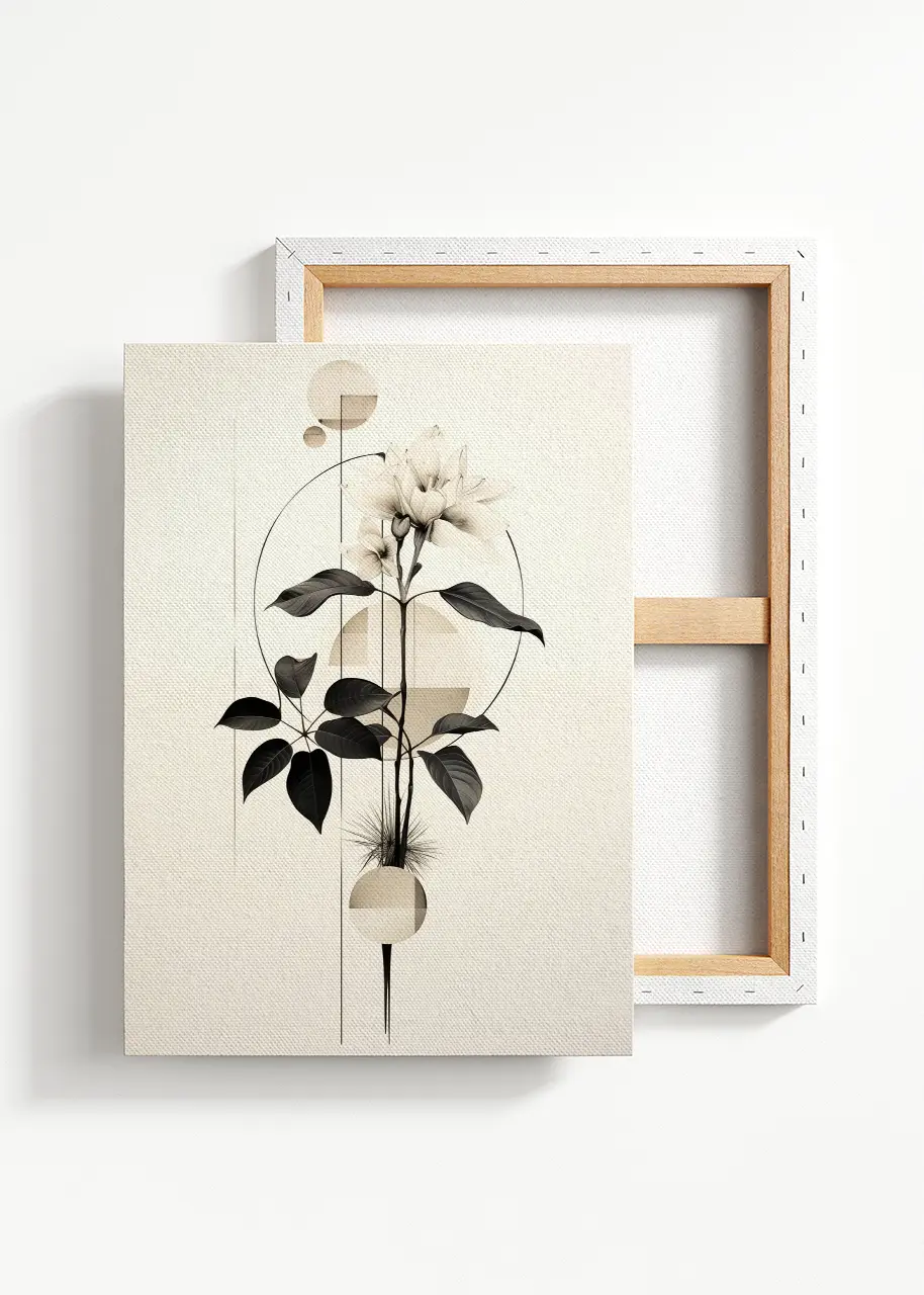 Obraz „Roślinne wariacje IV” to subtelna kompozycja inspirowana naturą, przedstawiająca stylizowaną roślinę z kwiatami i liśćmi w minimalistycznej formie. Delikatna ilustracja została uzupełniona o geometryczne elementy, które nadają grafice nowoczesnego charakteru.