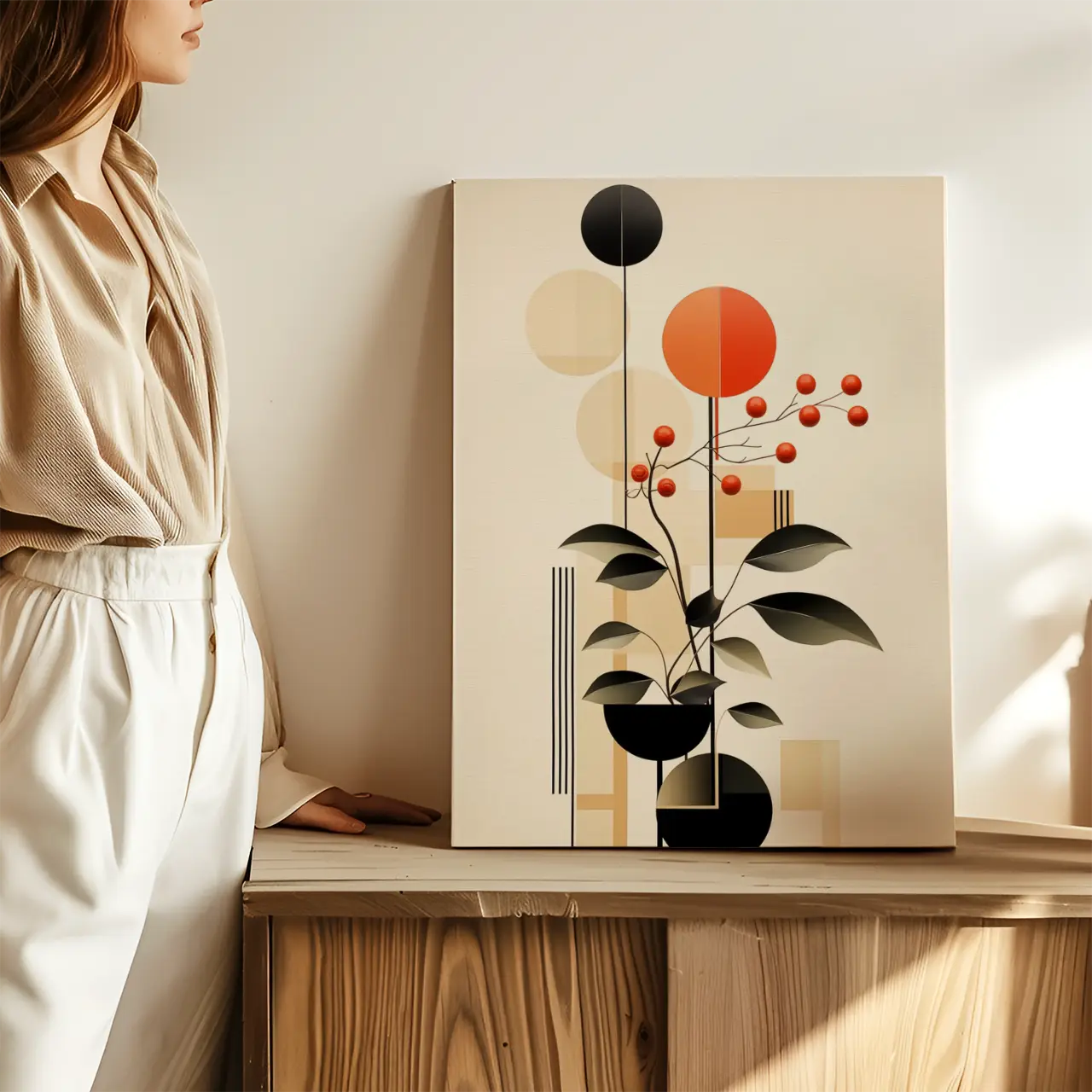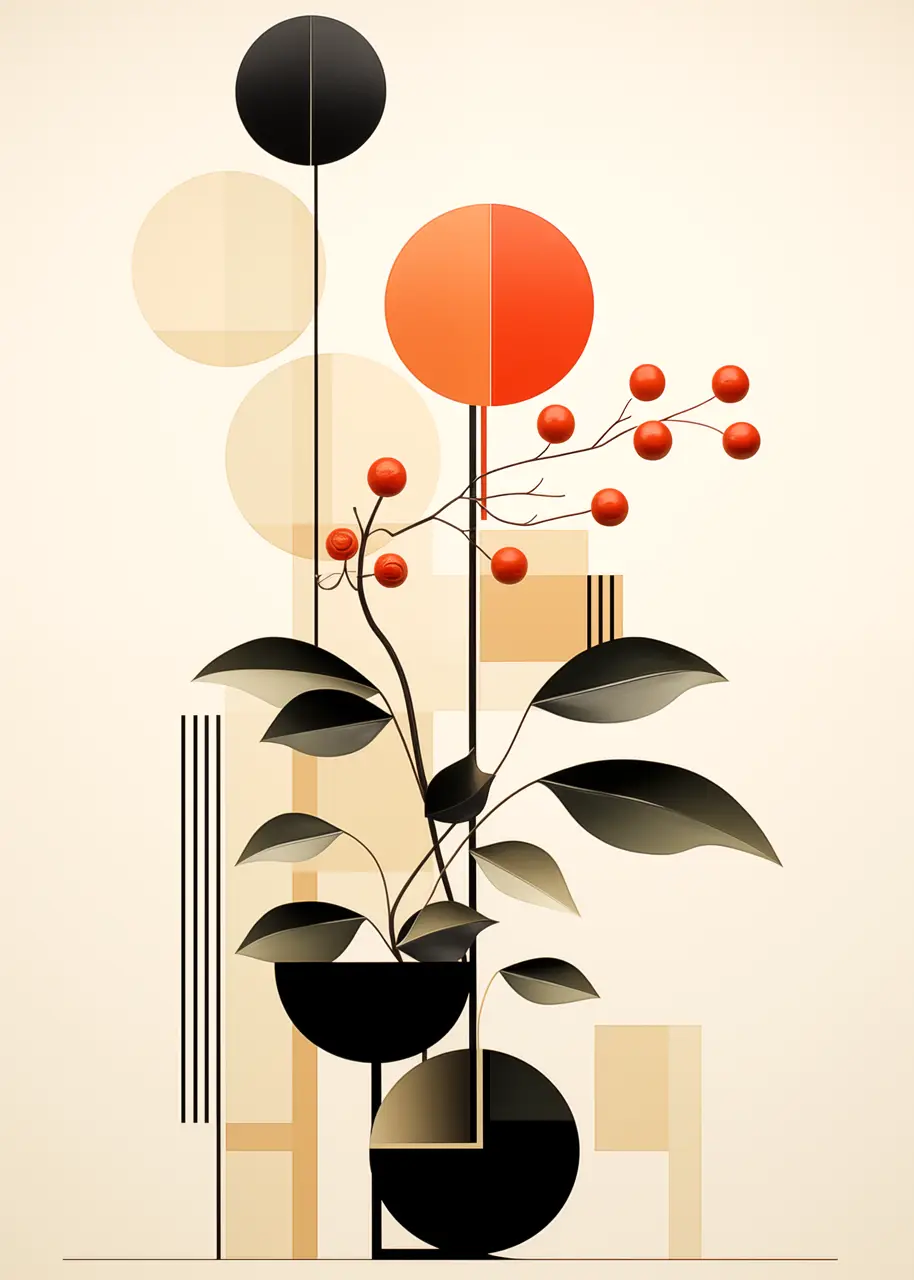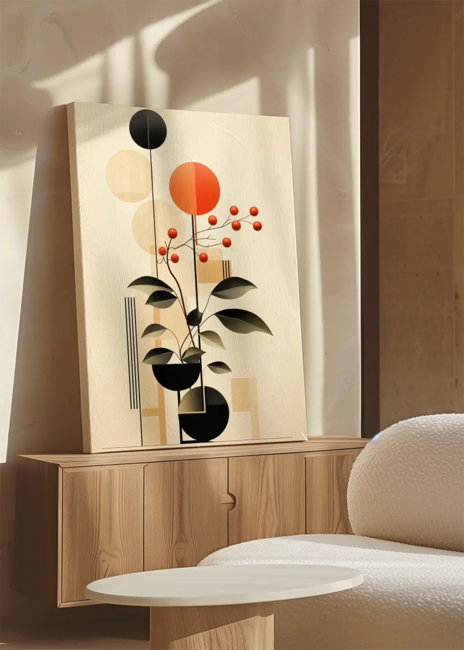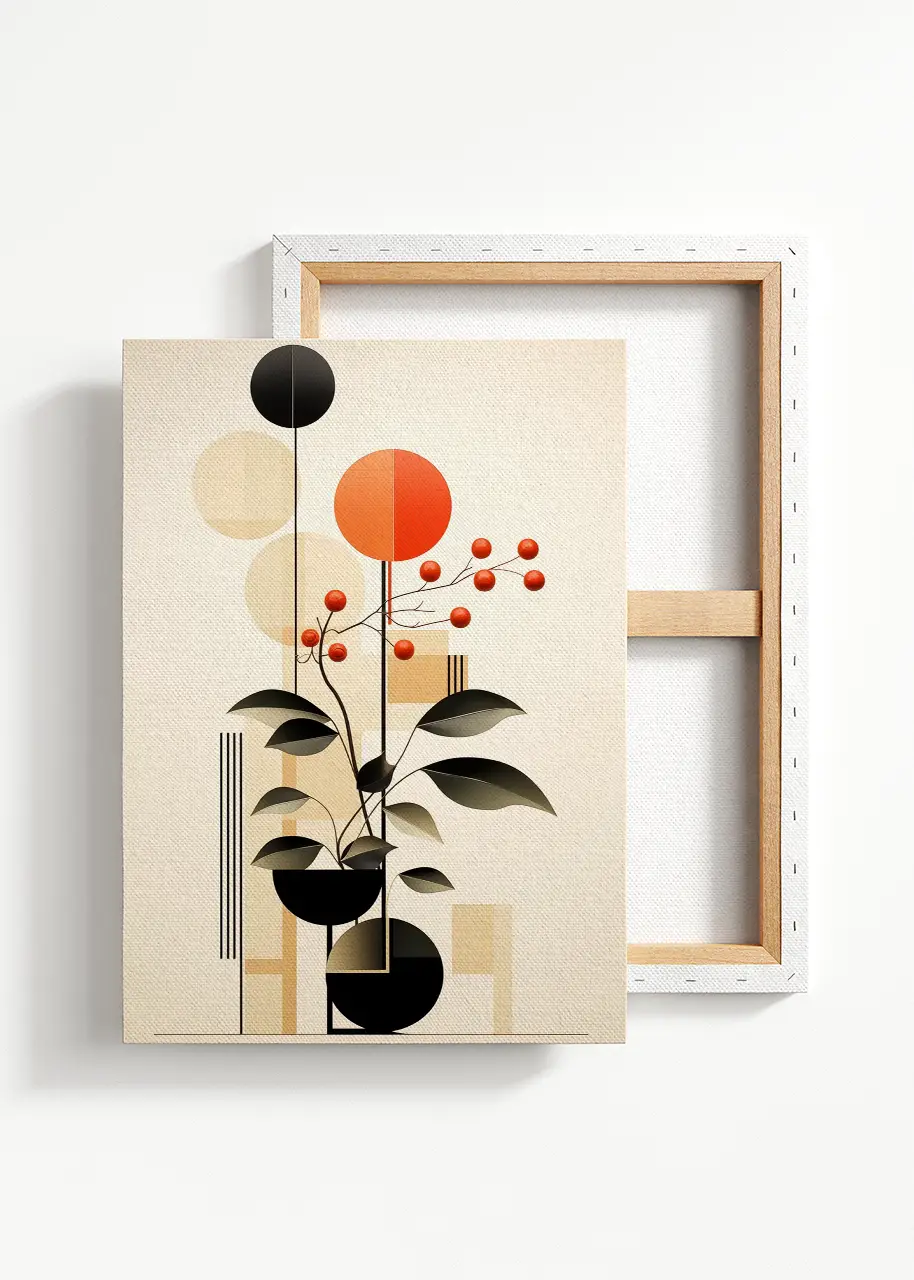 Kompozycja obrazu jest pionowa i zbudowana z kontrastujących elementów – delikatnych form roślinnych oraz wyrazistych figur geometrycznych. Taki układ tworzy równowagę między naturalnością a nowoczesnym designem.