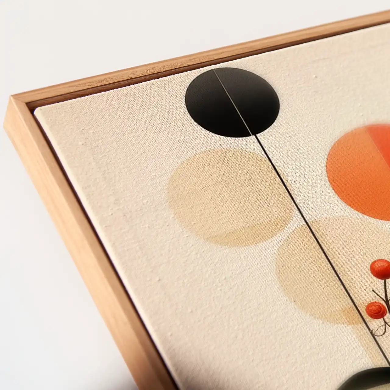 Kolorystyka obrazu opiera się na harmonijnym połączeniu beżowych i kremowych tonów z kontrastującymi akcentami czerni oraz intensywną pomarańczową formą. Taki zestaw barw wprowadza do wnętrza elegancję i nowoczesność.