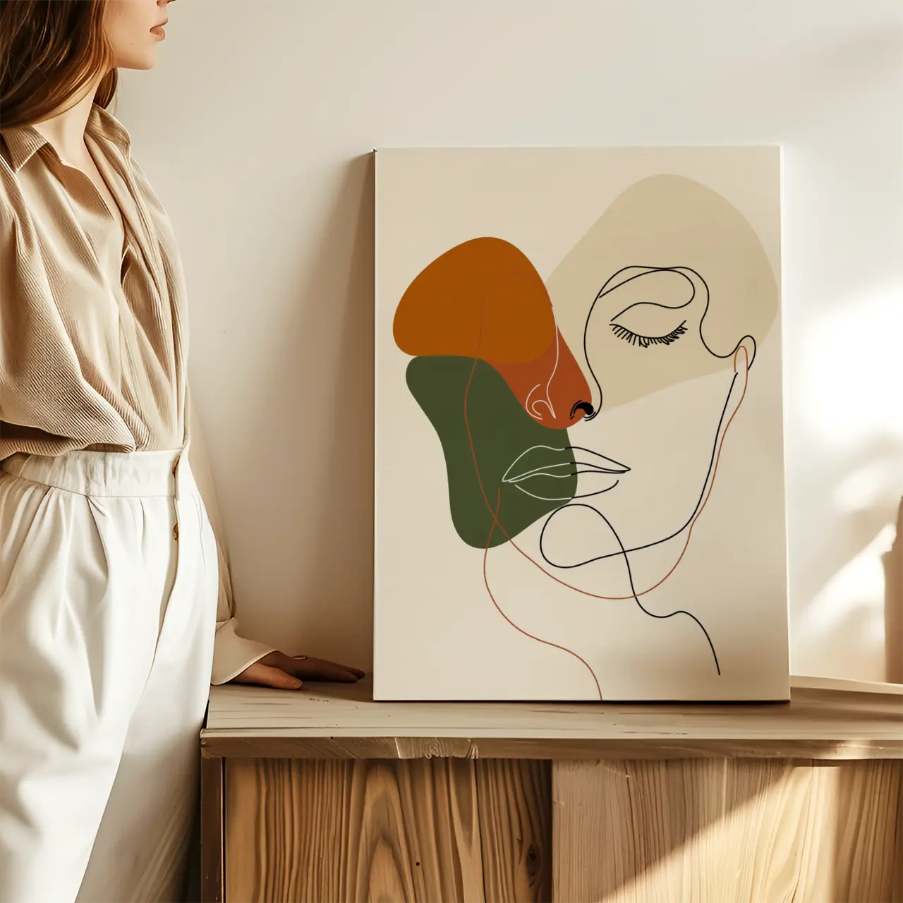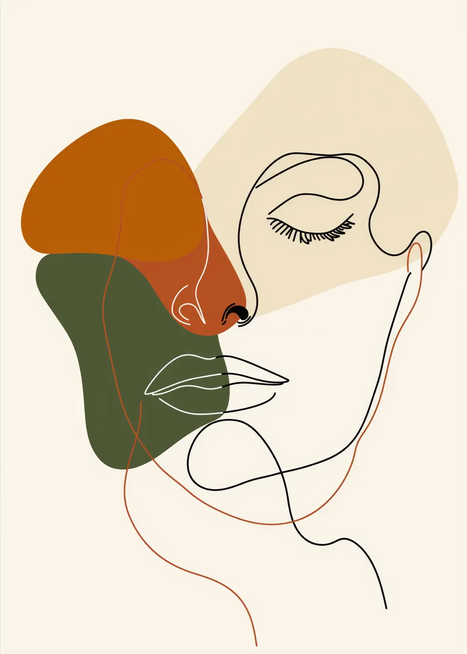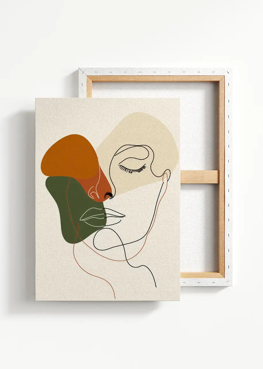 Obraz na płótnie „Twarz line art” przedstawia minimalistyczny portret kobiecej twarzy narysowany cienką, płynną linią. Delikatne kontury rysunku zostały zestawione z abstrakcyjnymi, miękkimi plamami kolorystycznymi w odcieniach beżu, ciepłej rdzy oraz przygaszonej zieleni.