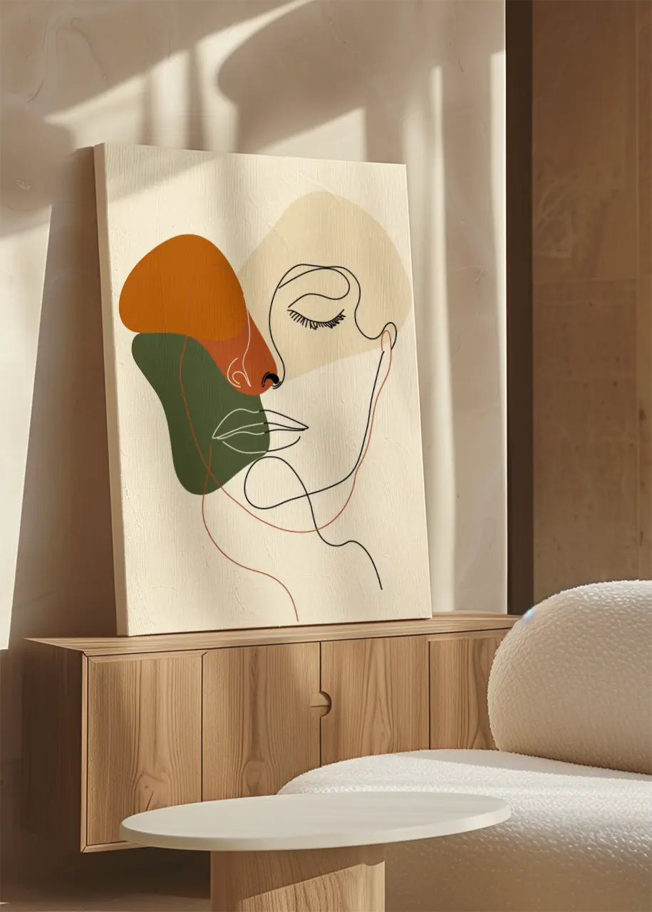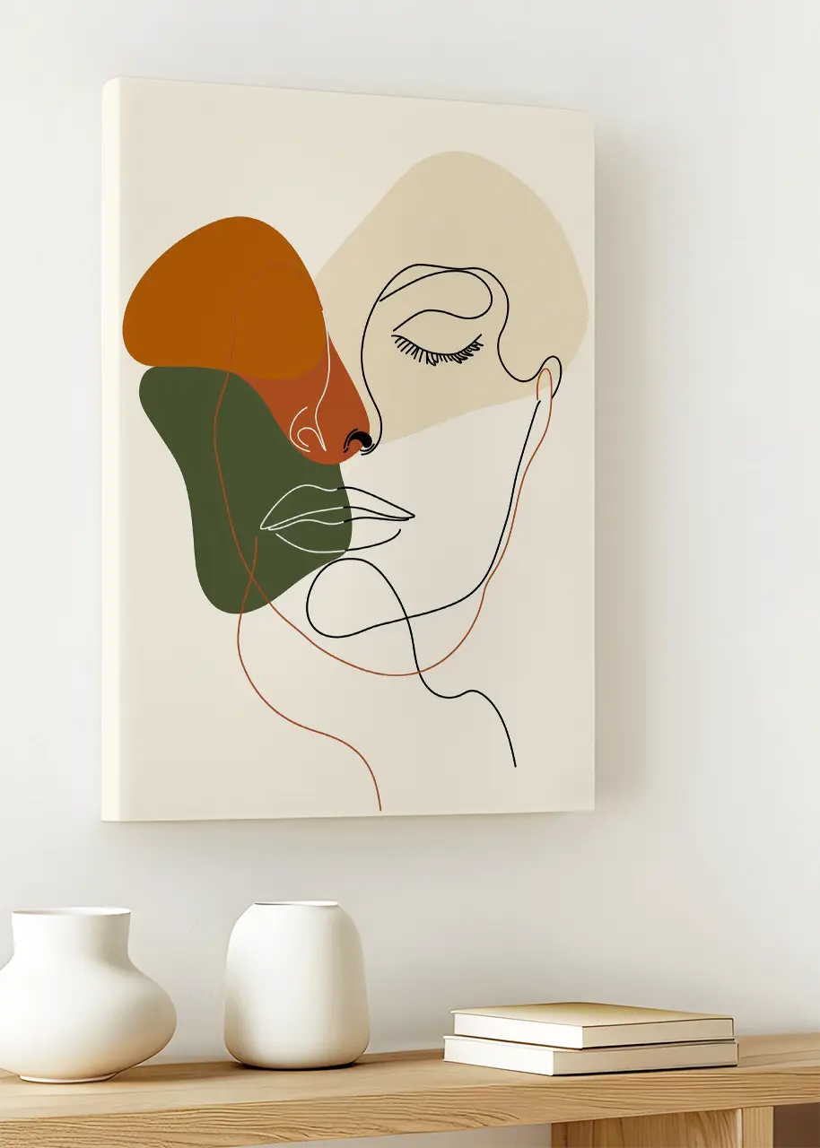 Obraz na płótnie „Twarz line art” łączy motyw portretu z minimalistyczną estetyką i subtelną abstrakcją kolorystyczną. Uniwersalna paleta barw i prosta forma sprawiają, że kompozycja pozostaje ponadczasowa.