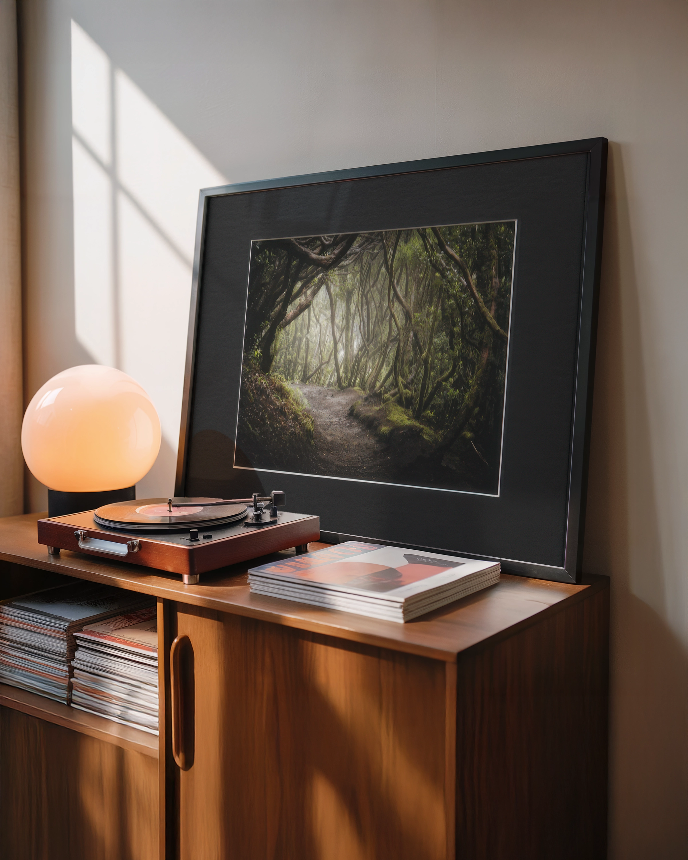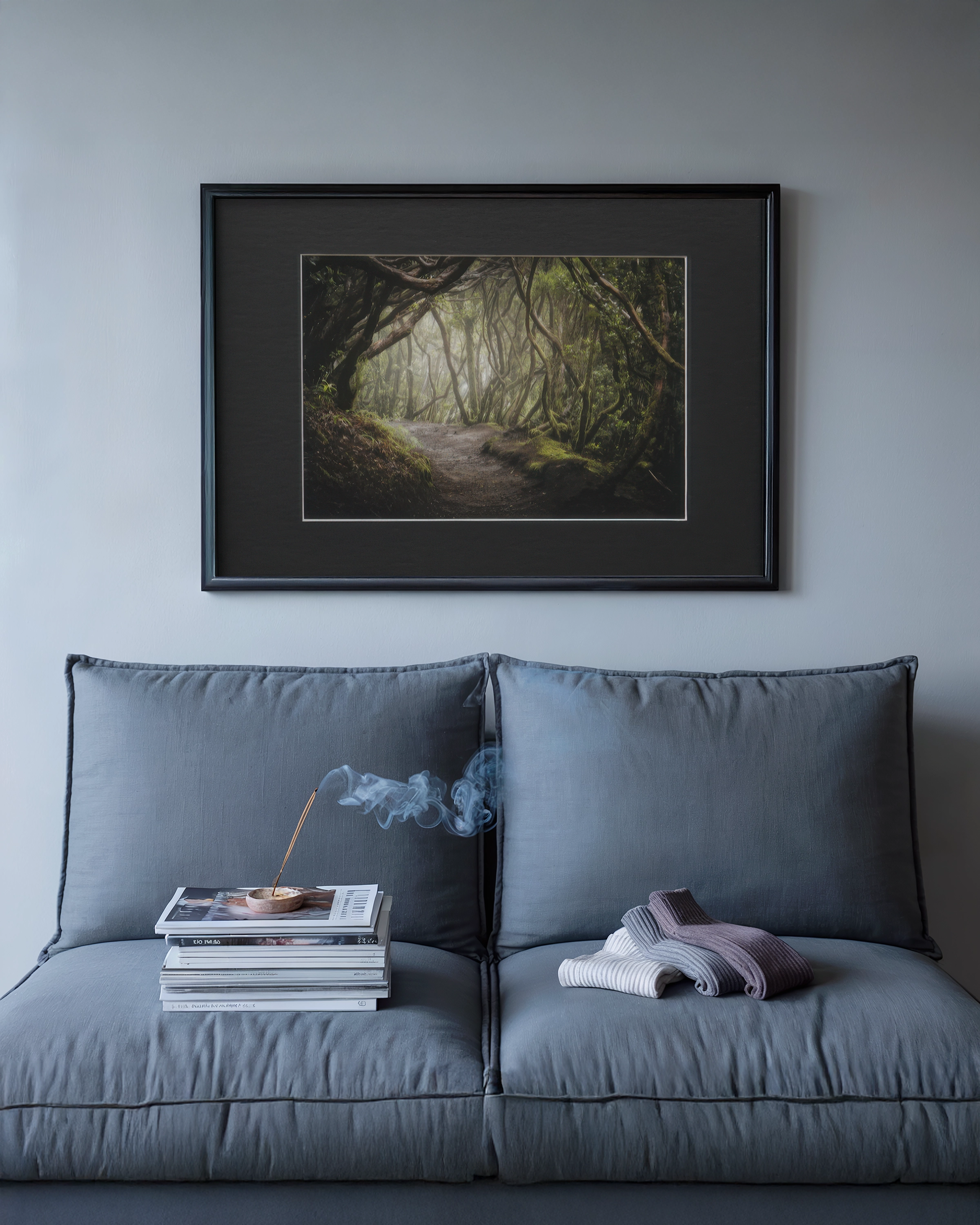 Wydruk na papierze Hahnemühle William Turner 190 g/m² podkreśla każdy detal, a czarne passe-partout (1,5 mm) i rama z drewna Ayous dopełniają całość elegancją.