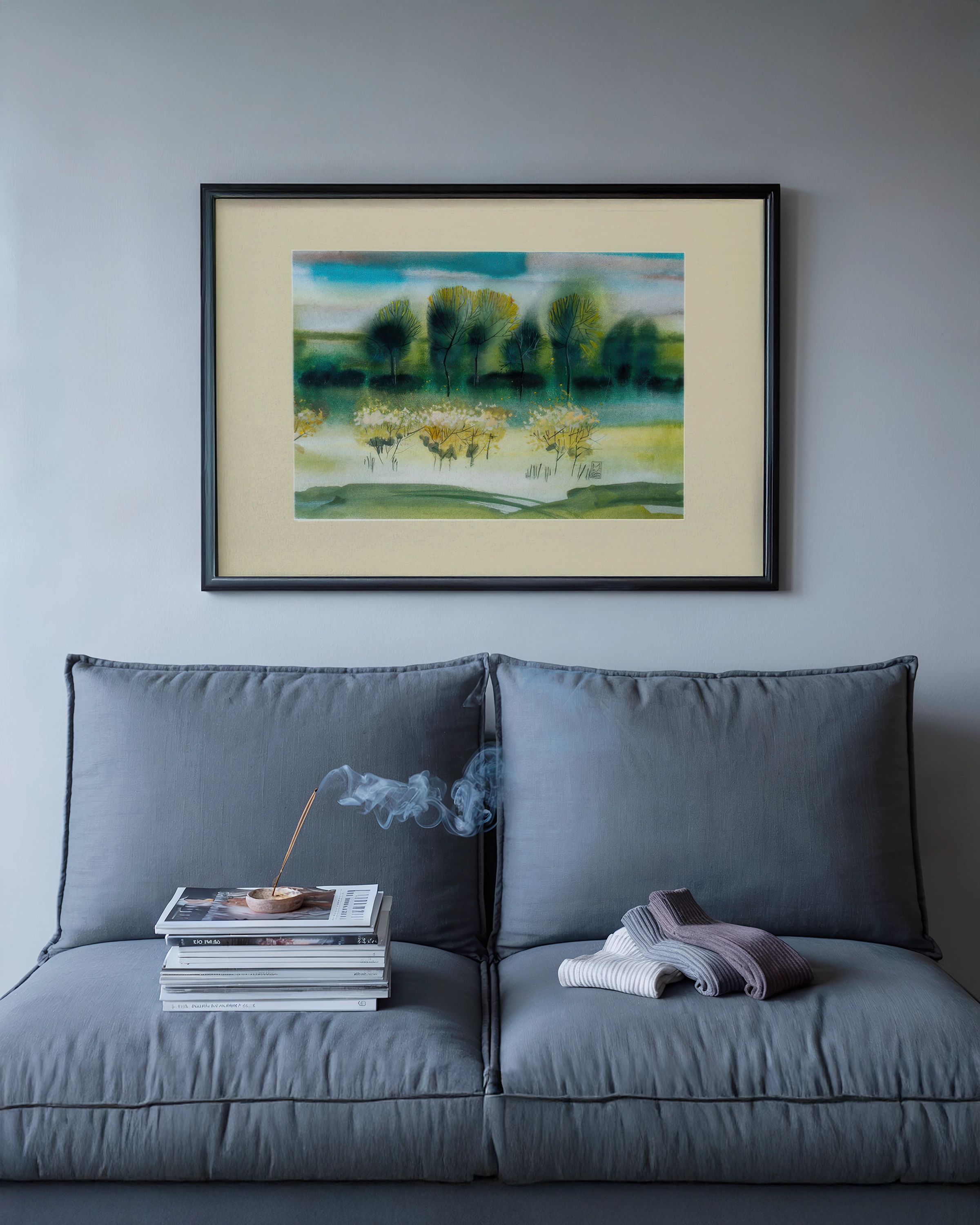 Obraz w ramie „Pejzaż Zieleni” to połączenie spokoju, natury i elegancji. Subtelne przejścia kolorów – od głębokiej zieleni po błękitne niebo – wprowadzają do wnętrza harmonię i lekkość.