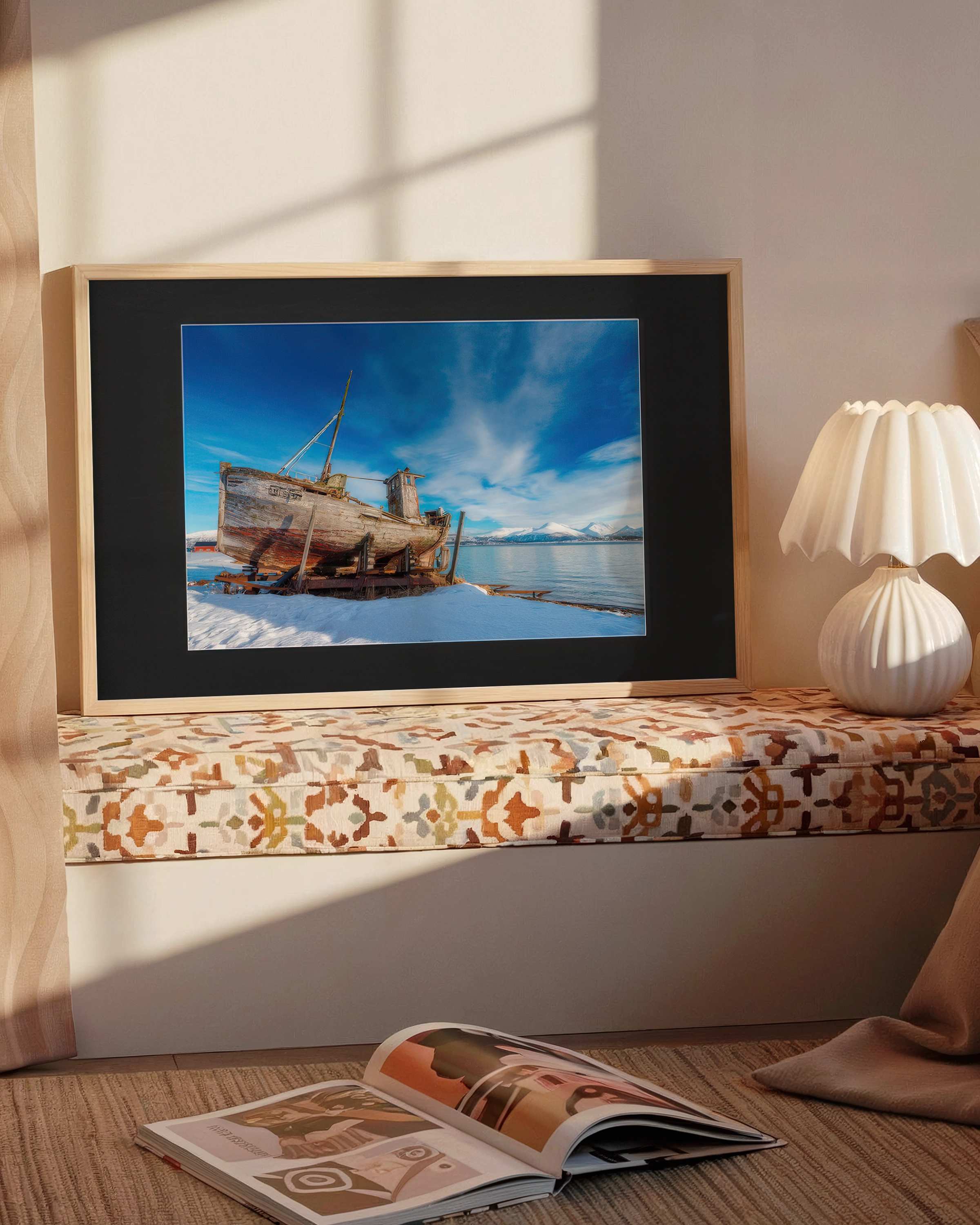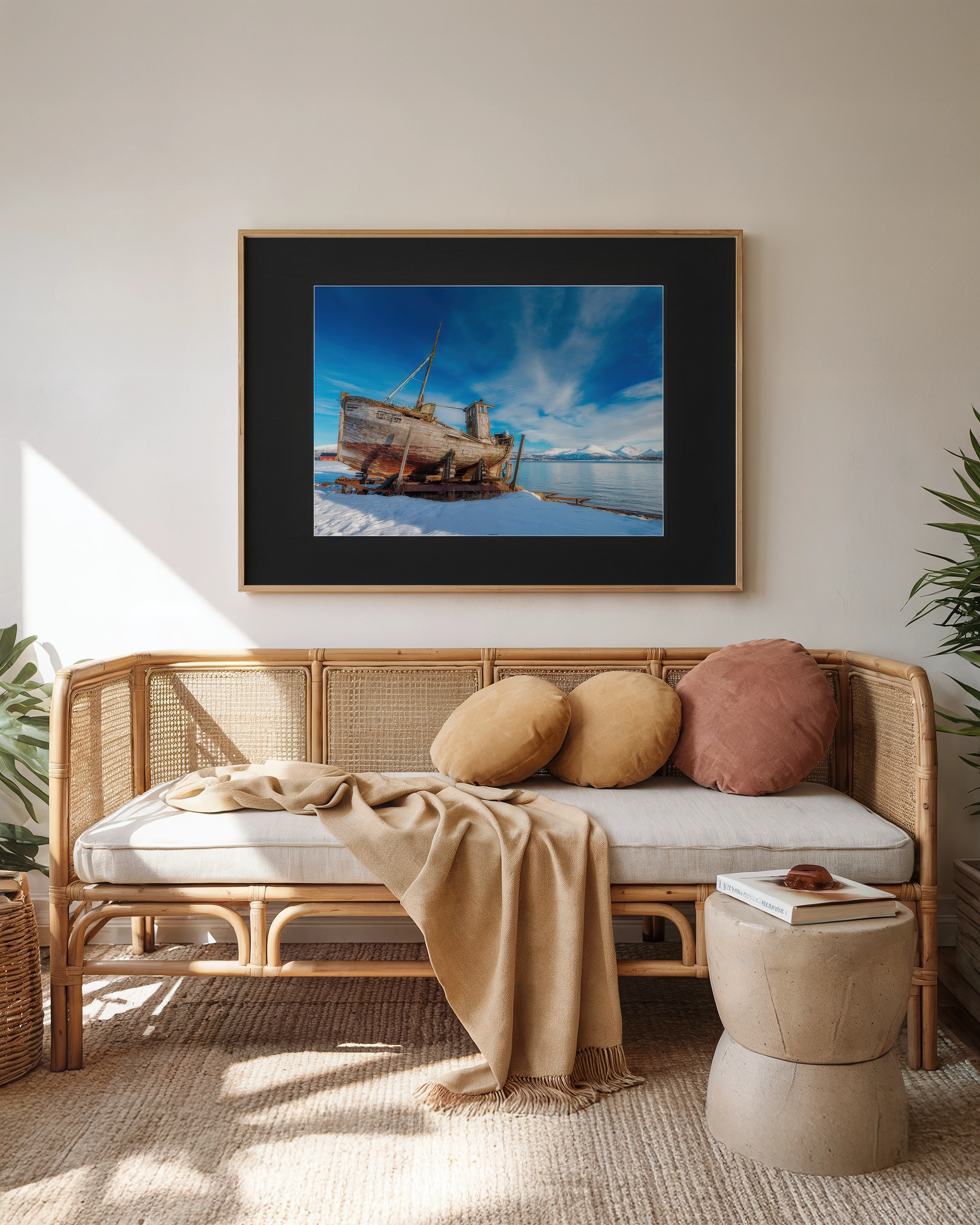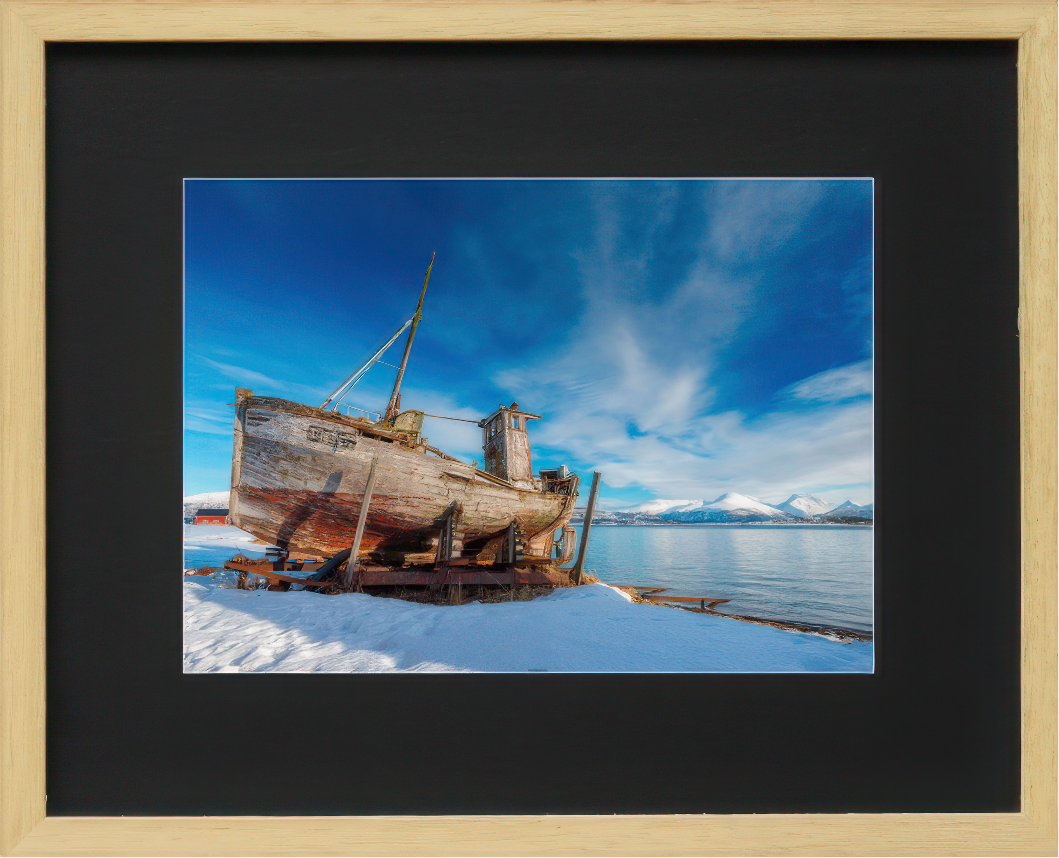Czarne passe-partout (1,5 mm) nadaje głębi, a rama z drewna Ayous w naturalnym kolorze stanowi eleganckie wykończenie.