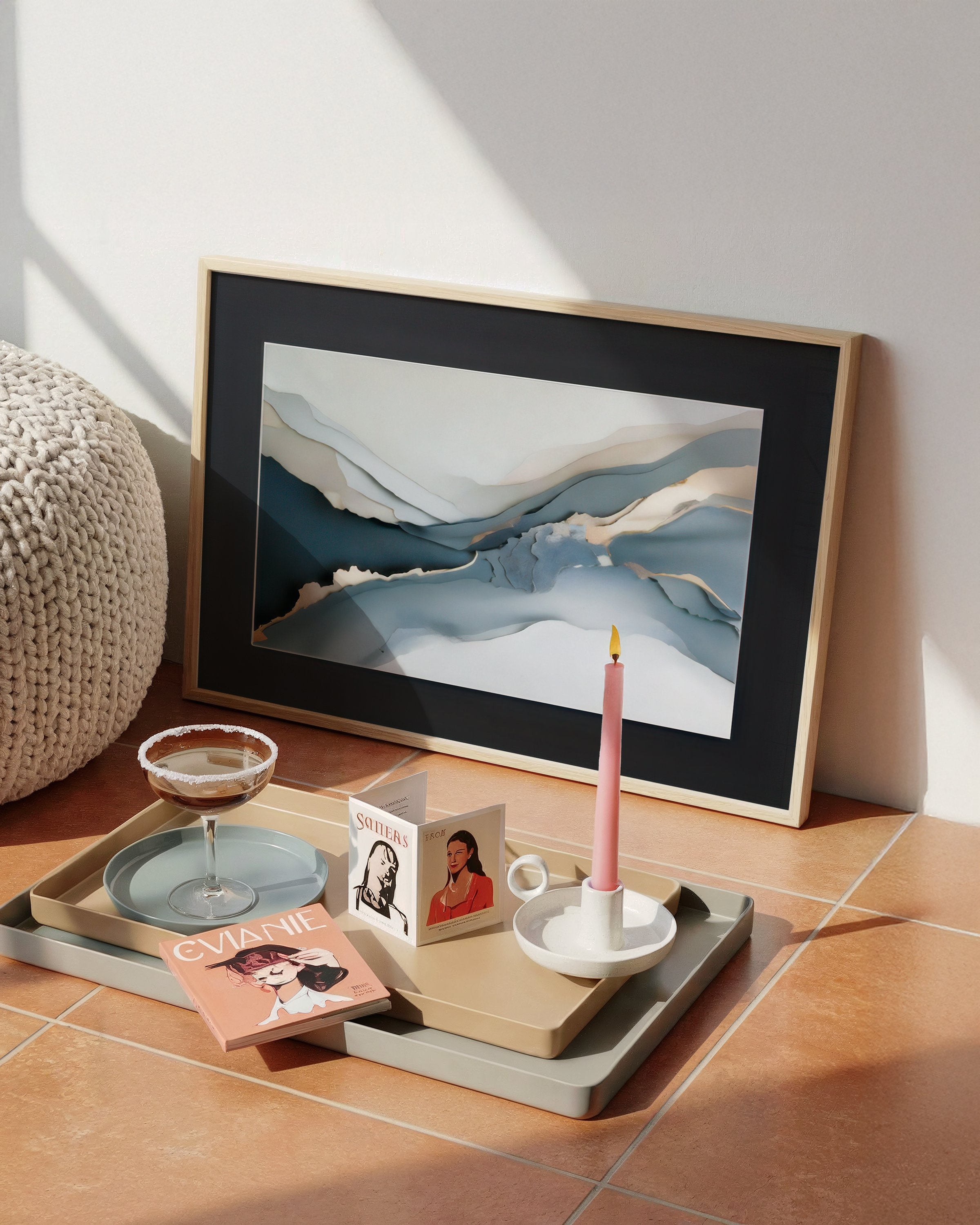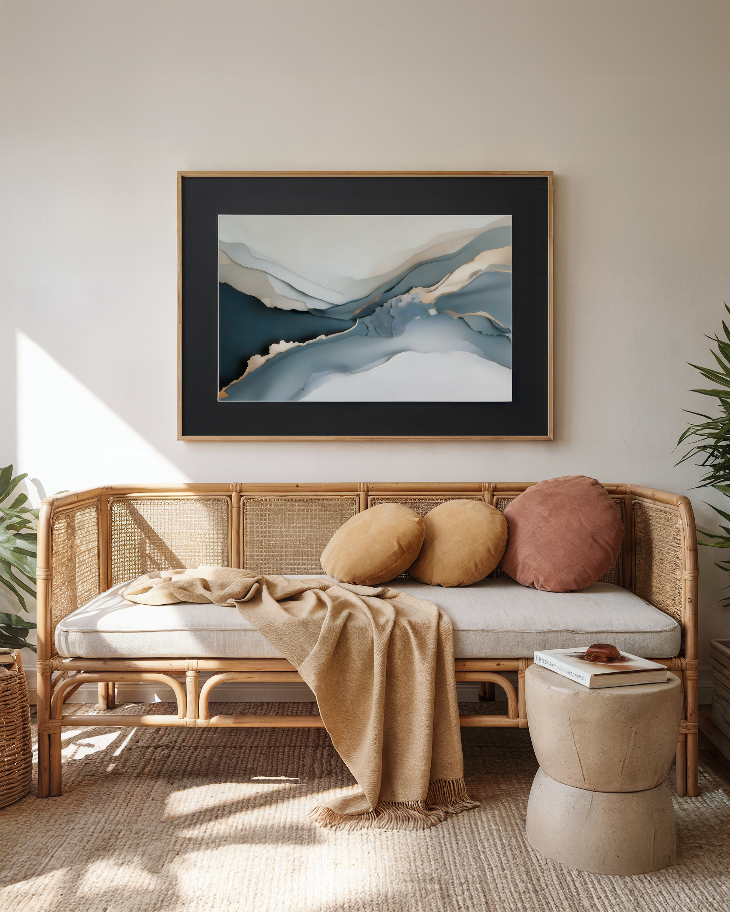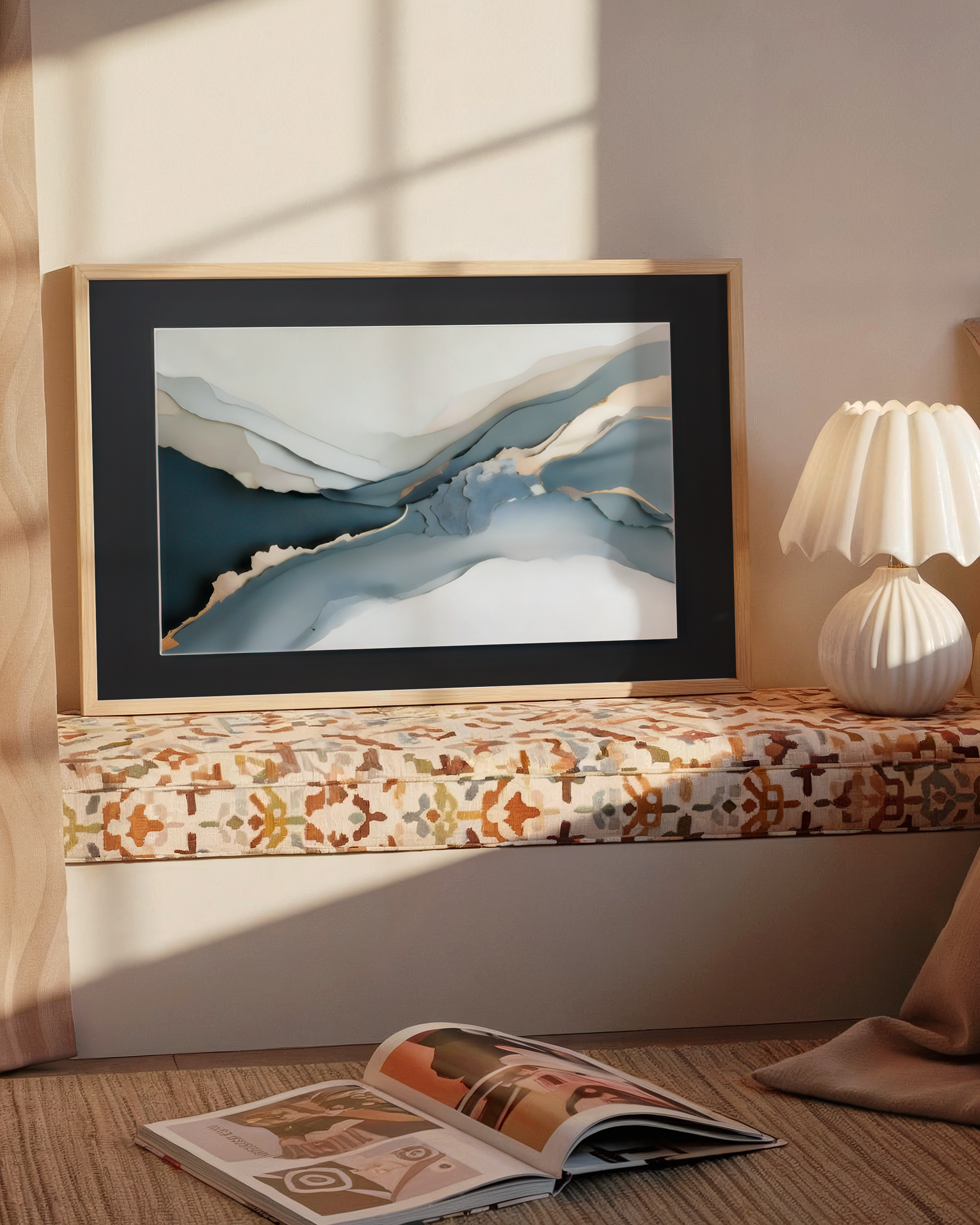 Wydruk na papierze Hahnemühle William Turner 190 g/m² zapewnia wyjątkową głębię kolorów i wyczuwalną fakturę przypominającą malarstwo akwarelowe. Całość oprawiono w ramę z drewna Ayous w naturalnym kolorze oraz czarne passe-partout (1,5 mm), co nadaje kompozycji wyrazistego kontrastu i elegancji.