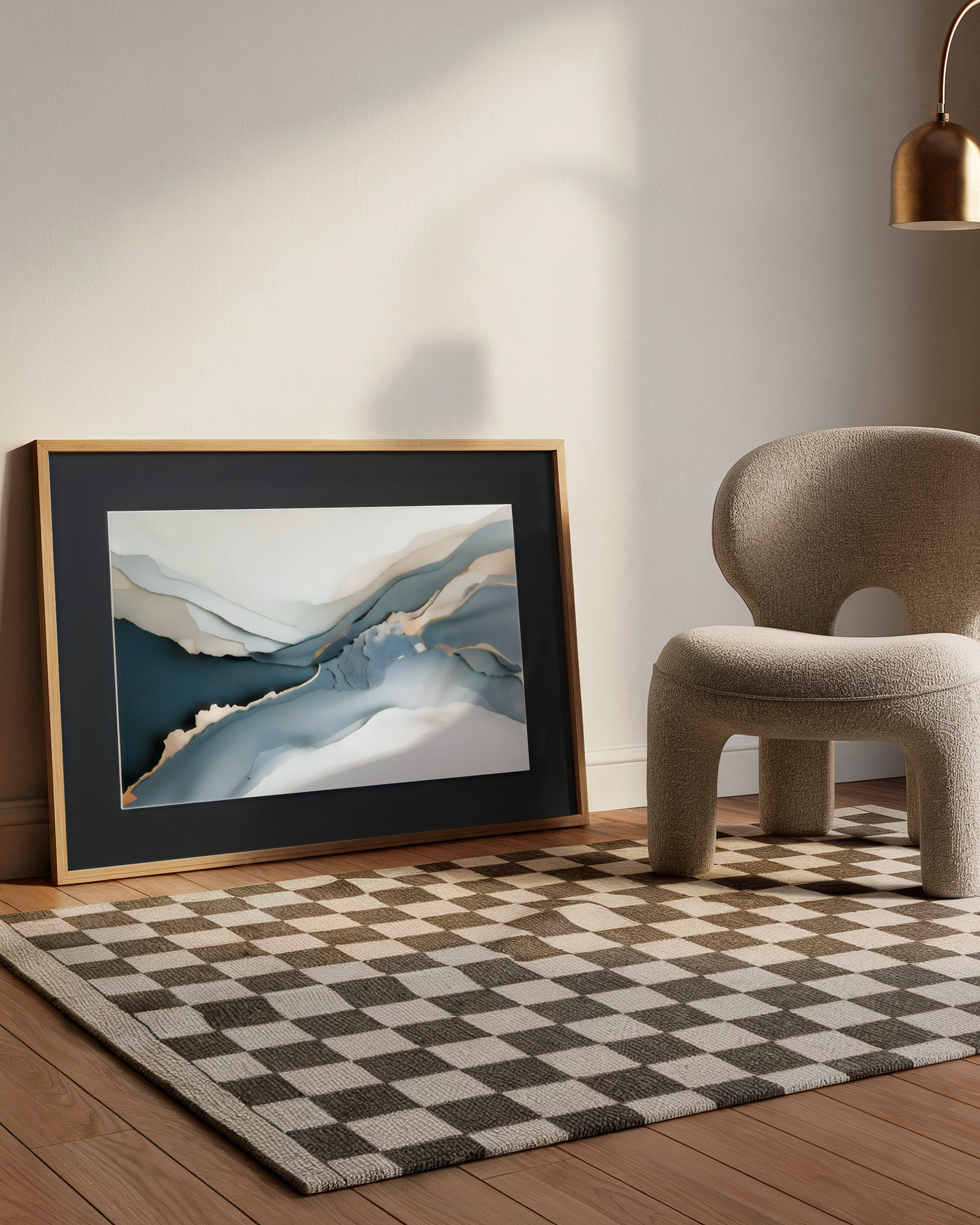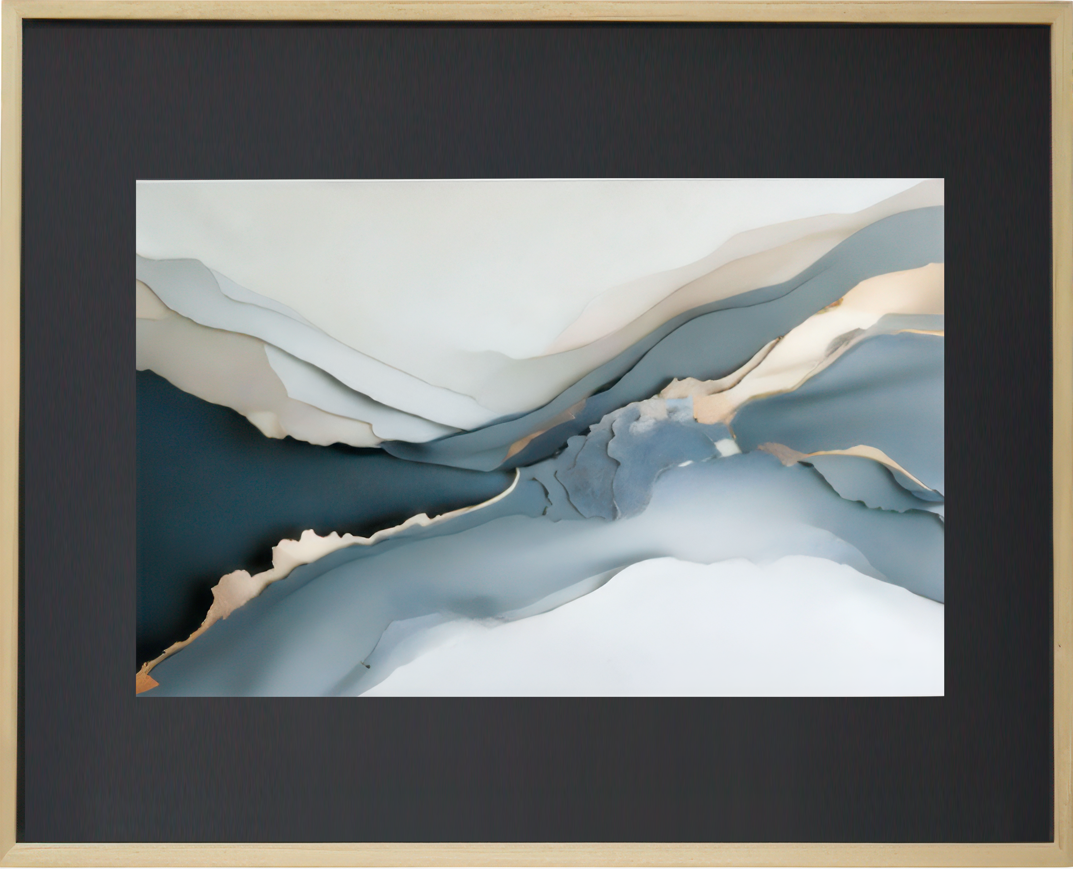 Obraz „Abstrakcyjna Przestrzeń” łączy nowoczesną estetykę z delikatną harmonią barw. Kompozycja w tonacjach niebiesko-szarych i kremowych przywodzi na myśl krajobraz widziany z lotu ptaka lub spokojne pasma gór w mglistym świetle.