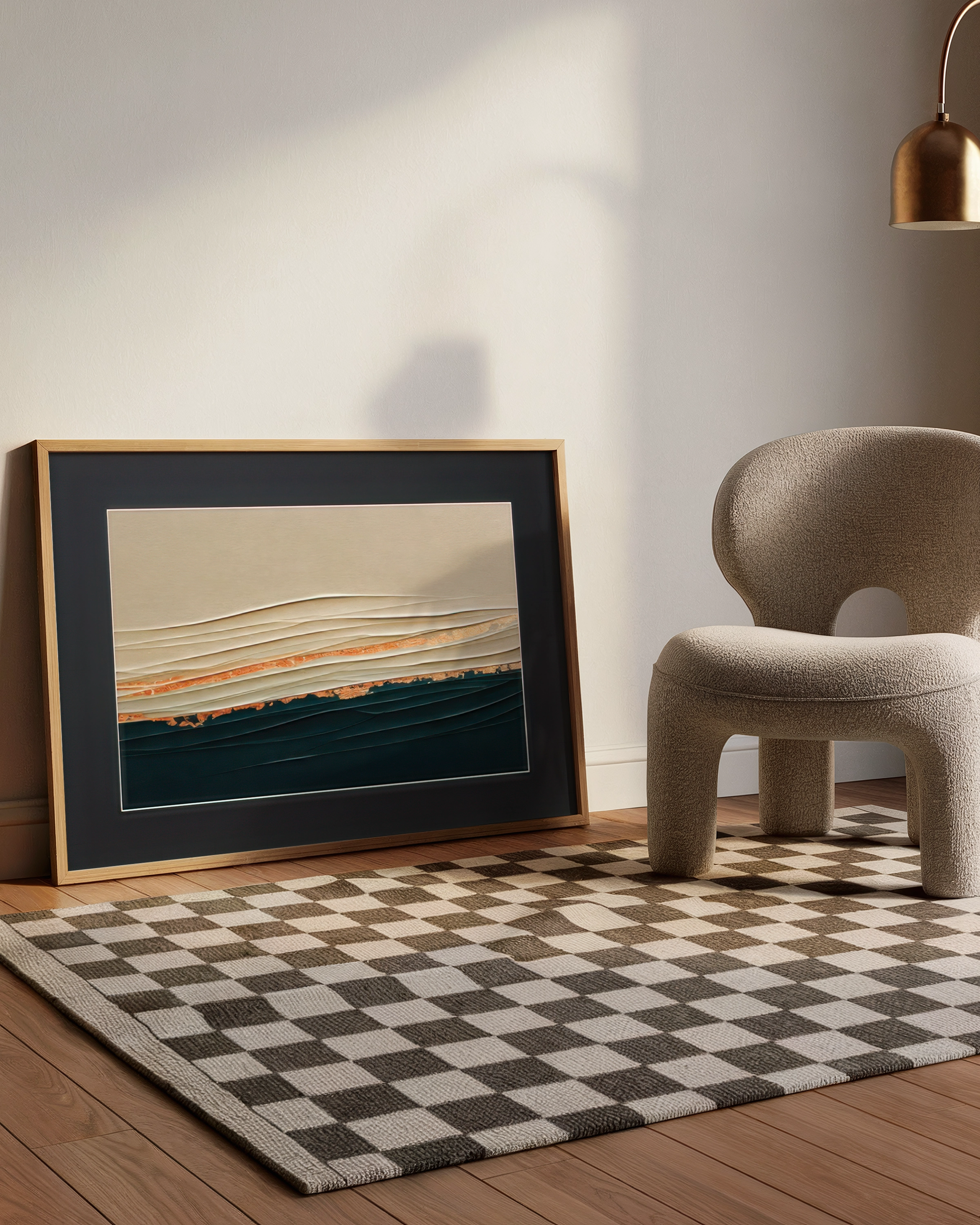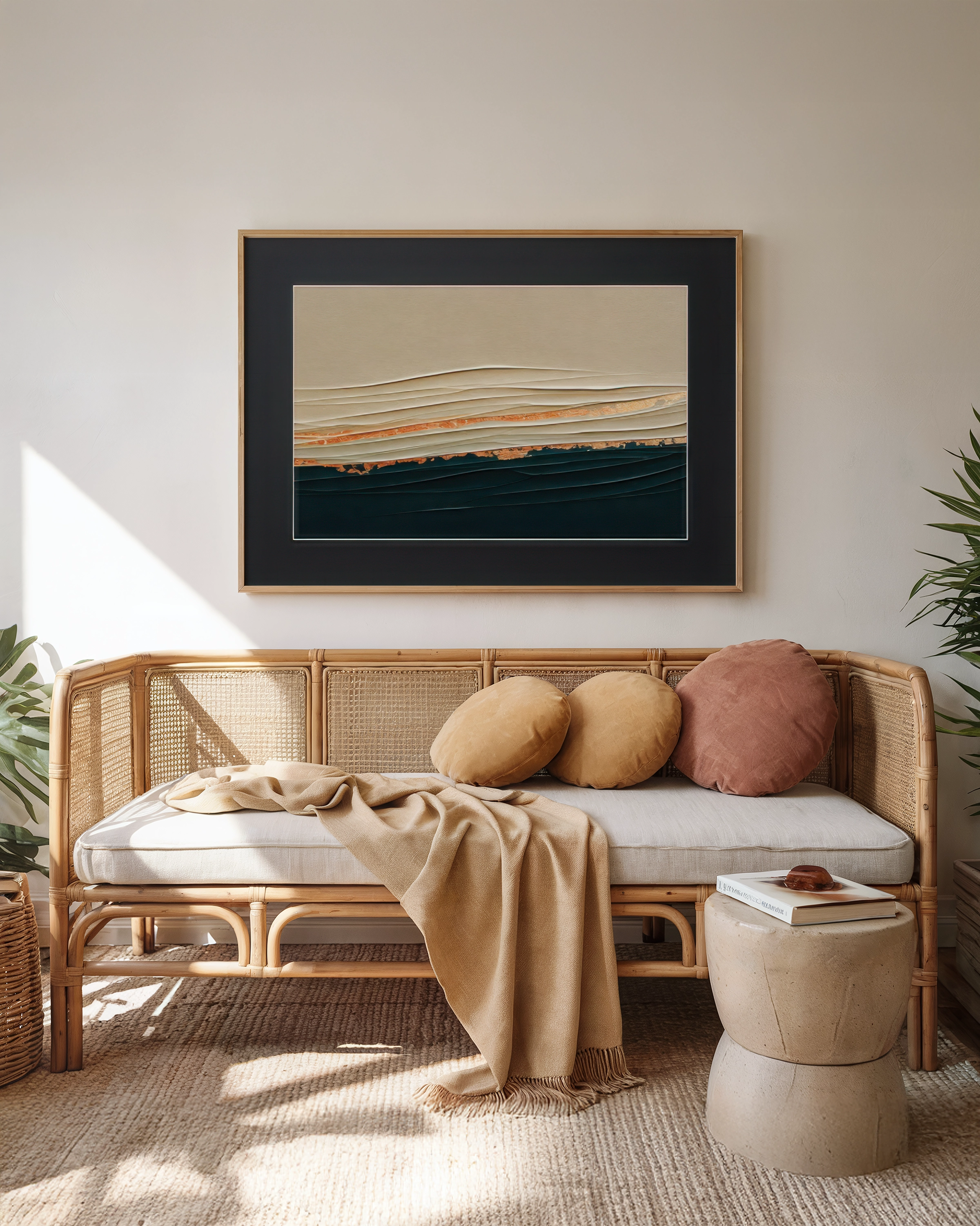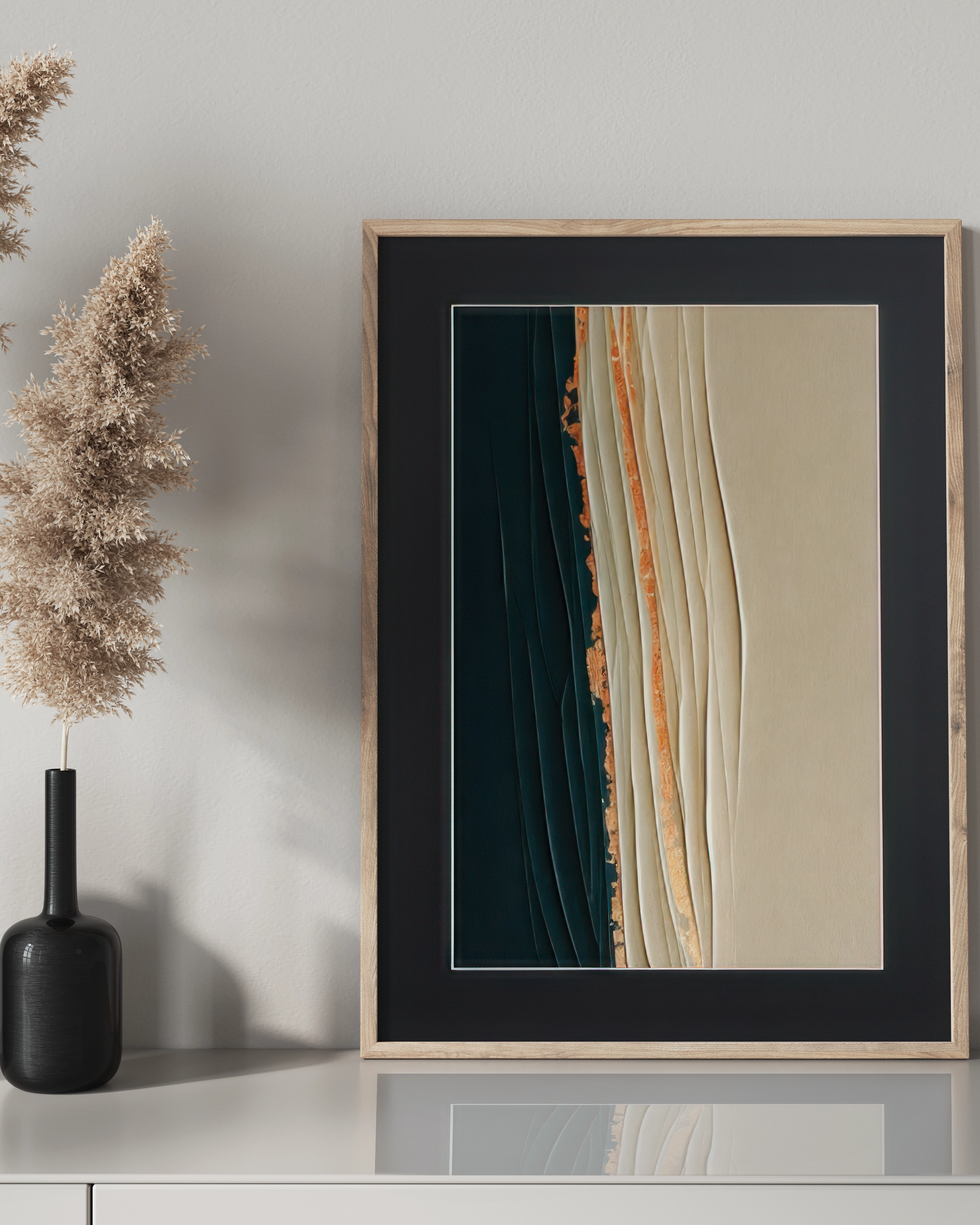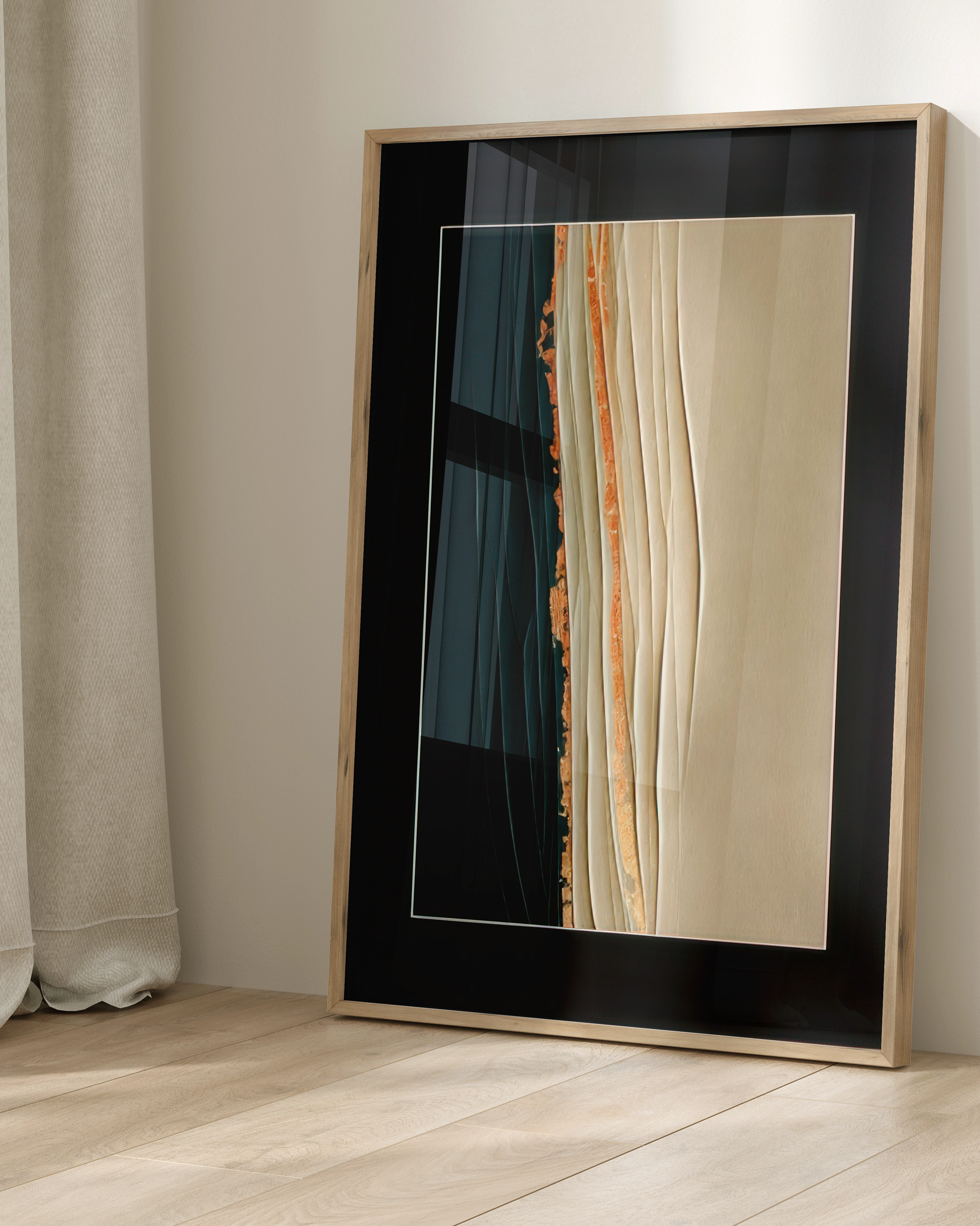 Wydruk wykonano na papierze Hahnemühle William Turner 190 g/m², który wiernie oddaje strukturę oryginalnego dzieła i zapewnia trwałość kolorów. Obraz został oprawiony w naturalną ramę z drewna Ayous z czarnym passe-partout (1,5 mm) – eleganckie zestawienie idealne do wnętrz nowoczesnych, skandynawskich i minimalistycznych.