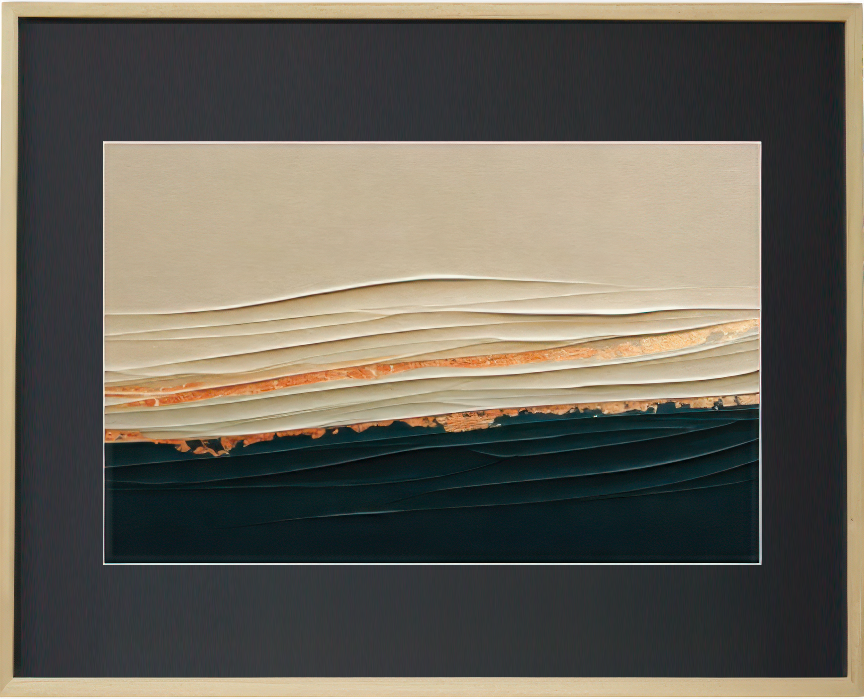 Obraz „Złoty Horyzont” w rozmiarze 57x42 cm to wyjątkowa dekoracja, która łączy w sobie harmonię barw i minimalistyczną formę. Subtelne, warstwowe przejścia tonów od piaskowych beżów po głęboki granat budują spokojną, niemal medytacyjną przestrzeń. Złota linia rozdzielająca kompozycję dodaje pracy blasku i głębi.