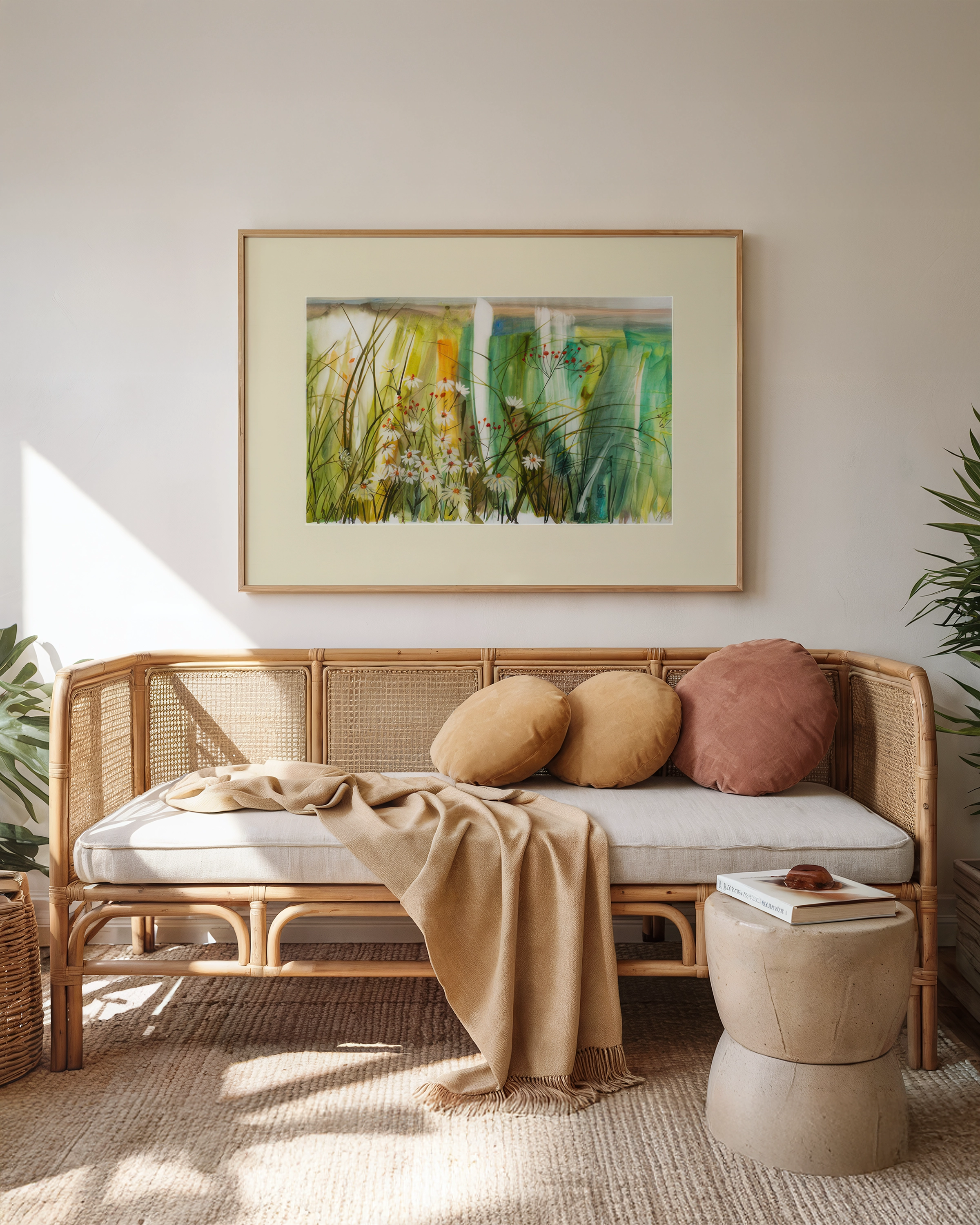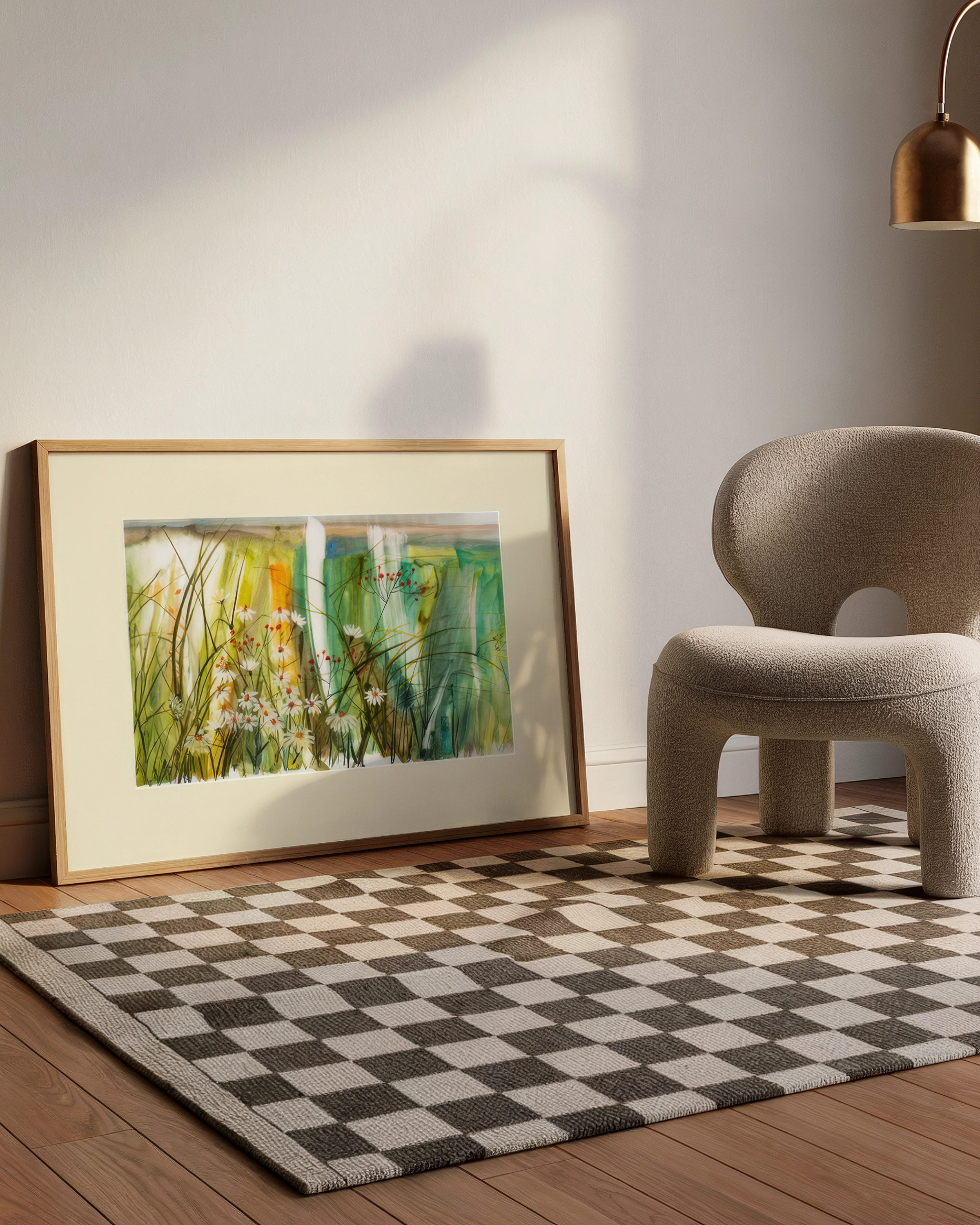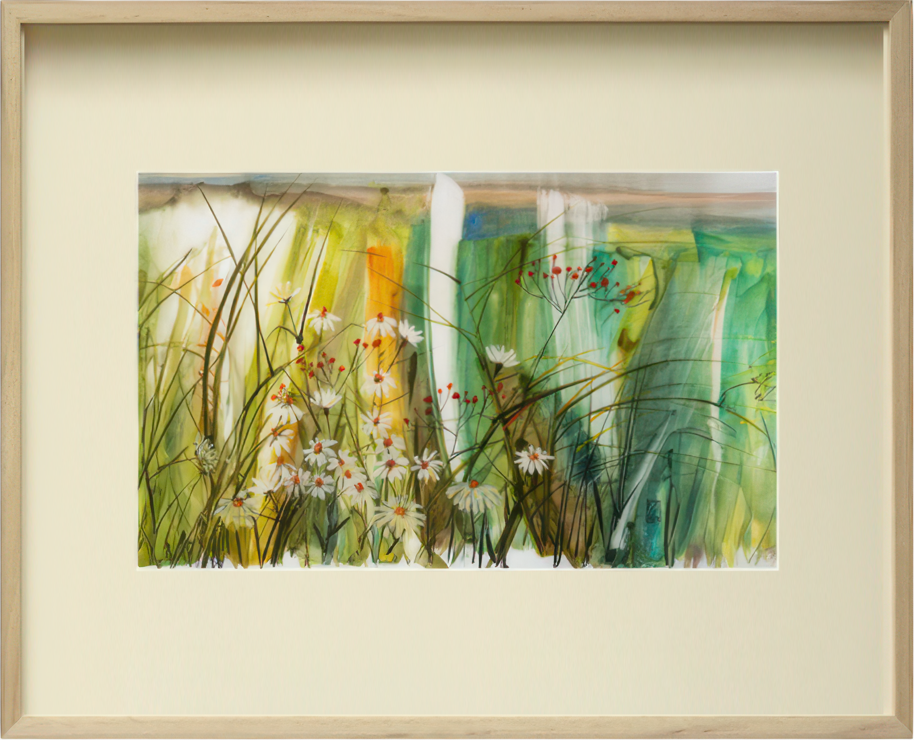 Obraz „Polne Kwiaty” w formacie 72x52 cm to subtelny pejzaż inspirowany letnią łąką. Akwarelowa technika oddaje lekkość traw i kwiatów, które zdają się poruszać na wietrze.