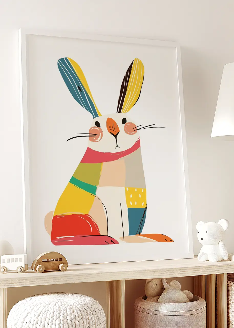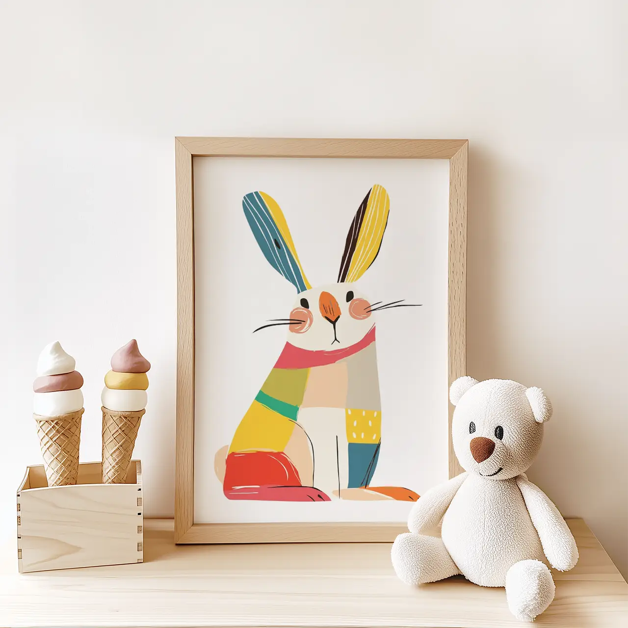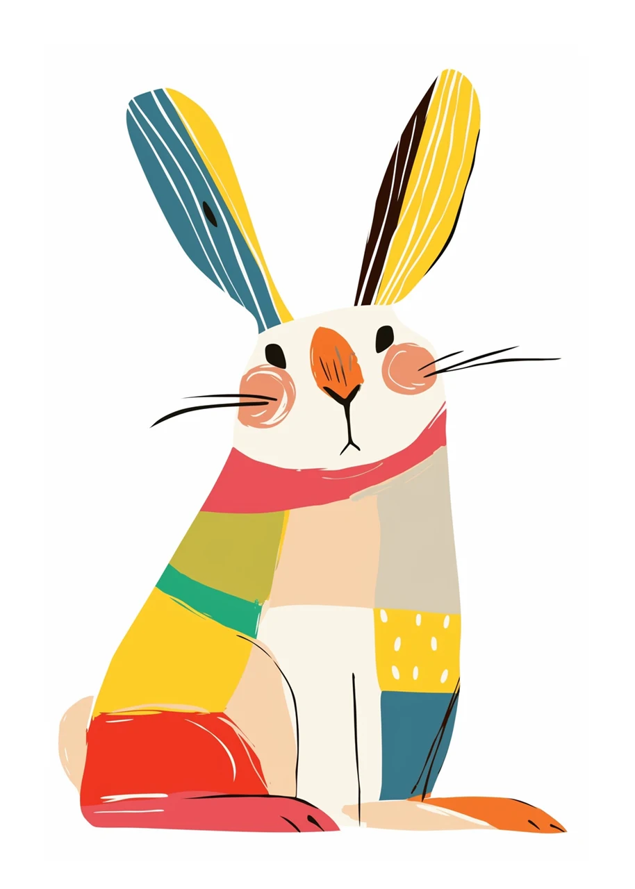 Plakat „Abstra-zając I” przedstawia uproszczoną sylwetkę zająca zbudowaną z wyraźnych, miękkich kształtów i bloków kolorystycznych. Kompozycja opiera się na kontrastach pomiędzy jasnym tłem a wielobarwną strukturą postaci, gdzie każda część ciała została podkreślona innym odcieniem. Delikatne linie konturu oraz subtelne detale – takie jak wąsy czy rysy pyska – nadają ilustracji lekkości i charakteru.