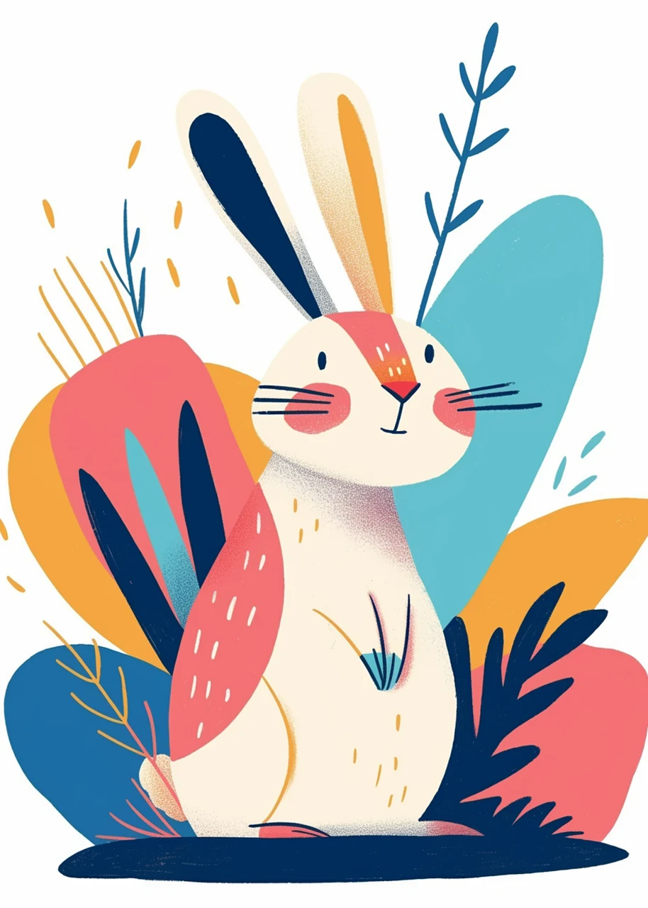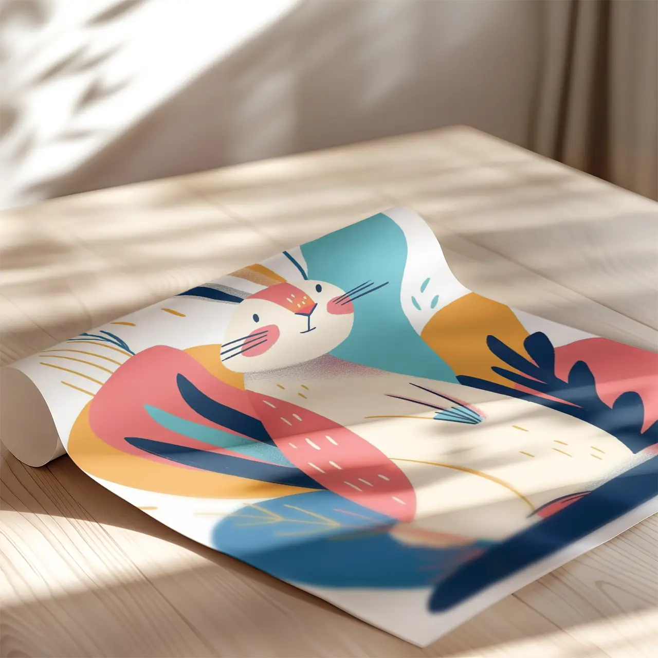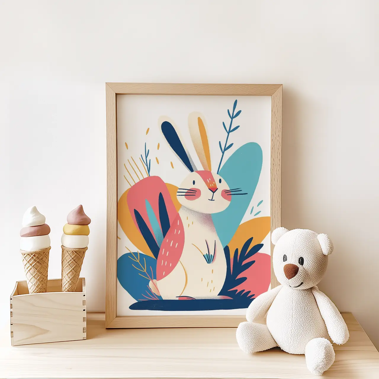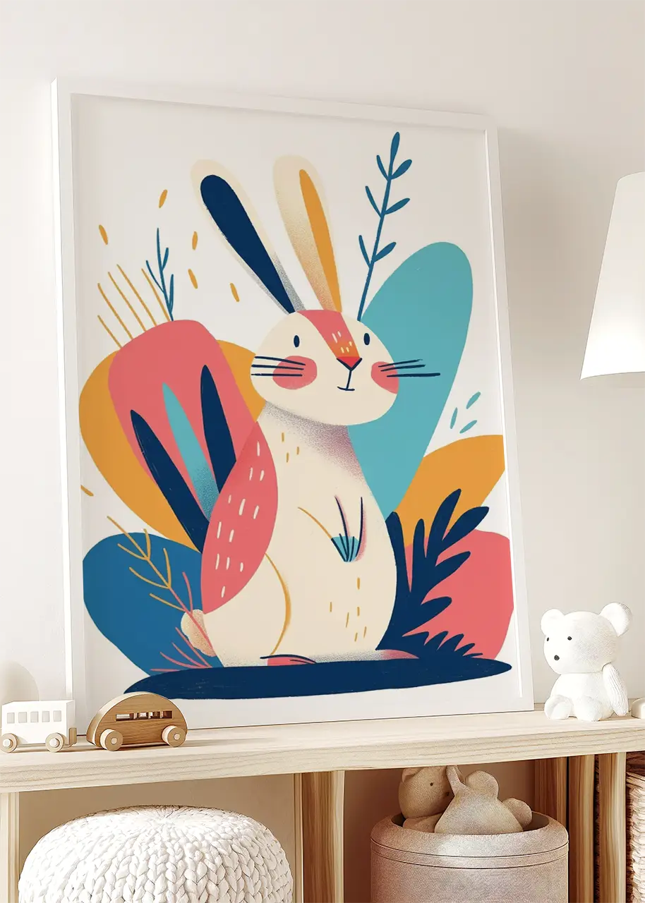 Nowoczesny plakat o wyjątkowo pogodnym charakterze, przedstawiający uroczą sylwetkę zająca w oryginalnej, abstrakcyjnej formie. Kompozycja przyciąga uwagę żywą kolorystyką, przypominającą artystyczny patchwork, pełną różnorodnych wzorów i barwnych geometrycznych plam. Radosne, ciepłe kolory w połączeniu z minimalistycznymi, graficznymi liniami sprawiają, że obraz emanuje pozytywną energią oraz lekkością. Dzięki swobodnej stylistyce ten dekoracyjny plakat świetnie sprawdzi się zarówno w pokoju dziecięcym, jak i w innych wnętrzach, wprowadzając do każdej przestrzeni świeżość i humor.