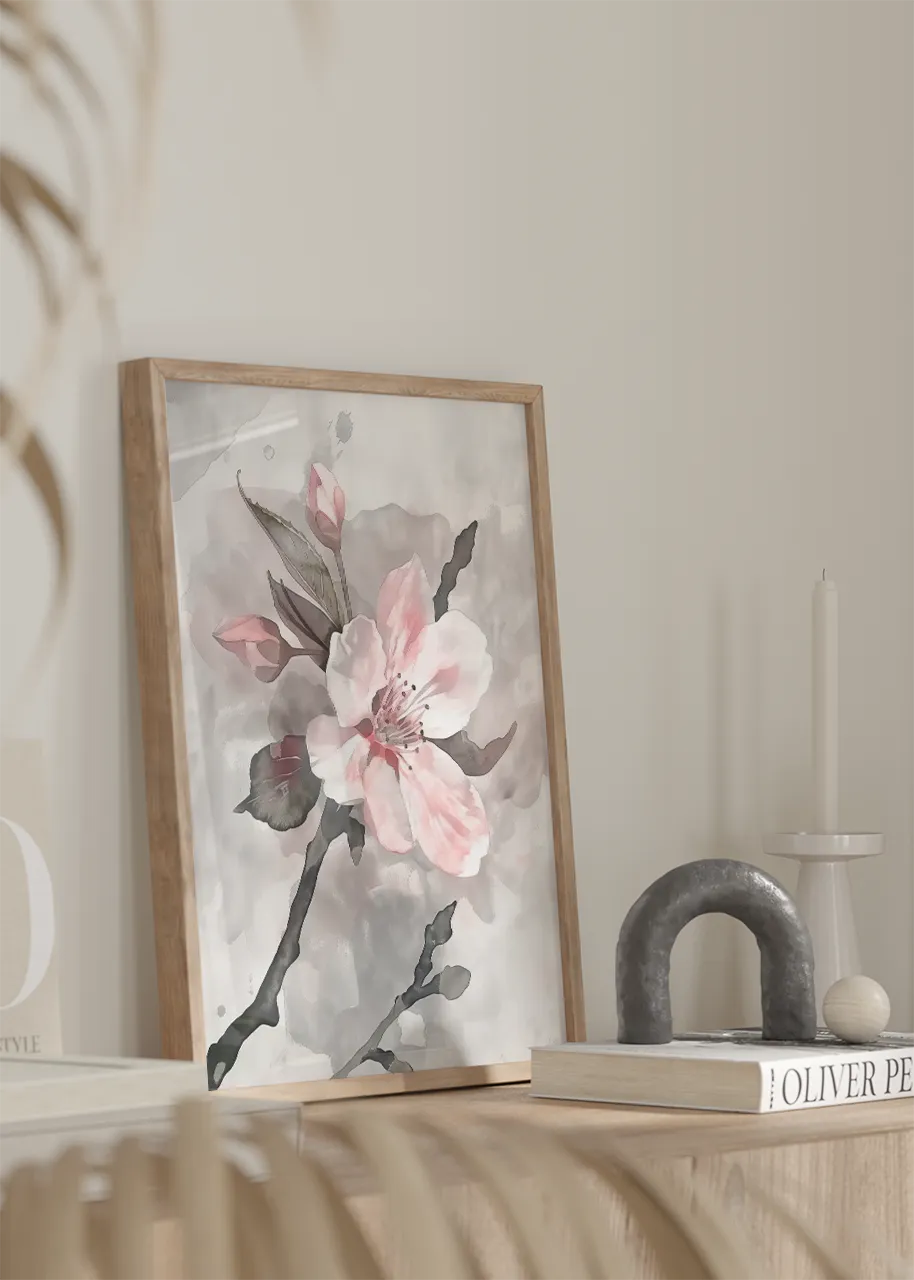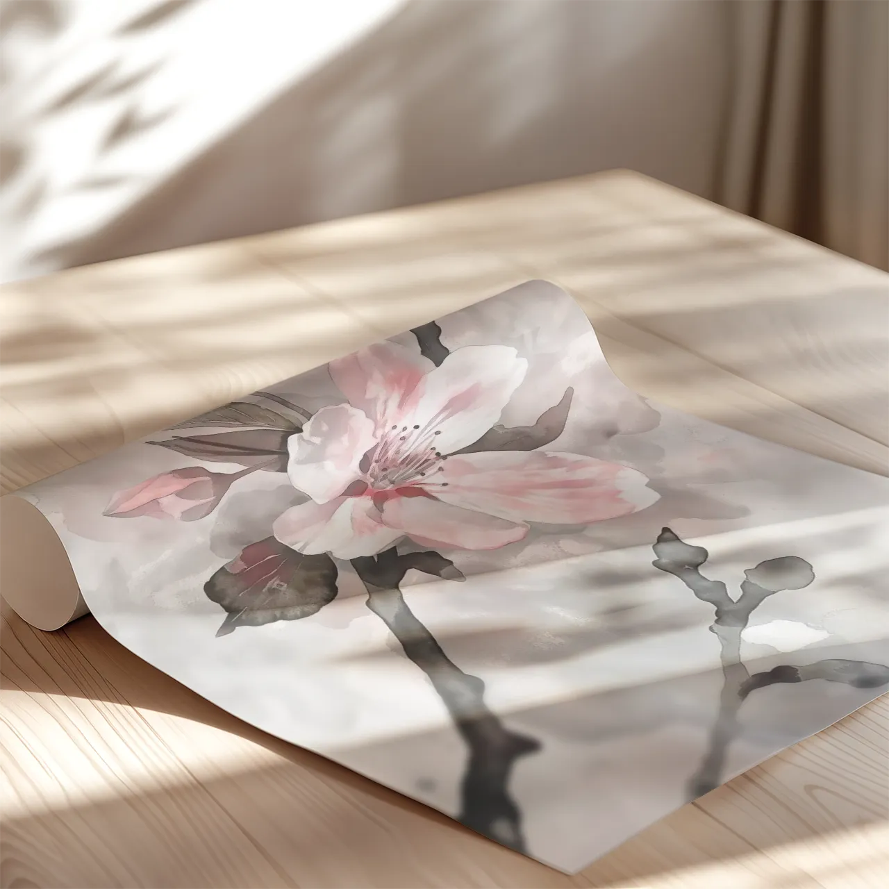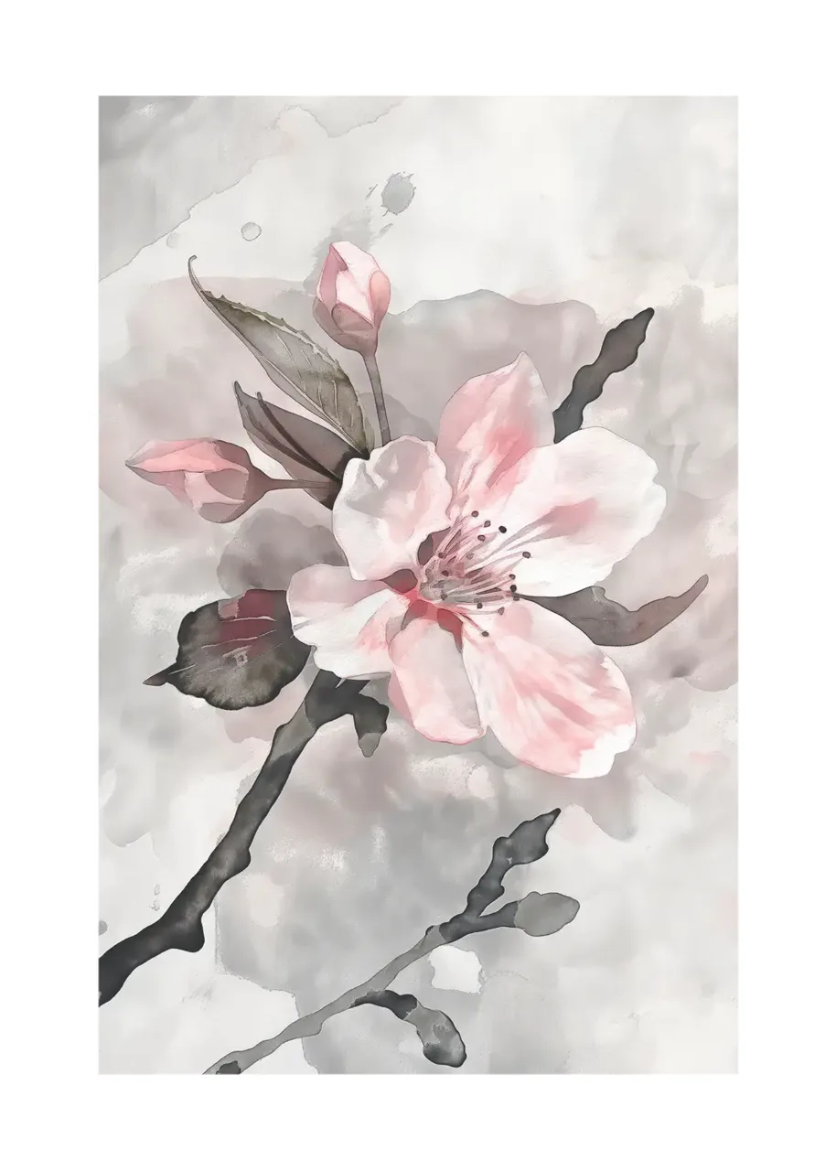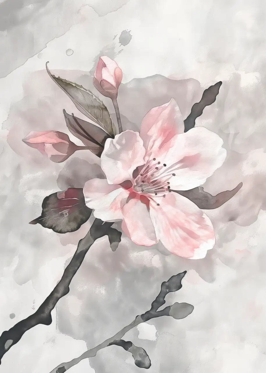 Centralnym motywem jest pojedynczy kwiat na cienkiej gałęzi, ukazany w lekkim, malarskim ujęciu. Płatki są miękkie i nieregularne, a ich forma subtelnie przenika się z tłem, tworząc wrażenie naturalnej lekkości.