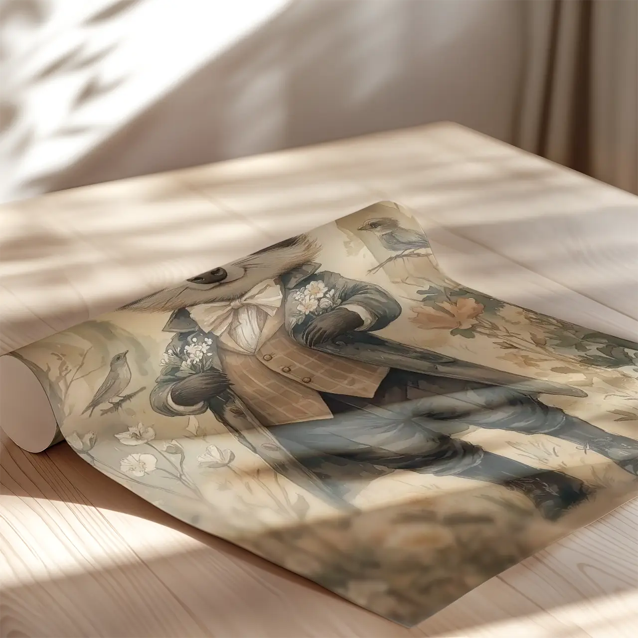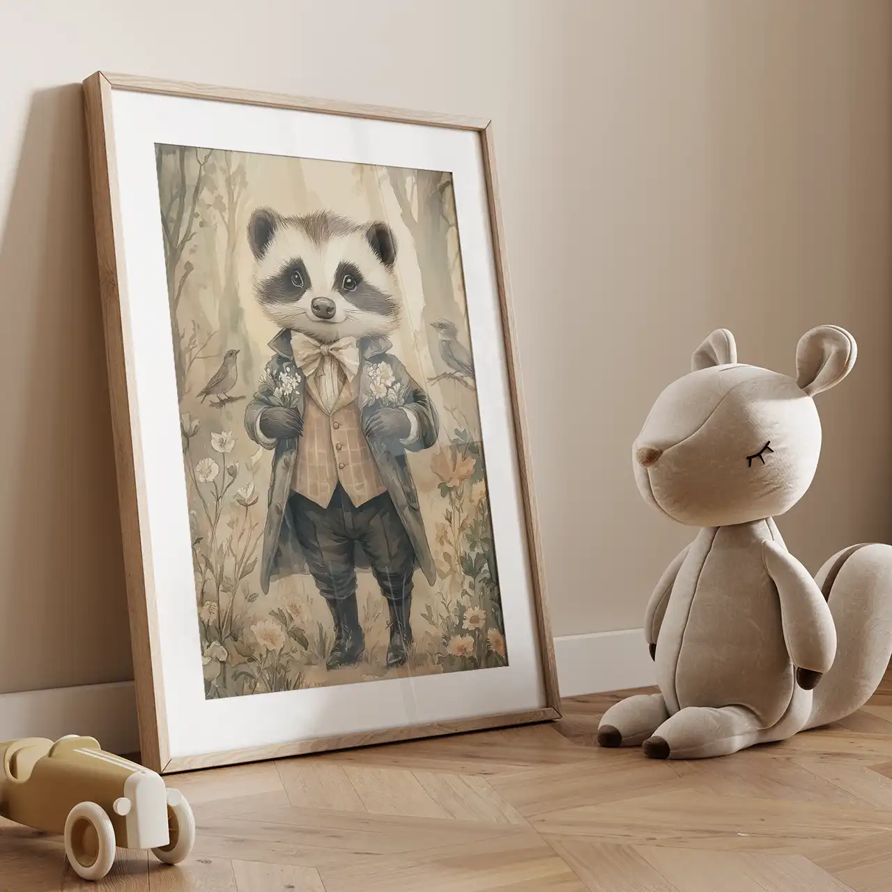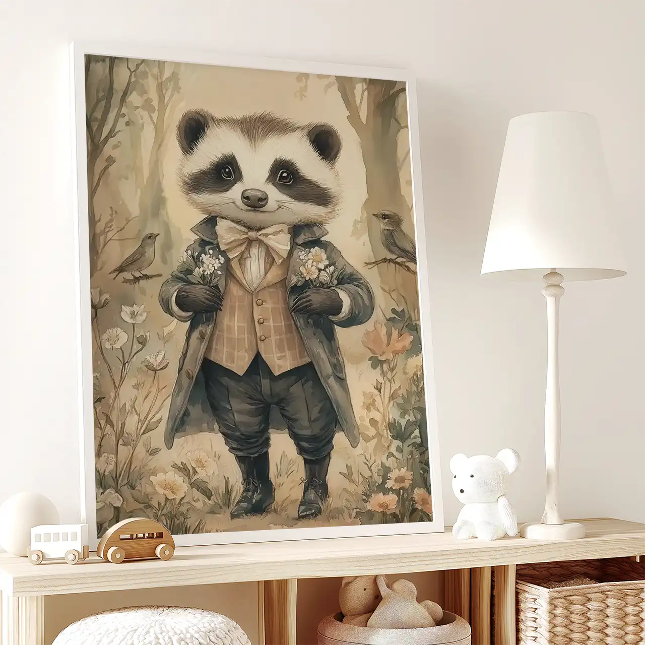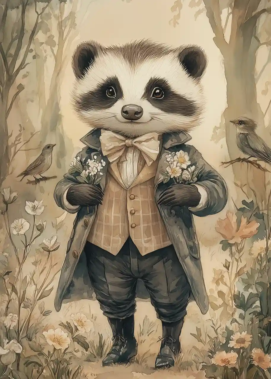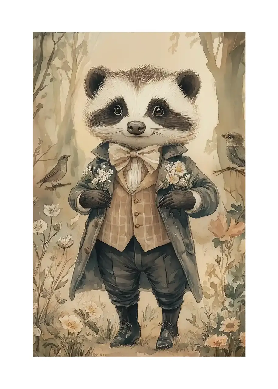 Wyraziste umaszczenie zwierzęcia oraz miękki modelunek światła podkreślają strukturę futra. Detale garderoby – guziki, tkaniny i subtelne zdobienia – tworzą harmonijną całość. Borsuk trzyma drobne kwiaty, które wprowadzają element narracyjny i uzupełniają leśną scenerię.