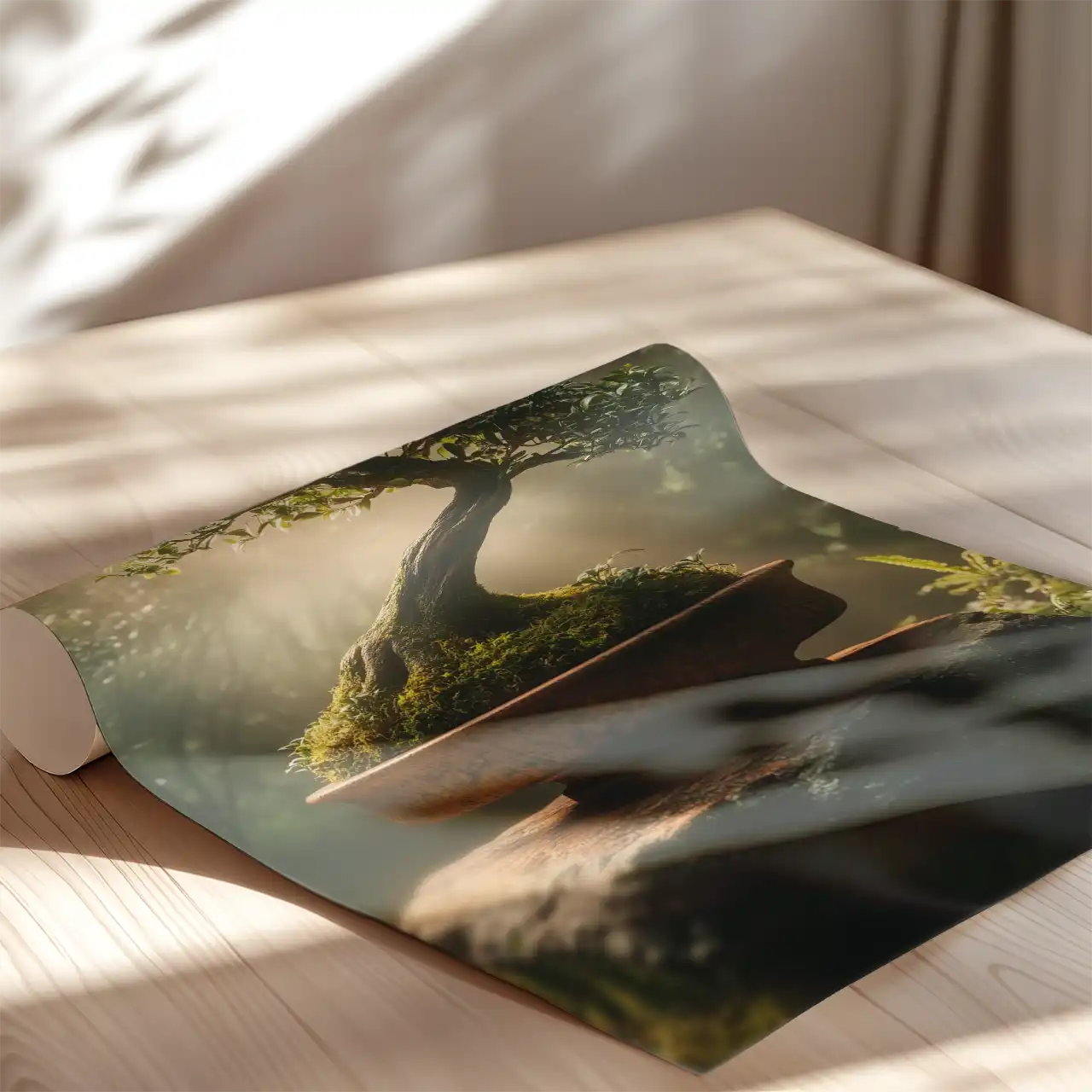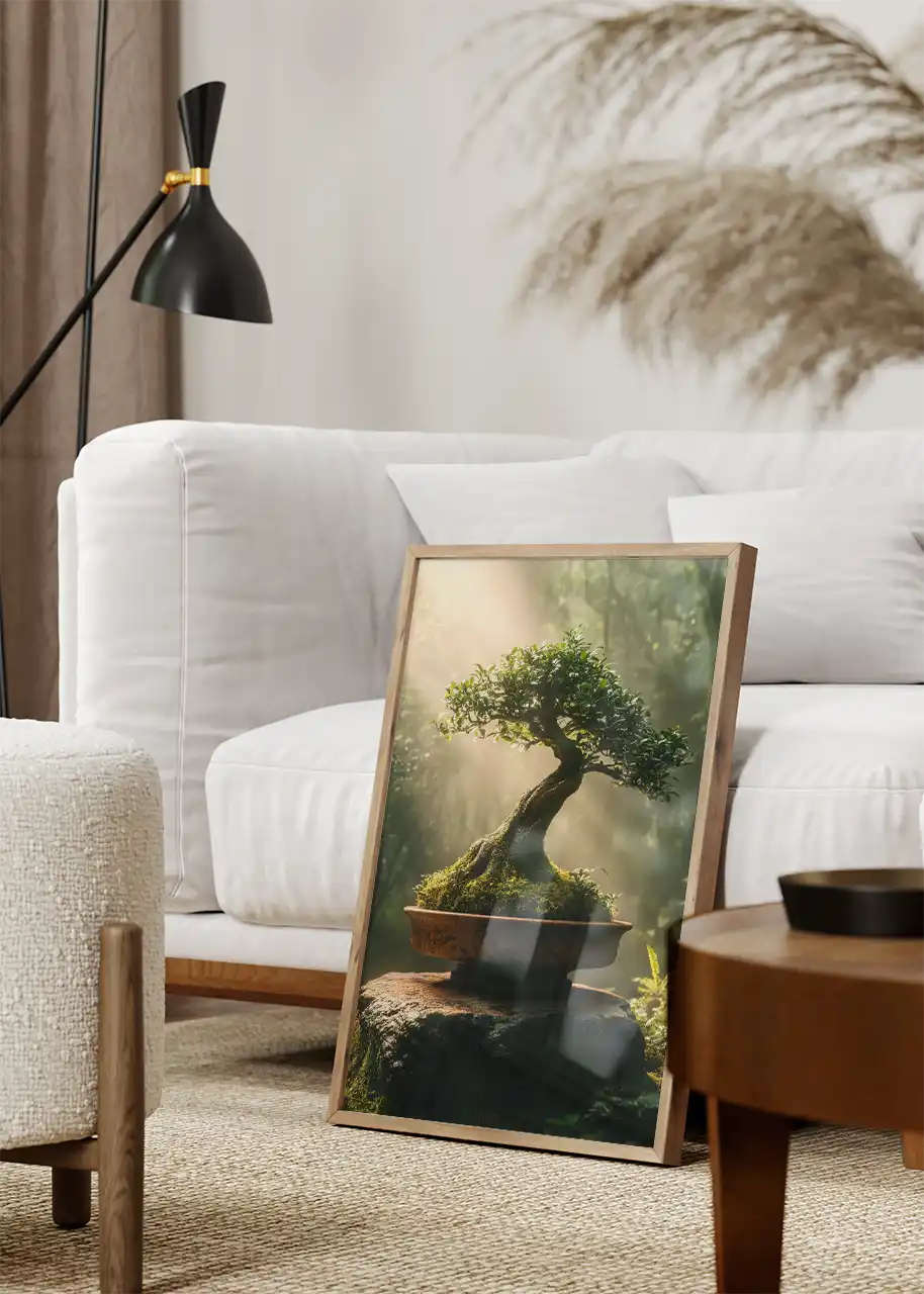 Plakat „Bonsai w blasku słońca” ukazuje formowane drzewko bonsai ustawione na kamiennej podstawie, w otoczeniu leśnej zieleni. Przez koronę drzewa przenikają promienie słońca, tworząc subtelne refleksy i miękkie cienie.