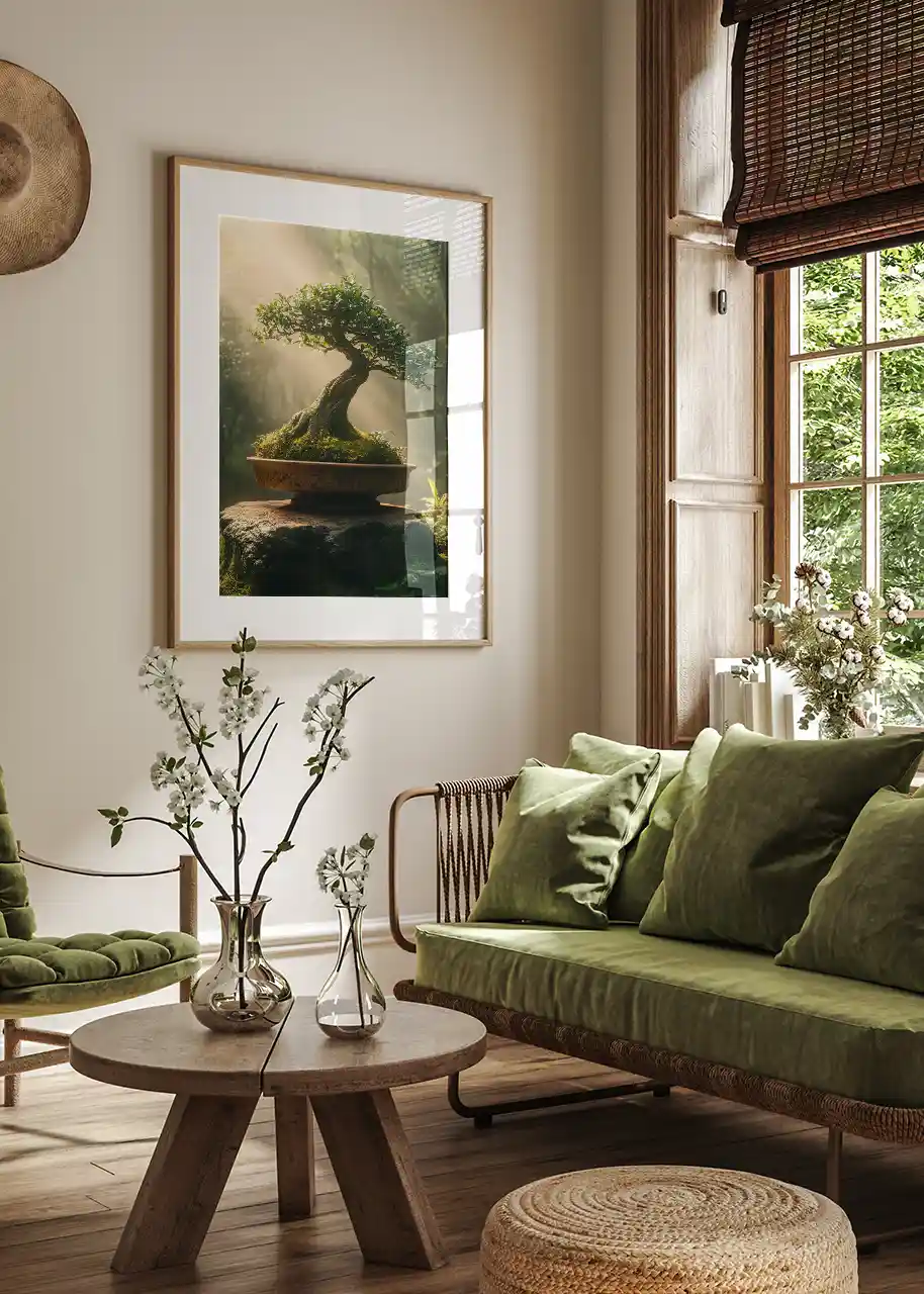 Plakat wpisuje się w estetykę zen, japandi oraz wnętrz inspirowanych naturą.