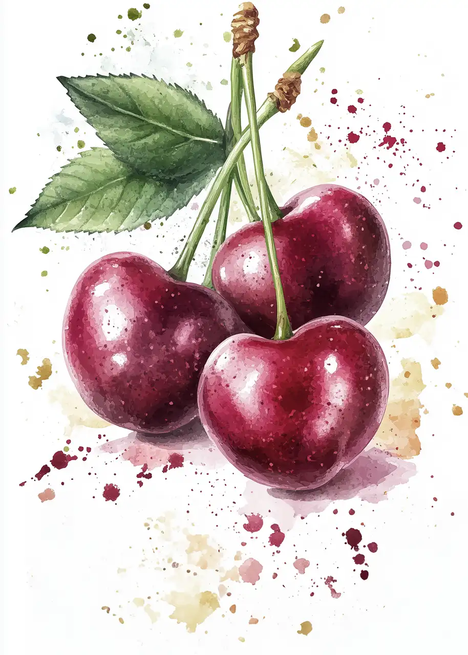 Delikatne przejścia tonalne oraz subtelne rozpryski farby w tle podkreślają akwarelowy styl ilustracji. Intensywna czerwień owoców kontrastuje z jasnym tłem, dzięki czemu grafika jest wyrazista i dekoracyjna.