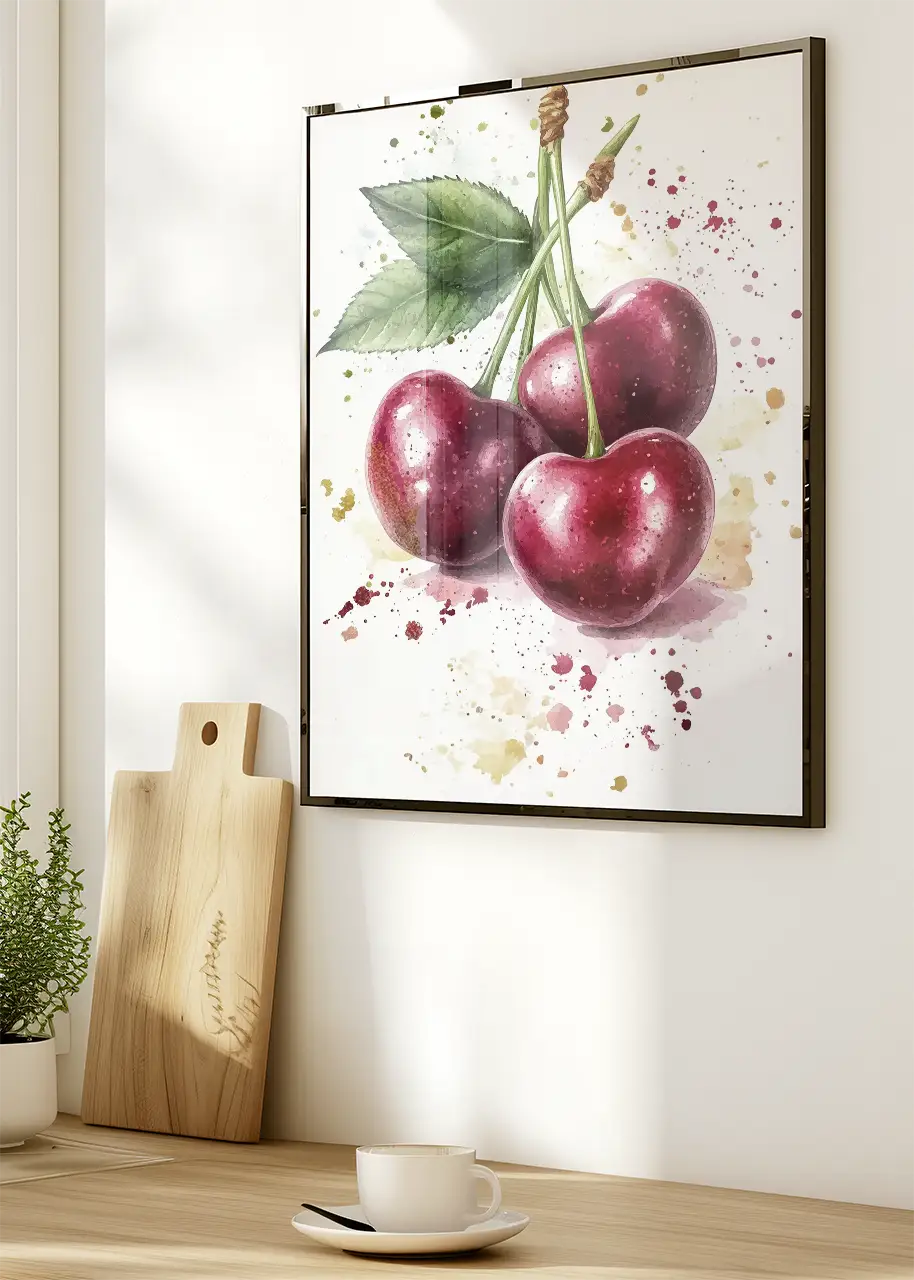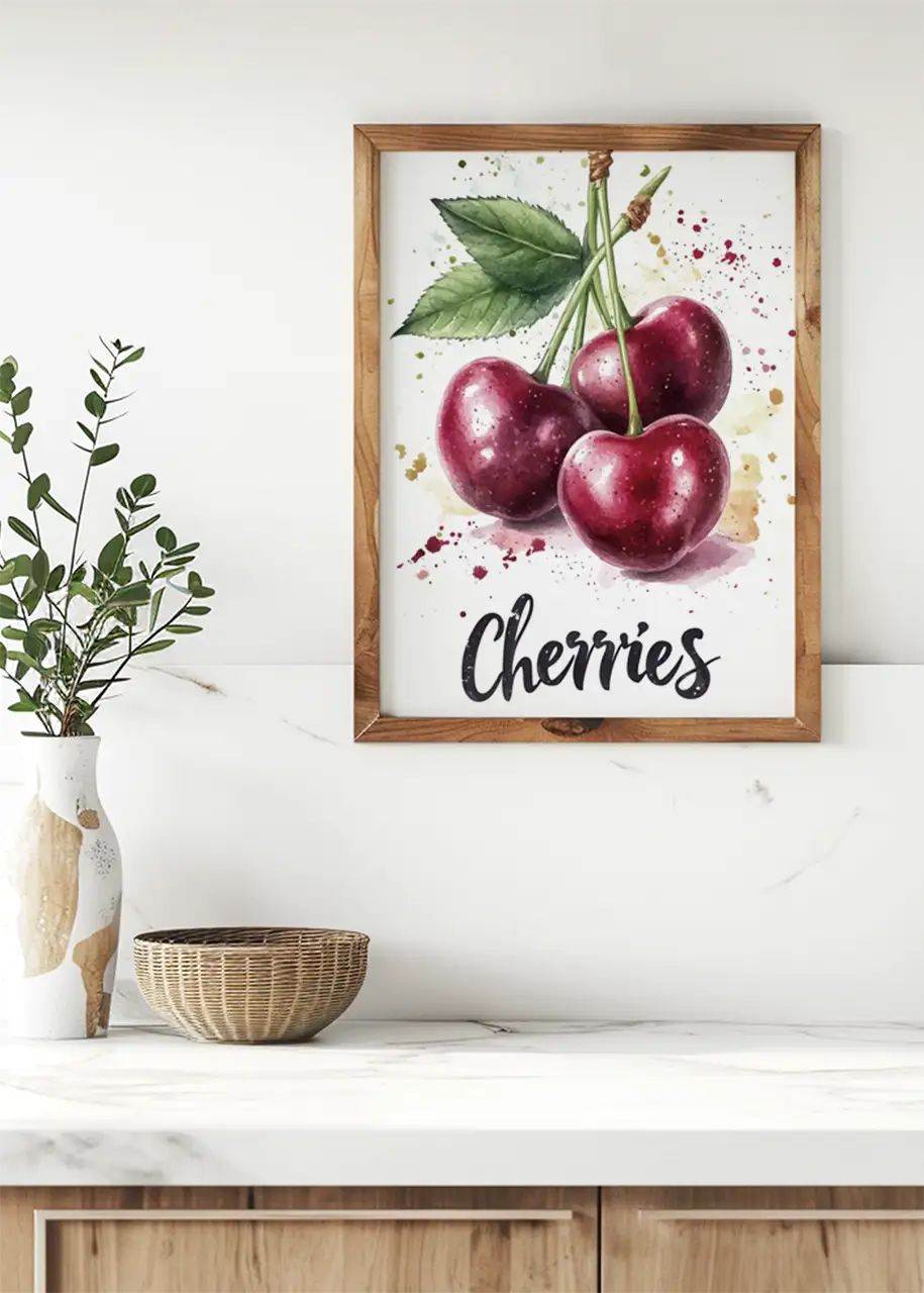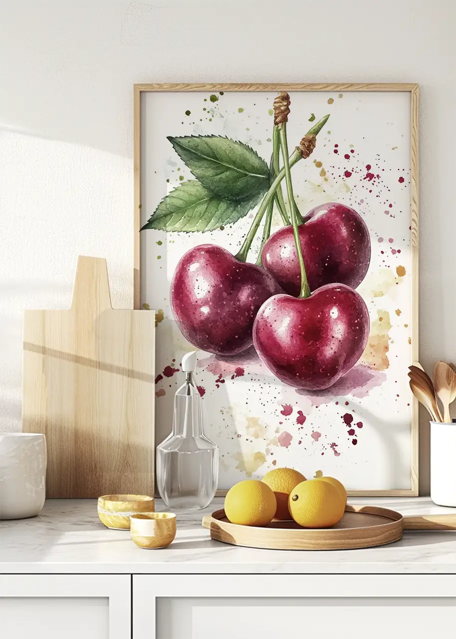 Plakat „Cherries I” przedstawia artystyczną ilustrację dojrzałych wiśni wykonaną w malarskim stylu akwareli. Kompozycja ukazuje trzy owoce połączone zielonymi szypułkami oraz liściem, co nadaje grafice naturalnego i świeżego charakteru.