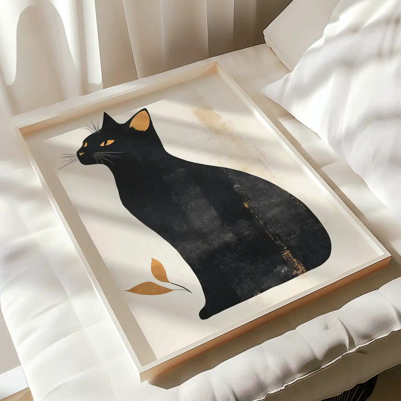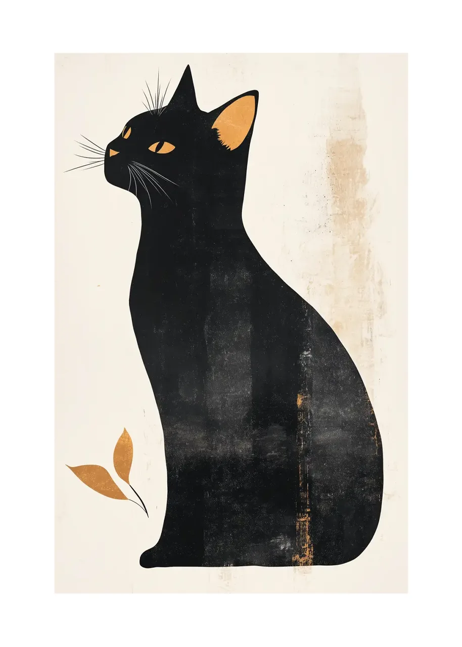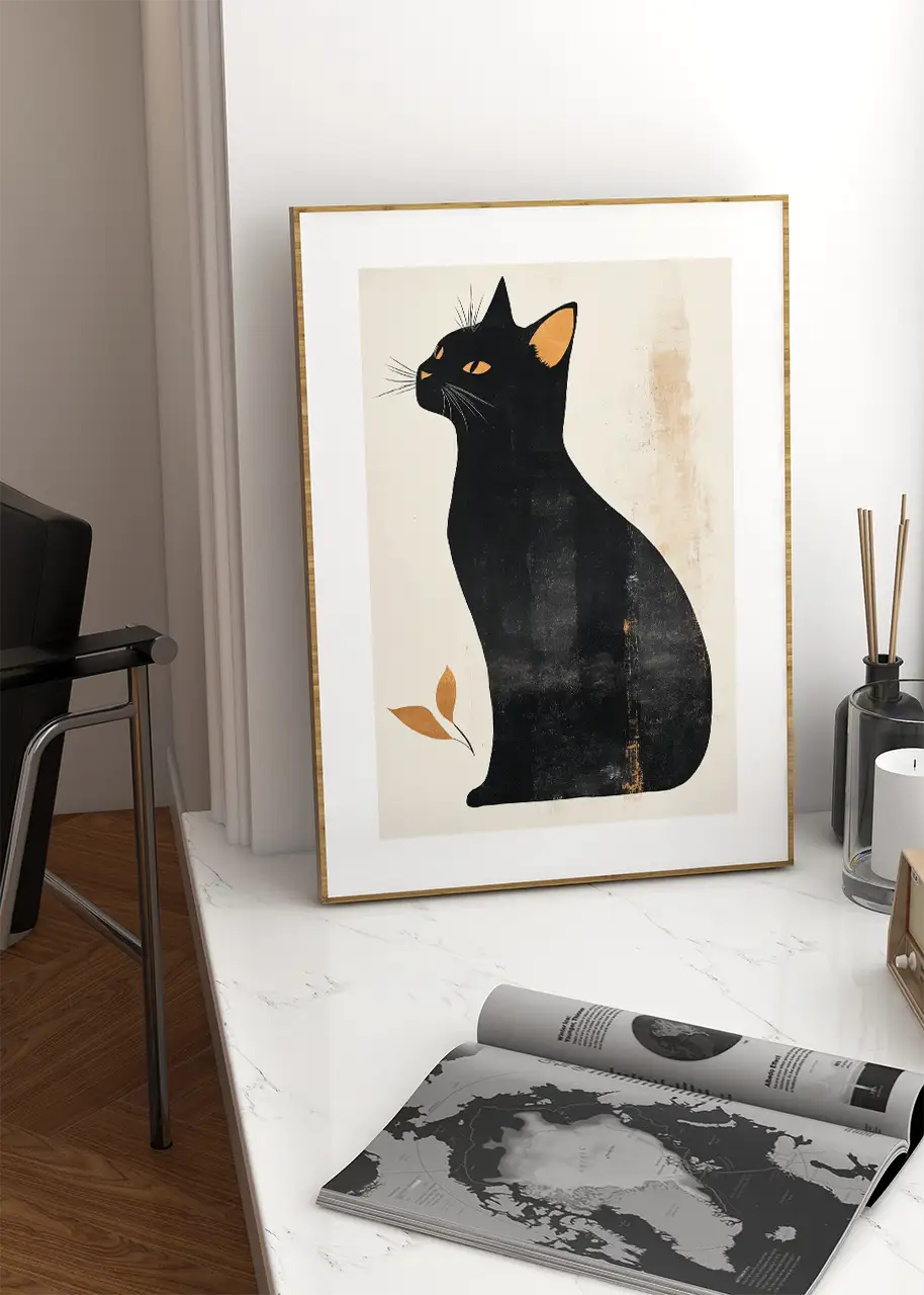 Oryginalny plakat z czarnym kotem wniesie do Twojego wnętrza elegancję i nutę tajemnicy. Prosta kompozycja, stonowane tło oraz subtelne złoto-miedziane akcenty tworzą harmonijną całość, która przykuwa uwagę. Ten plakat na ścianę z kotem doskonale współgra z nowoczesnymi oraz klasycznymi aranżacjami, nadając pomieszczeniu wyrazistości i podkreślając jego charakter. Świetnie sprawdzi się w salonie, sypialni czy gabinecie, urozmaicając przestrzeń i dodając jej niepowtarzalnego szlifu. To także świetny pomysł na prezent dla miłośników kotów oraz osób ceniących oryginalne grafiki, które pragną tchnąć nowe życie w swoje wnętrze.