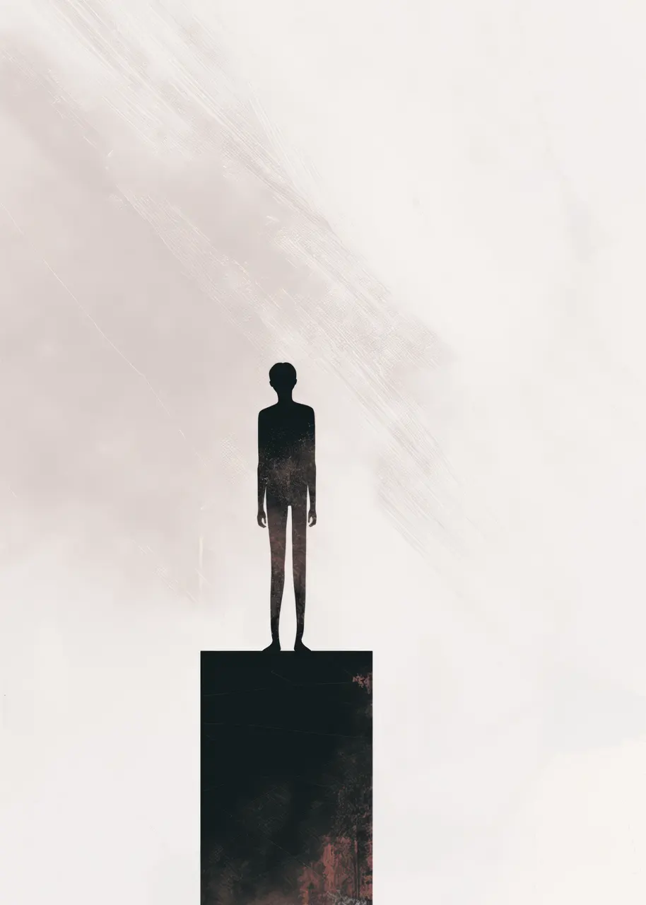 Samotna postać może symbolizować relację człowieka z przestrzenią, poczucie izolacji, ale również siłę i autonomię jednostki. Monumentalna pustka wokół sylwetki nadaje grafice wymiar filozoficzny.