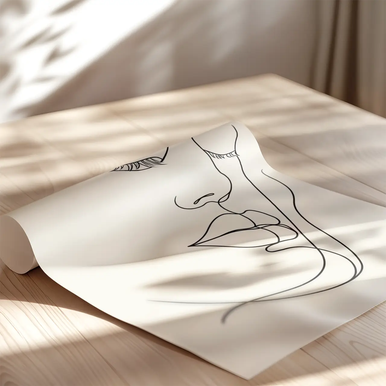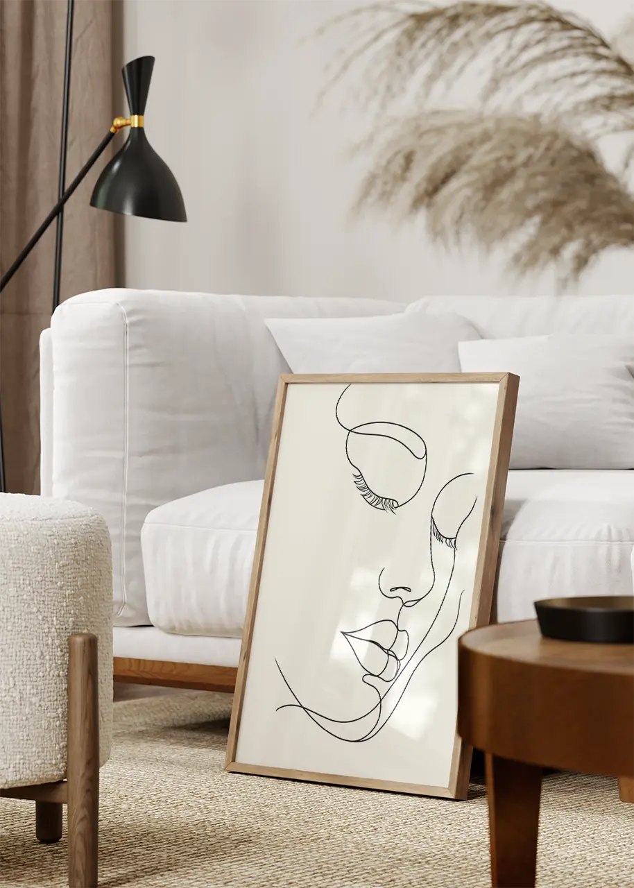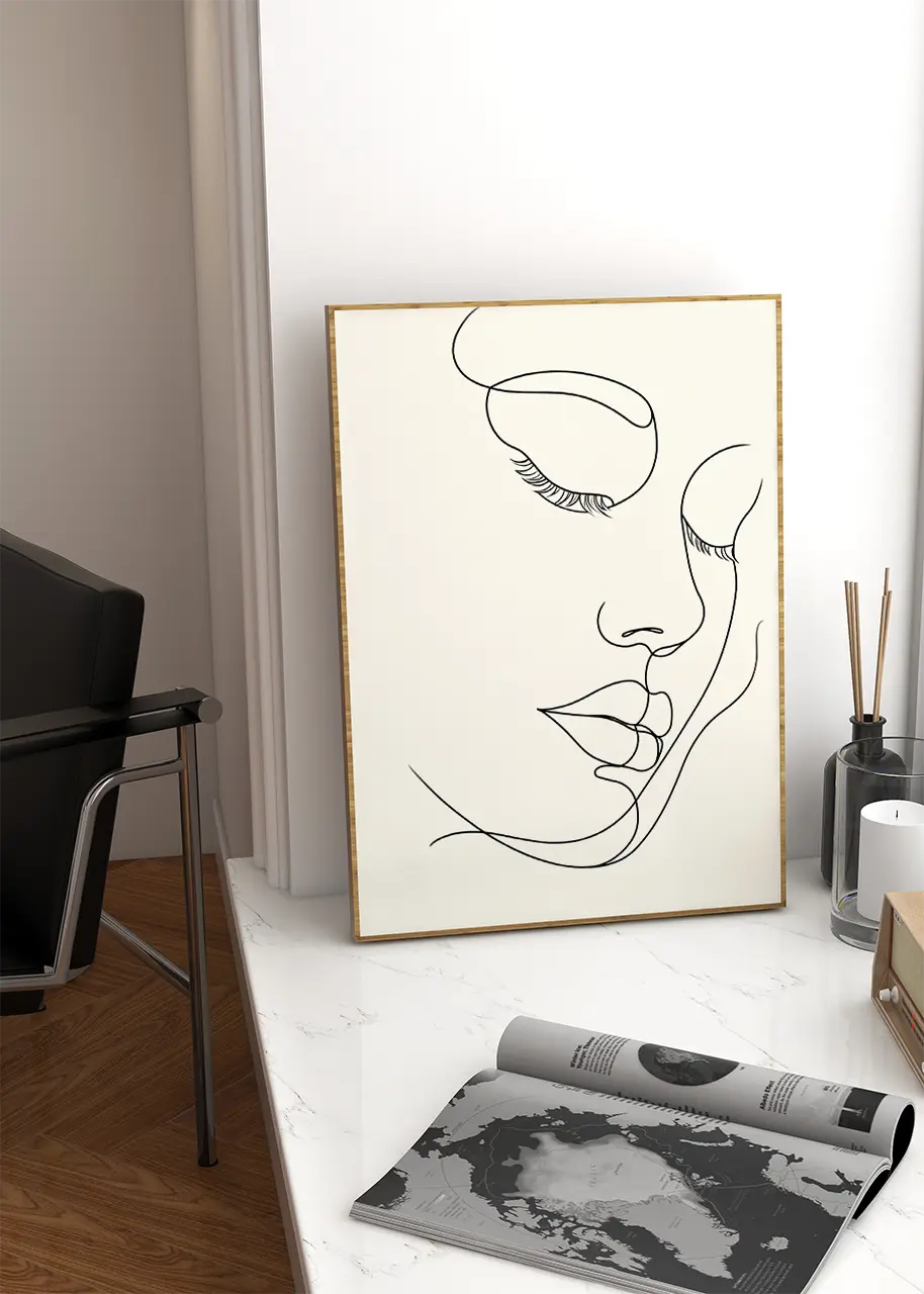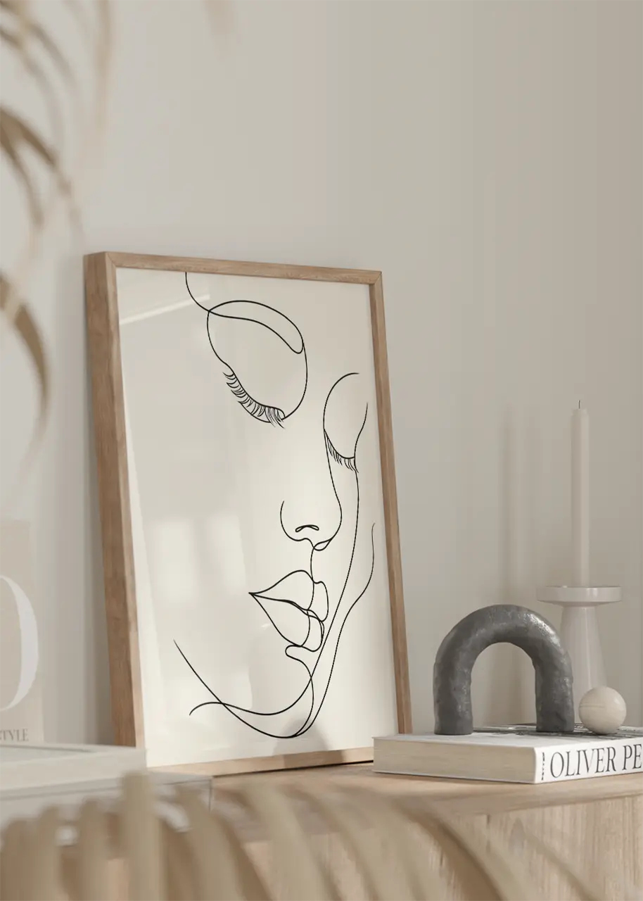 Minimalistyczny plakat w stylu line art, który skupia się na prostocie i subtelności formy. Przedstawia kobiecą twarz, zarysowaną lekkimi, płynnymi liniami bez zbędnych szczegółów. Gładkie, łagodne kontury nadają obrazowi wyjątkowej delikatności. Dzięki swojej prostocie, plakat świetnie wpasuje się w nowoczesne, minimalistyczne wnętrza, dodając im elegancji. Idealny do salonu lub sypialni, gdzie będzie ciekawym akcentem dekoracyjnym, który nie przytłacza, a jedynie podkreśla styl pomieszczenia.