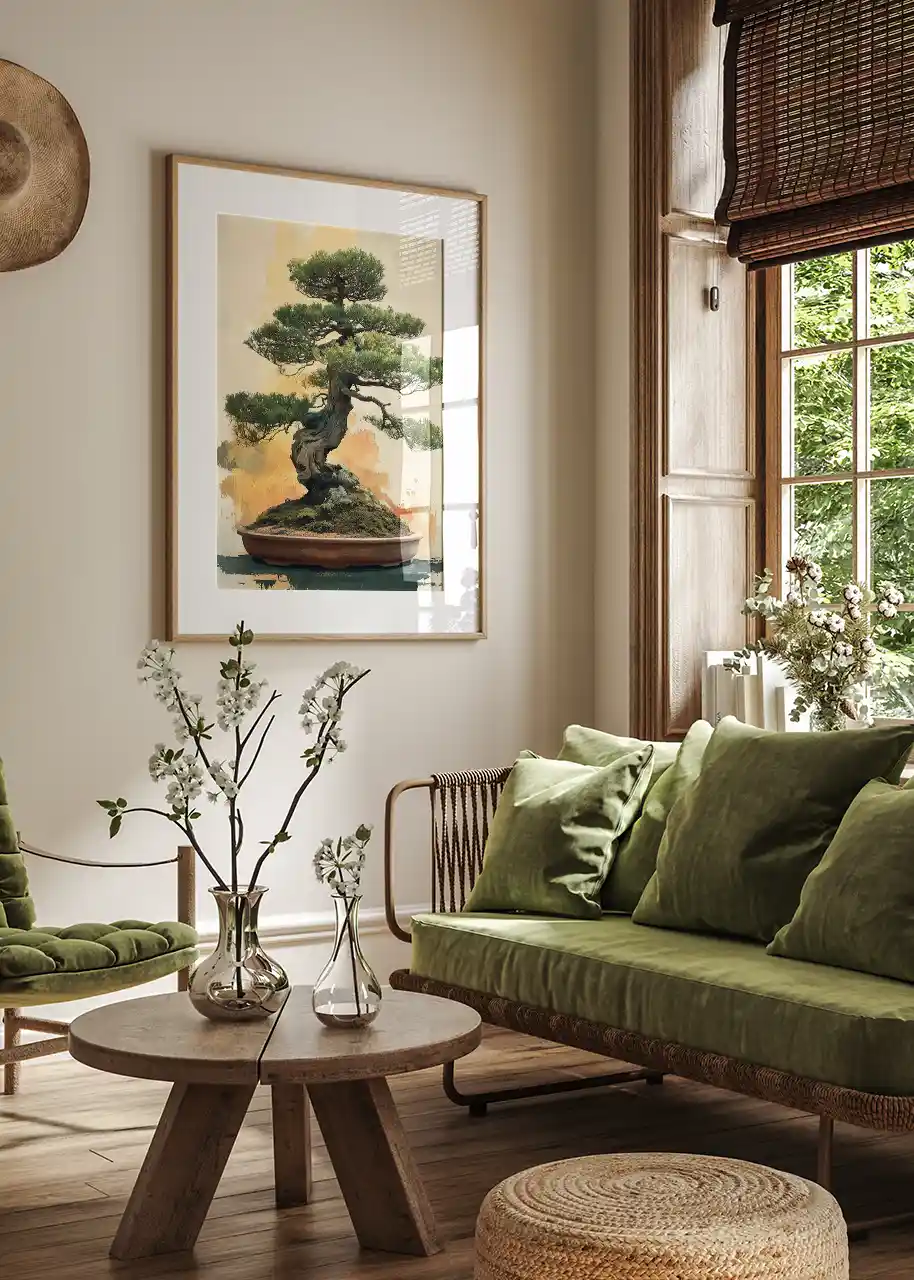 Bonsai symbolizuje cierpliwość, harmonię i świadome kształtowanie przestrzeni. To motyw kojarzony z równowagą oraz spokojem.