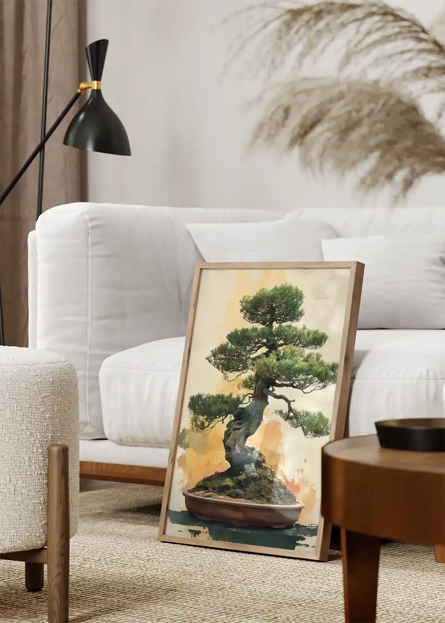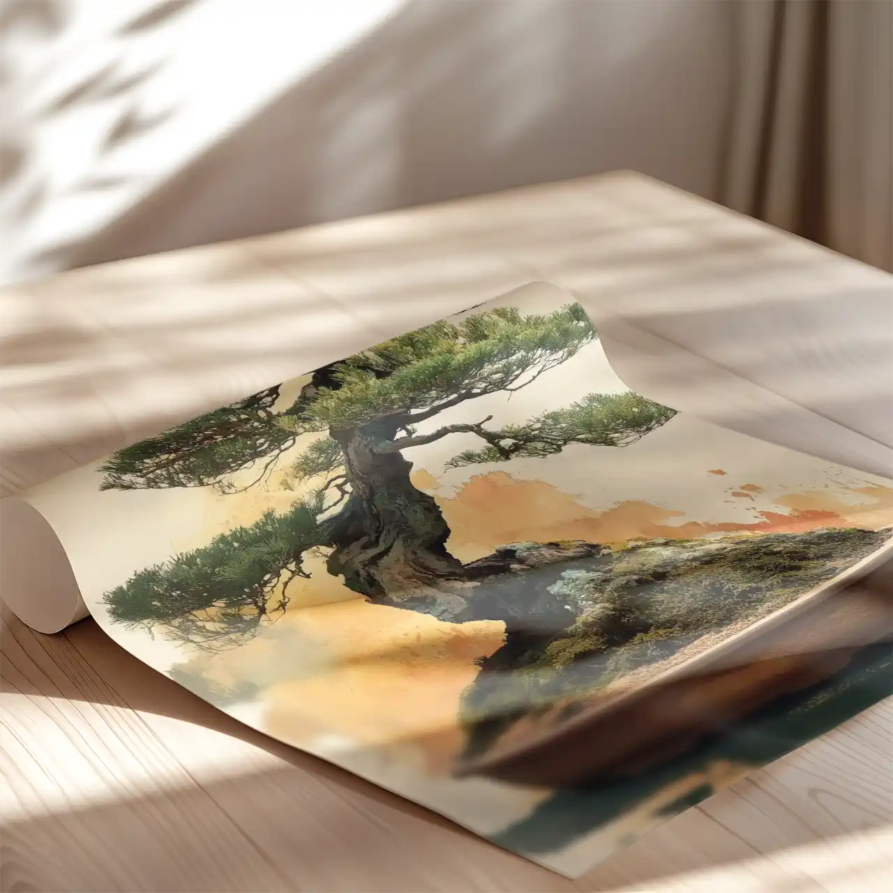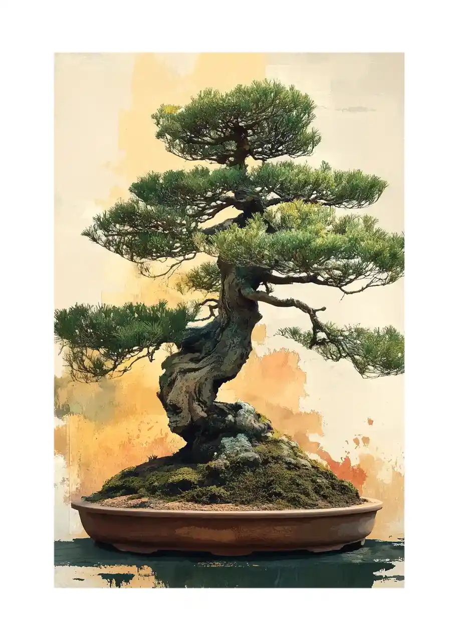 Plakat „Drzewko bonsai I” ukazuje starannie uformowane bonsai osadzone w niskiej, ceramicznej misie. Charakterystyczny, lekko skręcony pień oraz warstwowo ułożone korony tworzą wyważoną, klasyczną sylwetkę drzewa.