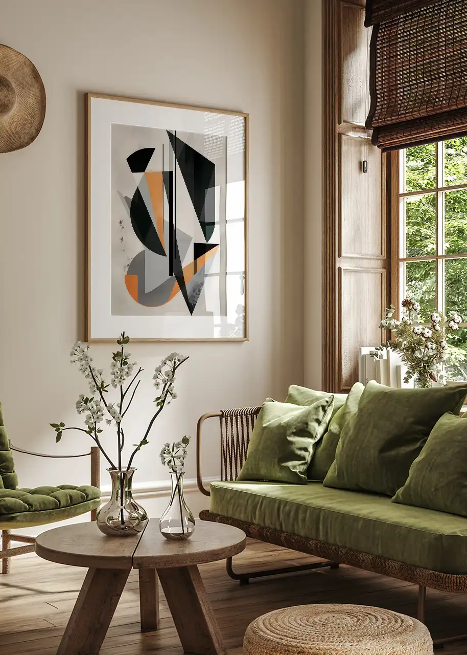 Plakat doskonale sprawdzi się jako dekoracja ścienna w salonie, biurze lub nowoczesnej przestrzeni mieszkalnej. Geometryczna kompozycja wprowadza do wnętrza dynamiczny i nowoczesny akcent.