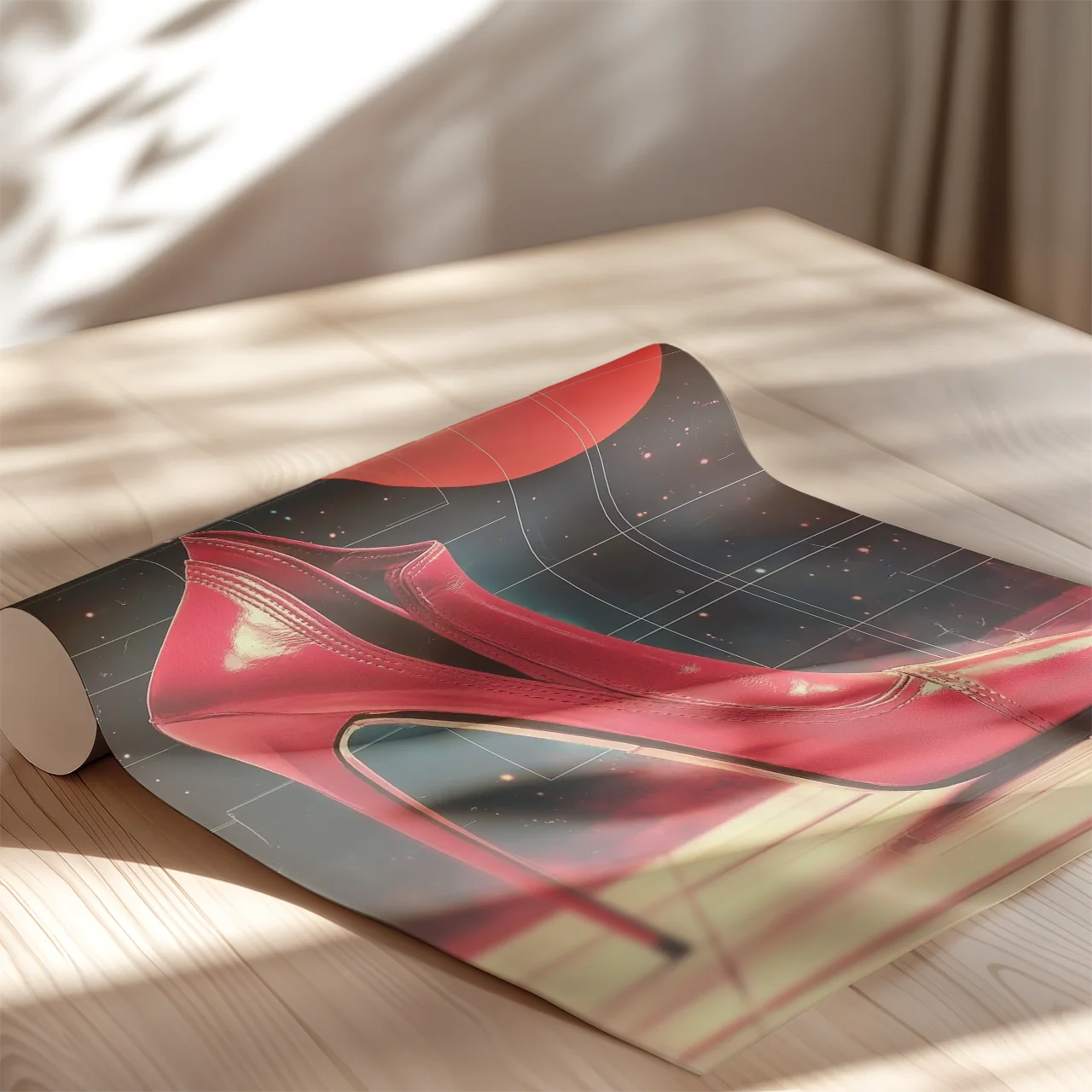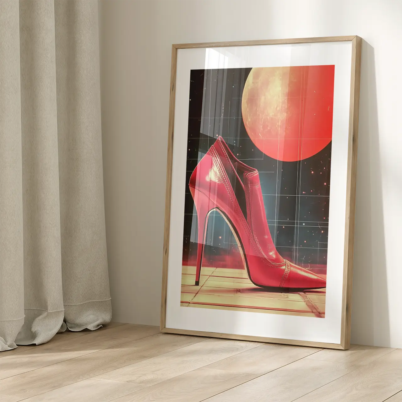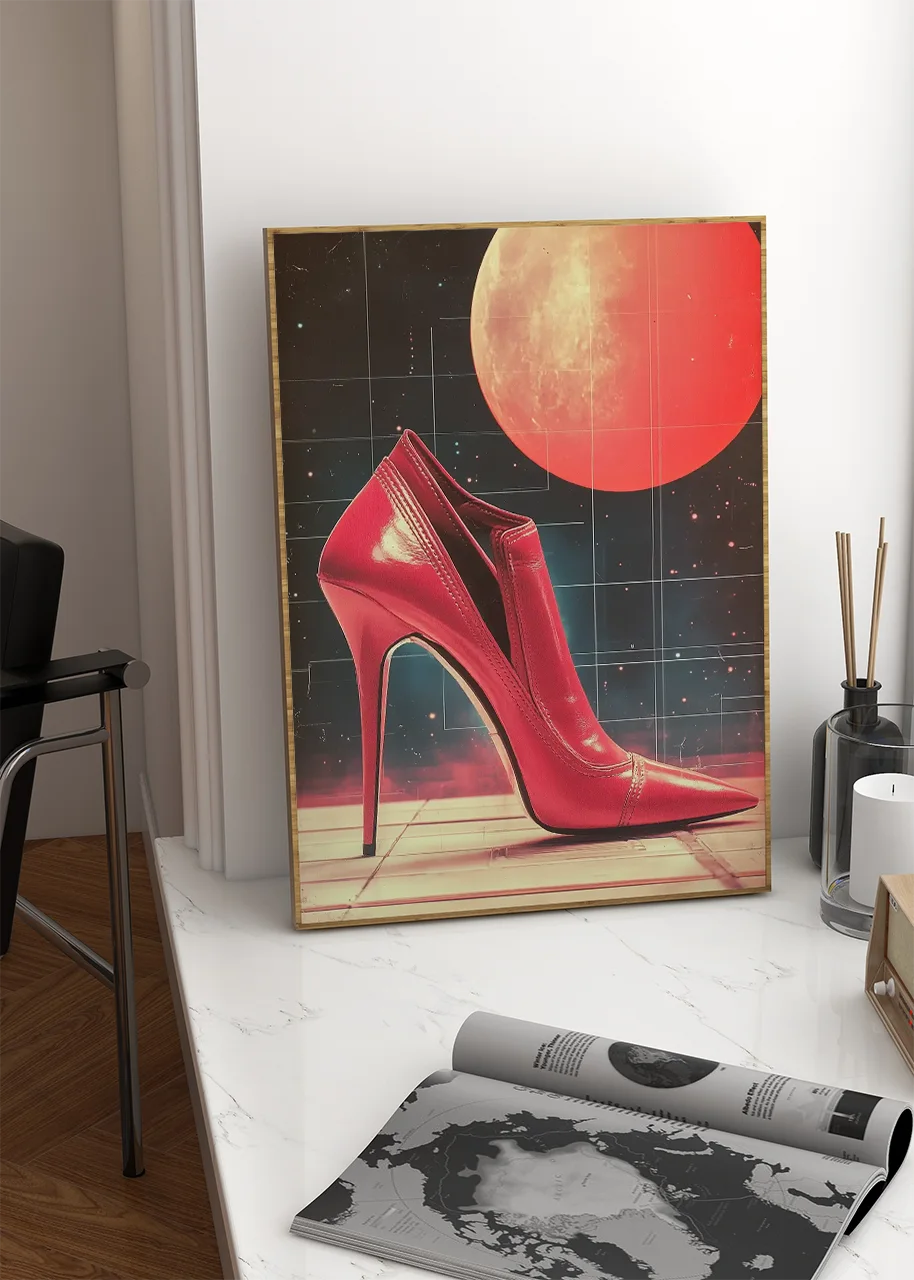 Plakat, który łączy klasyczną elegancję z futurystycznym klimatem. Lśniąca szpilka wyłania się z neonowego, kosmicznego tła, przypominając sceny z popkulturowych wizji przyszłości z końca ubiegłego wieku. Dynamiczna gra świateł sprawia, że ta nietuzinkowa grafika na ścianę aż kipi energią. Plakaty z serii High Heel 3000 to idealne dekoracje do nowoczesnych wnętrz przeznaczone dla miłośników odważnego, przyciągającego wzrok designu.