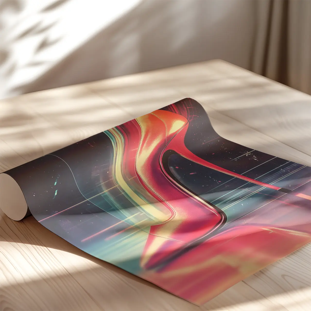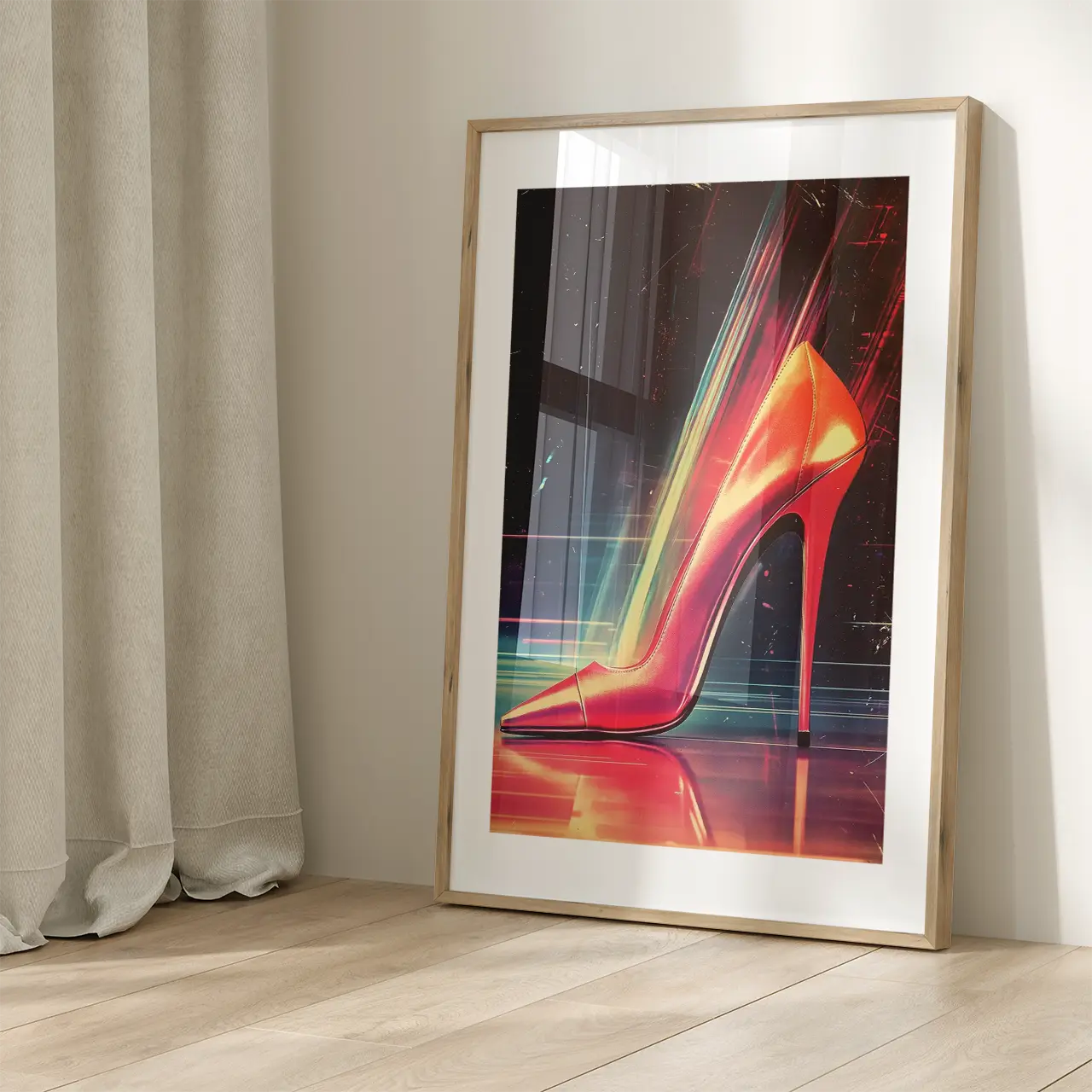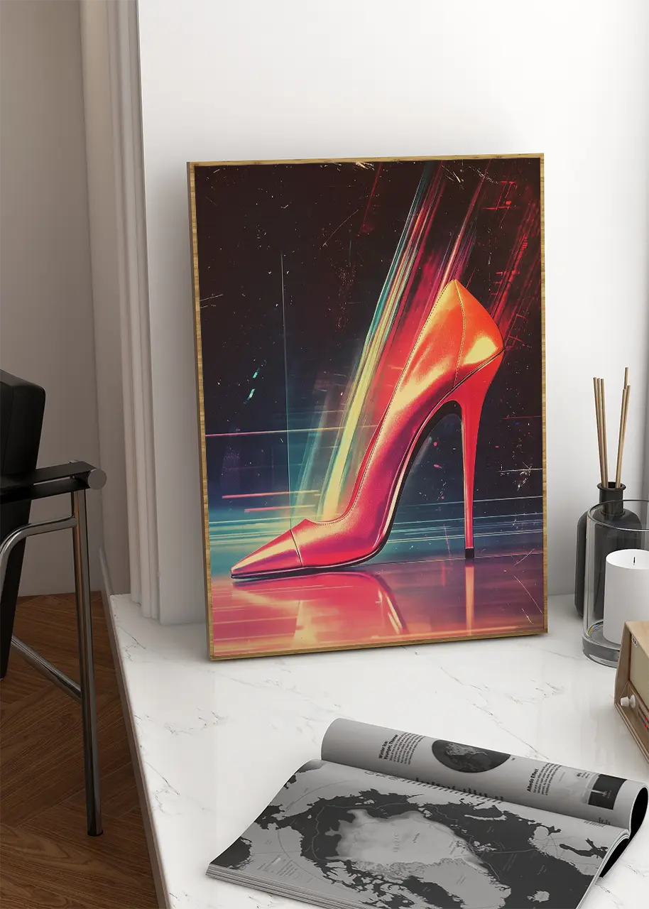 Plakat, który łączy klasyczną elegancję z futurystycznym klimatem. Lśniąca szpilka wyłania się z neonowego, kosmicznego tła, przypominając sceny z popkulturowych wizji przyszłości z końca ubiegłego wieku. Dynamiczna gra świateł sprawia, że ta nietuzinkowa grafika na ścianę aż kipi energią. Plakaty z serii High Heel 3000 to idealne dekoracje do nowoczesnych wnętrz przeznaczone dla miłośników odważnego, przyciągającego wzrok designu.