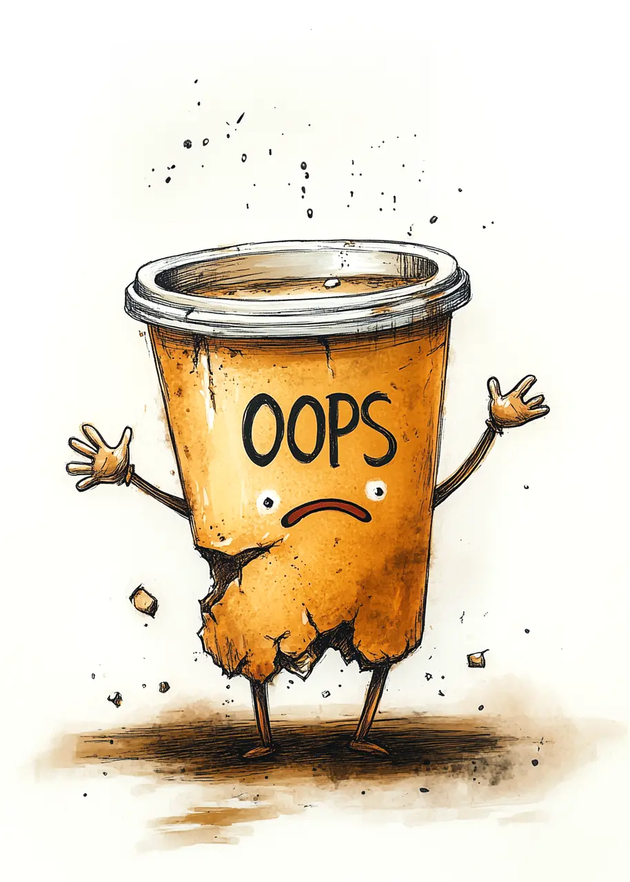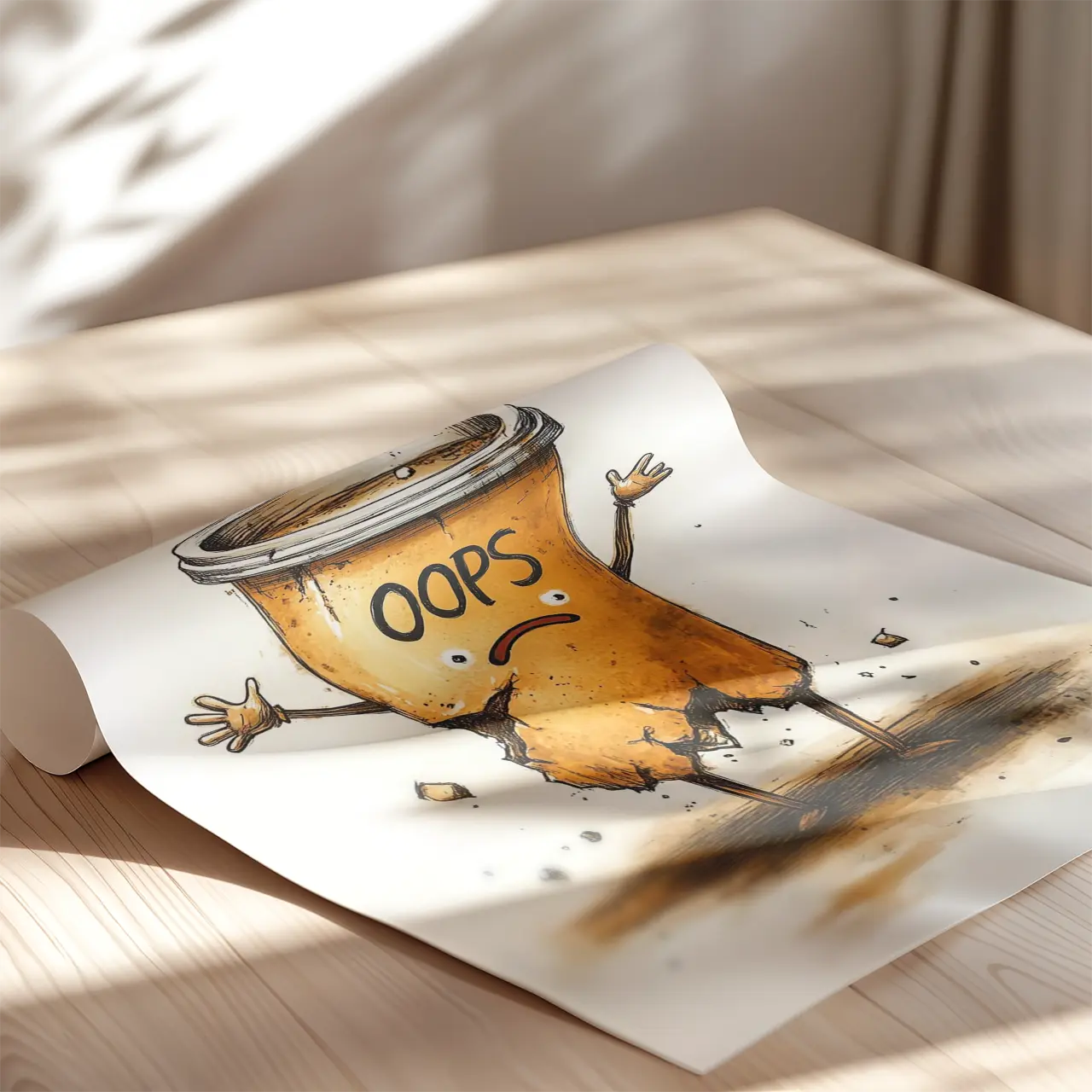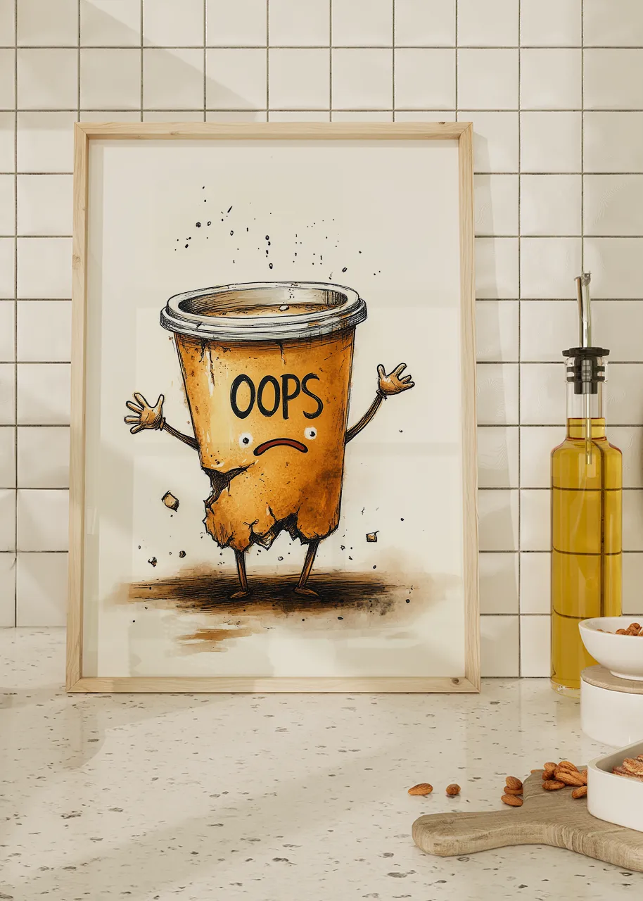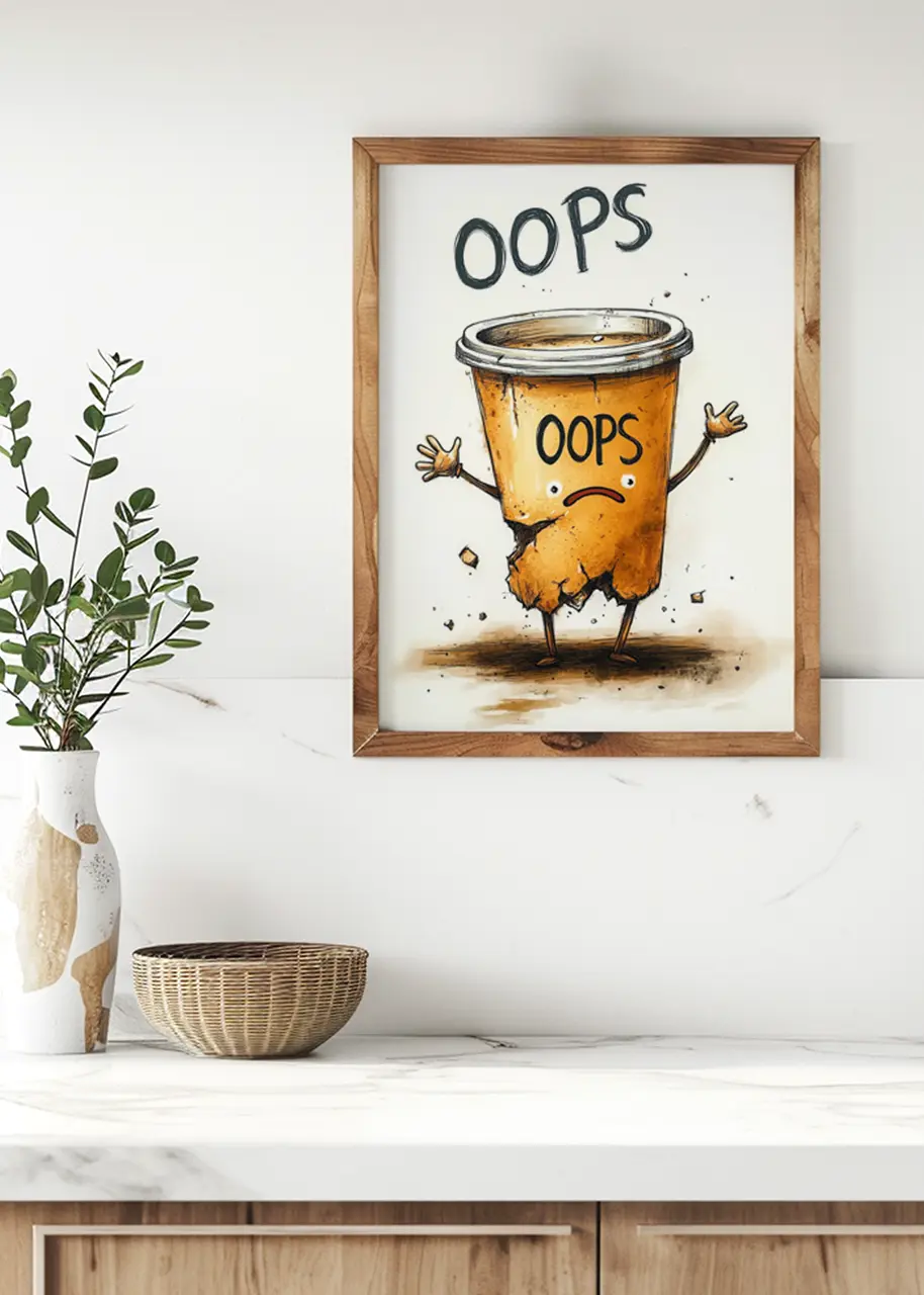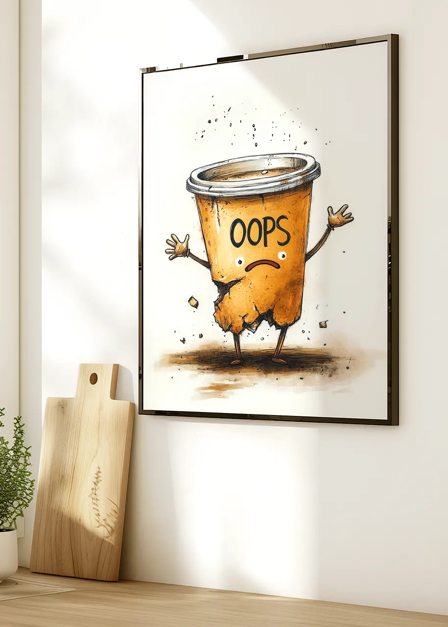Humorystyczna grafika na ścianę, która rozśmieszy każdego miłośnika kawy. Uroczy kubek, który wygląda, jakby przeżywał swój najgorszy poranek, idealnie wpasuje się do kuchni lub jadalni. Stylizowany na ręczny rysunek plakat z zabawnym motywem i hasłem „OOPS” (lub bez niego) doda lekkości i odrobiny dystansu do codziennych rytuałów. To idealny sposób na udekorowanie przestrzeni w nieformalny, ale stylowy sposób. Plakat sprawdzi się zarówno jako element wystroju, jak i pomysłowy prezent dla każdego, kto nie wyobraża sobie dnia bez porannej kawy.