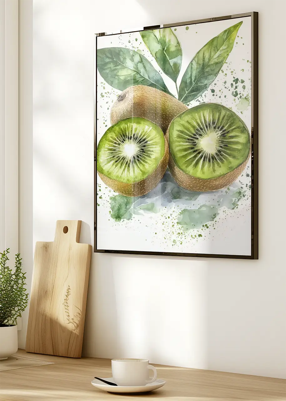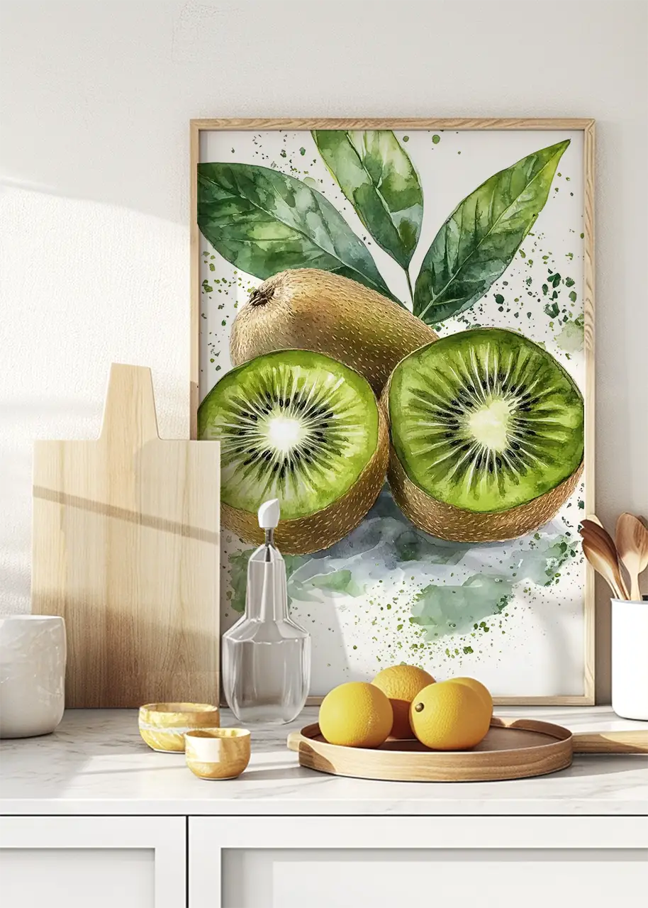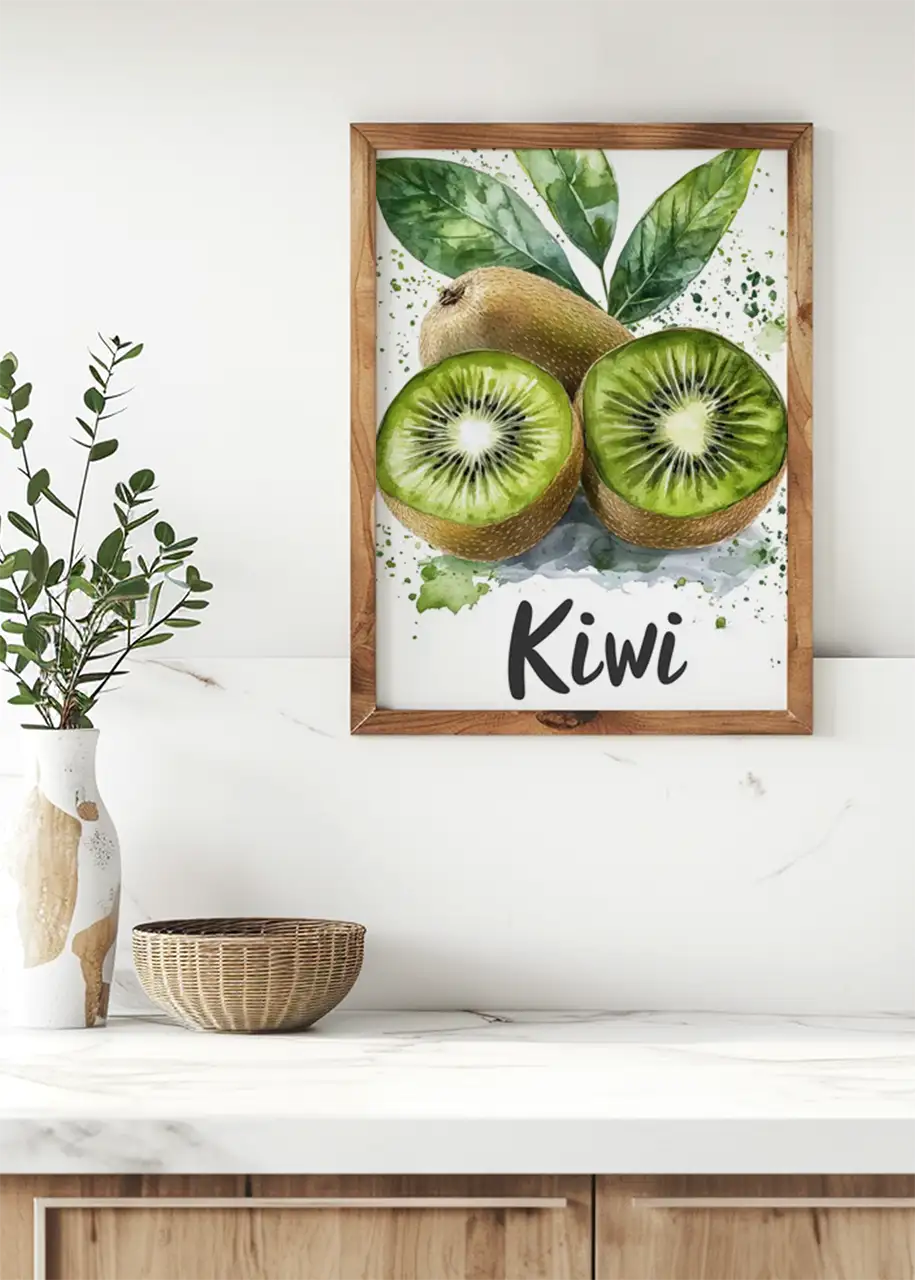 Plakat „Kiwi II” przedstawia artystyczną ilustrację owoców kiwi wykonaną w malarskim stylu akwareli. Kompozycja ukazuje dwa przekrojone owoce z charakterystycznym układem nasion oraz jeden cały owoc znajdujący się w tle.