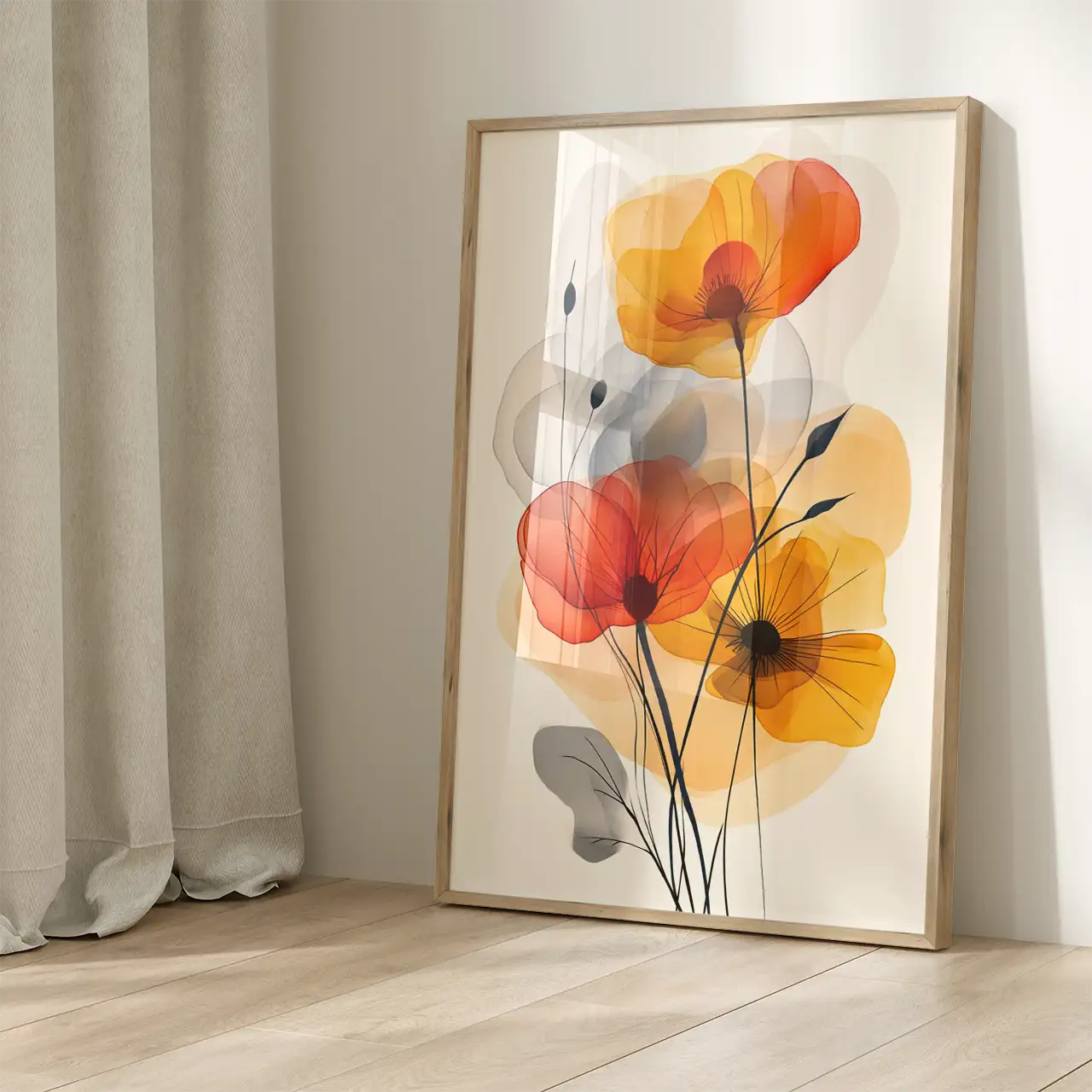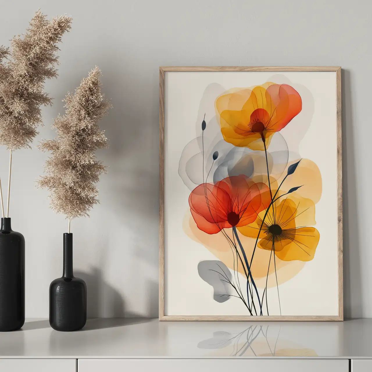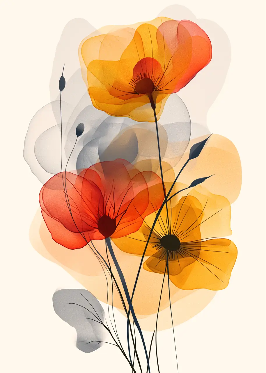 Kompozycja opiera się na nakładających się warstwach koloru, które nadają grafice lekkości i głębi. Cienkie, ciemne łodygi wprowadzają pionowy rytm i porządkują całość, podkreślając nowoczesny charakter obrazu.