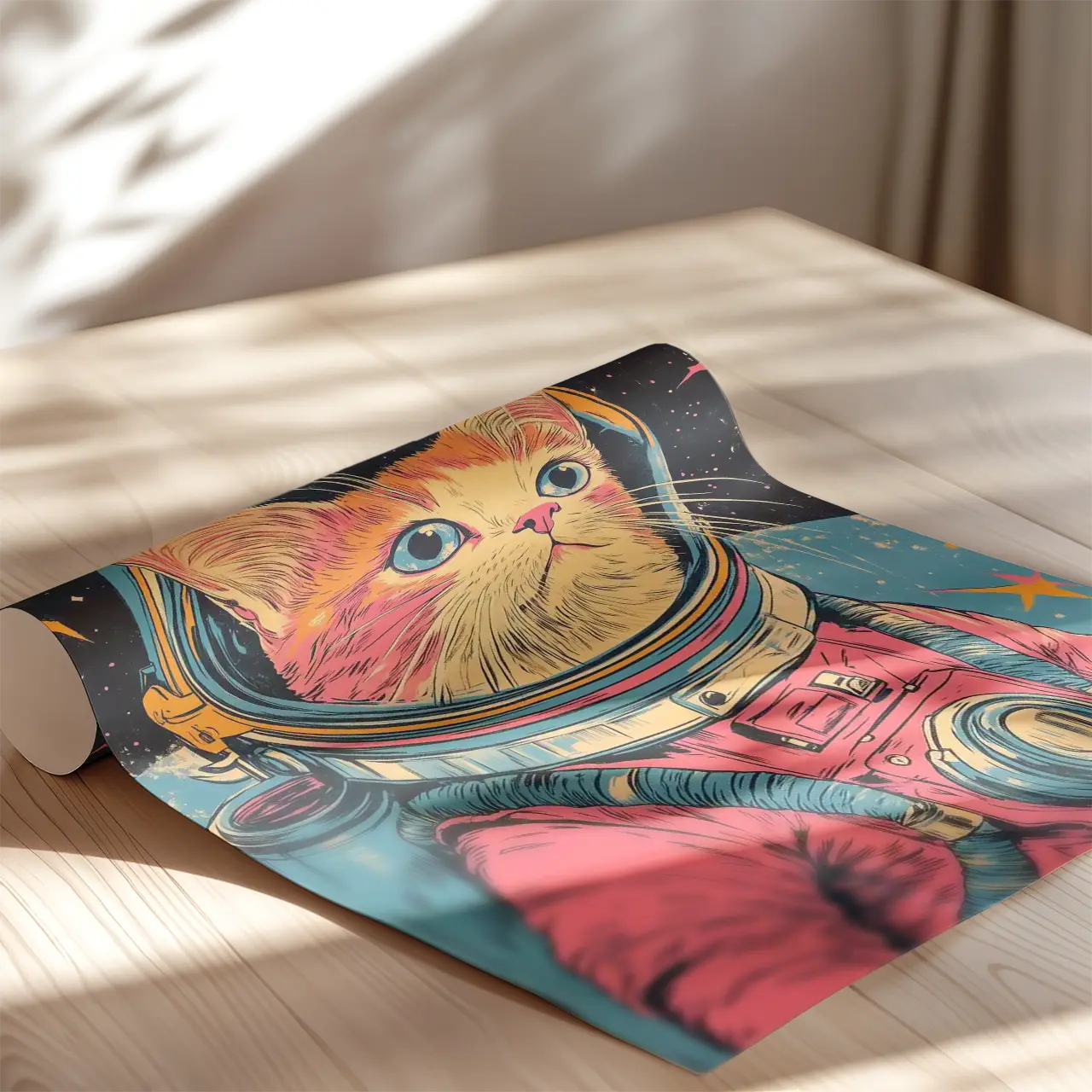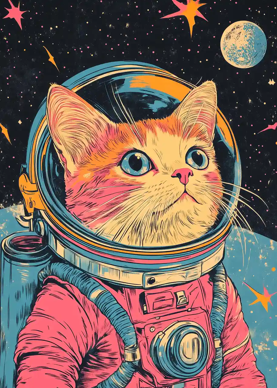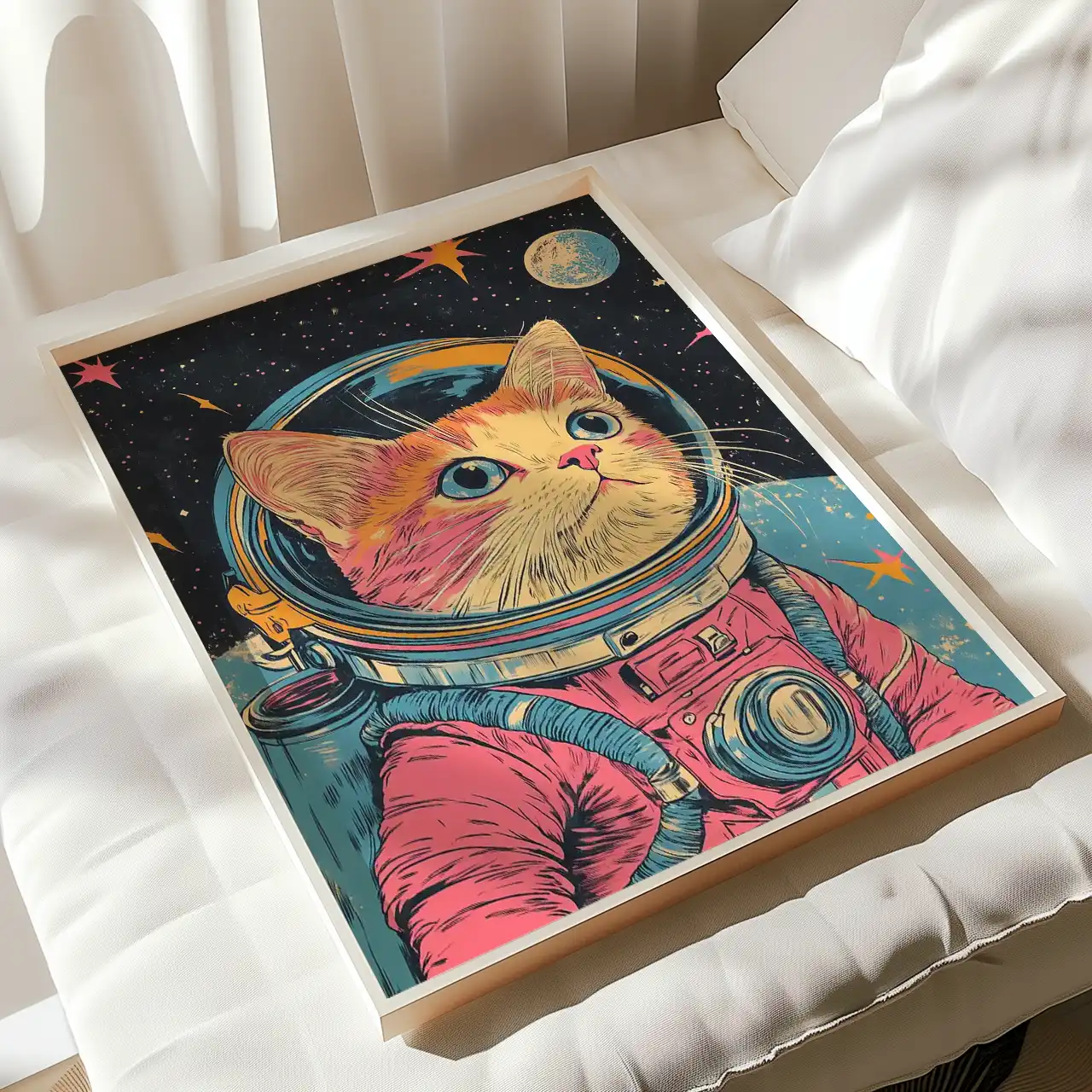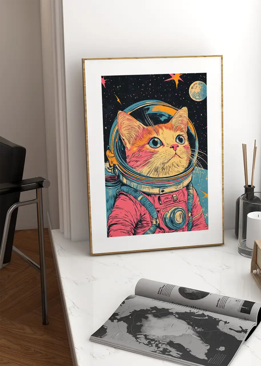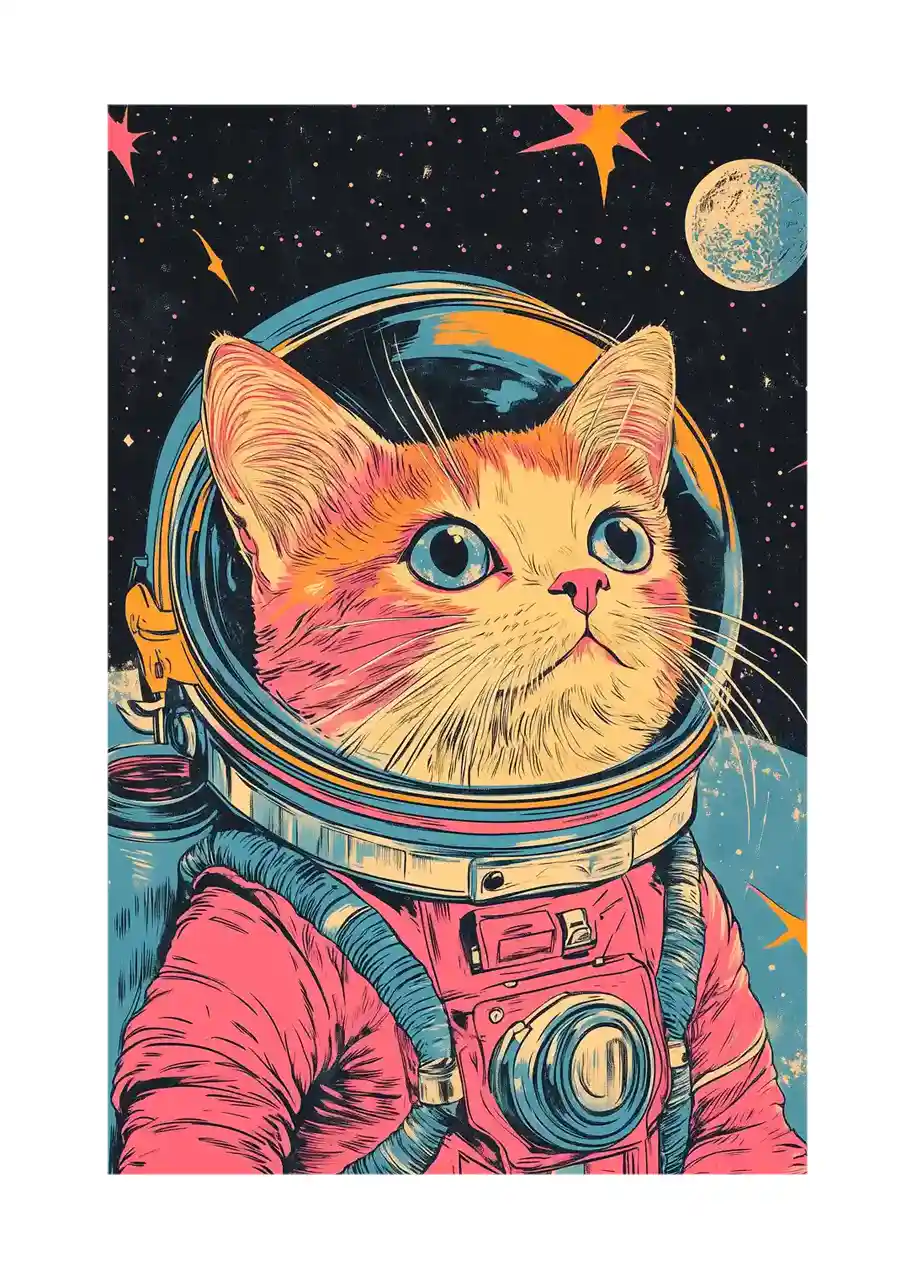 Plakat „Kot w Kosmosie I” przedstawia stylizowaną ilustrację kota ubranego w skafander astronauty. Zwierzę spogląda w przestrzeń kosmiczną, a tło wypełniają gwiazdy, planety oraz dynamiczne elementy graficzne.