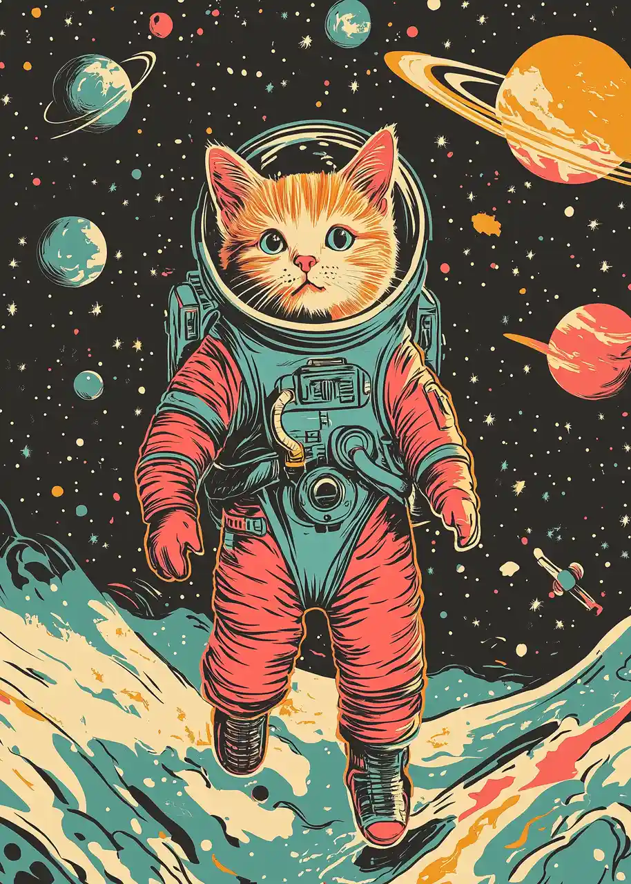 Centralnym elementem kompozycji jest sylwetka kota w skafandrze kosmicznym unoszącego się nad powierzchnią planety. Wokół niego rozmieszczone są planety, gwiazdy i kosmiczne motywy, które budują głębię sceny.