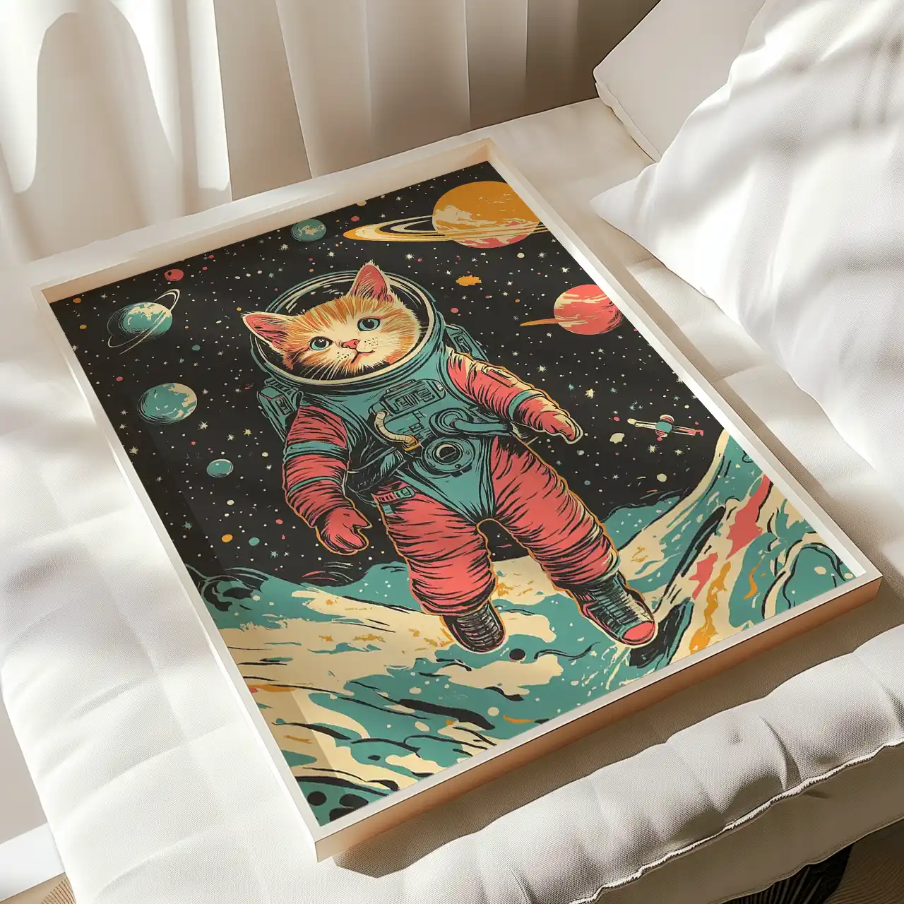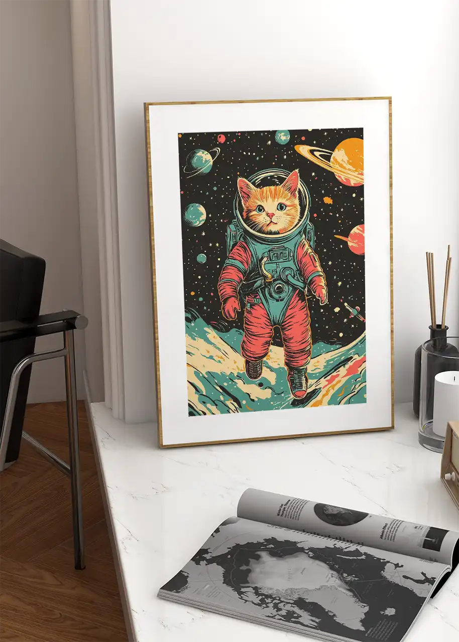 Plakat „Kot w Kosmosie II” przedstawia stylizowaną ilustrację kota ubranego w skafander astronauty, unoszącego się w przestrzeni kosmicznej. W tle widoczne są planety, gwiazdy oraz kosmiczne elementy graficzne, które budują bogatą i dynamiczną scenę.