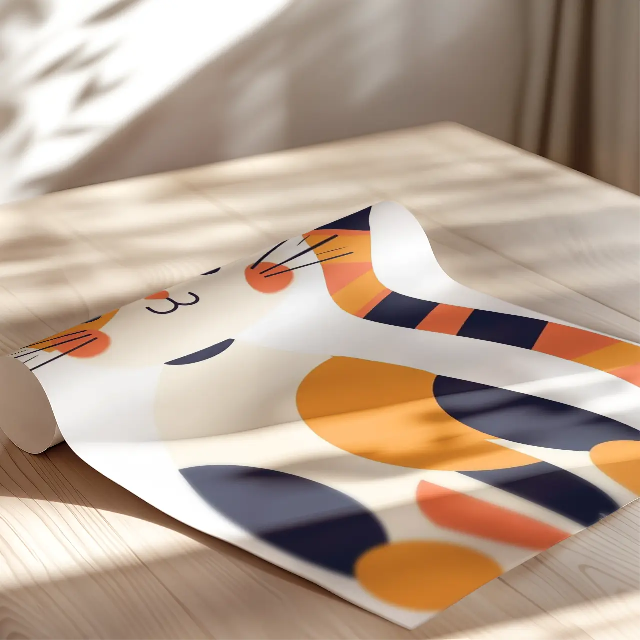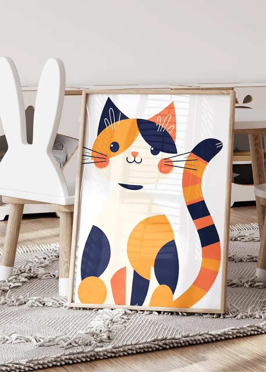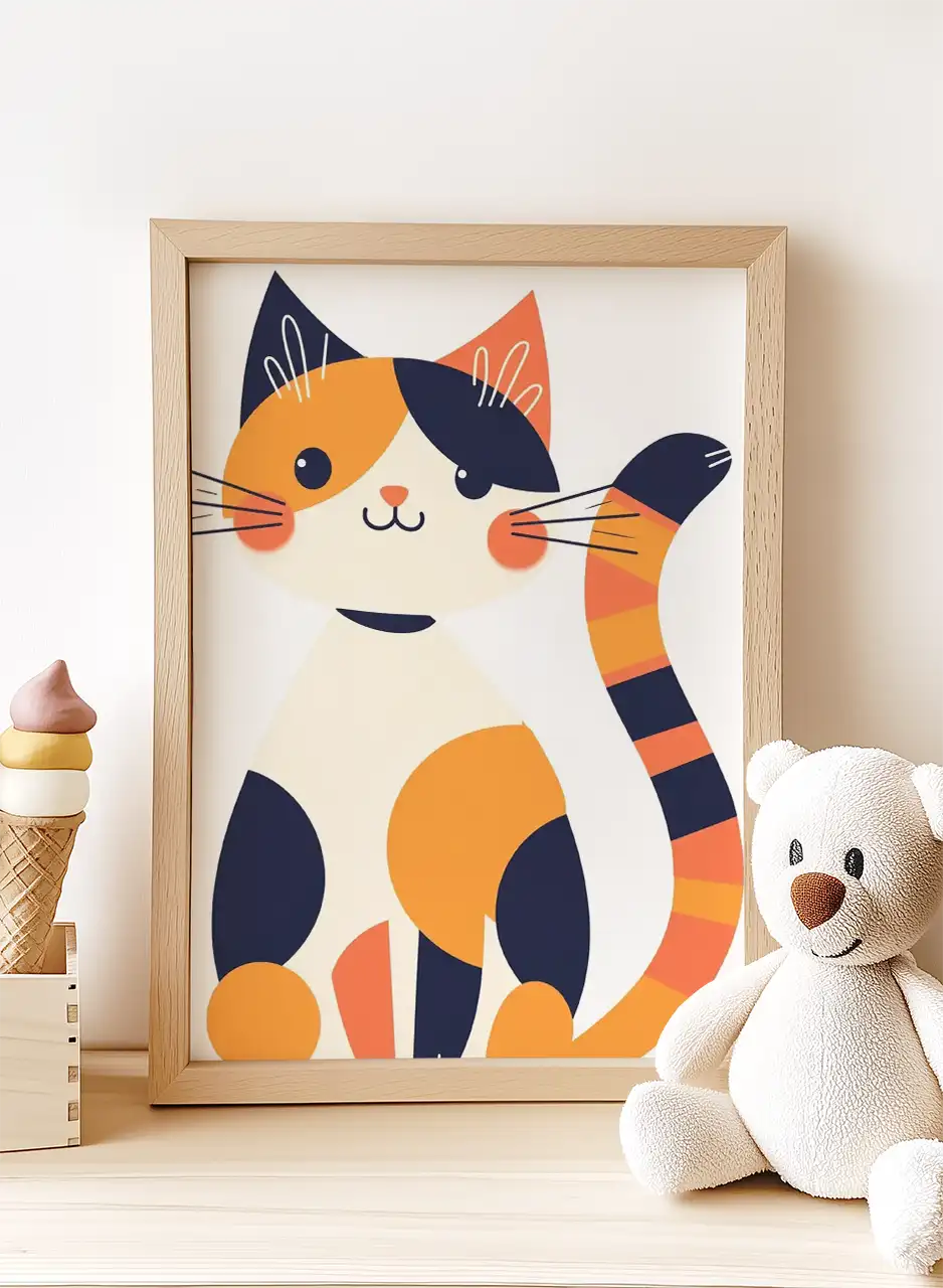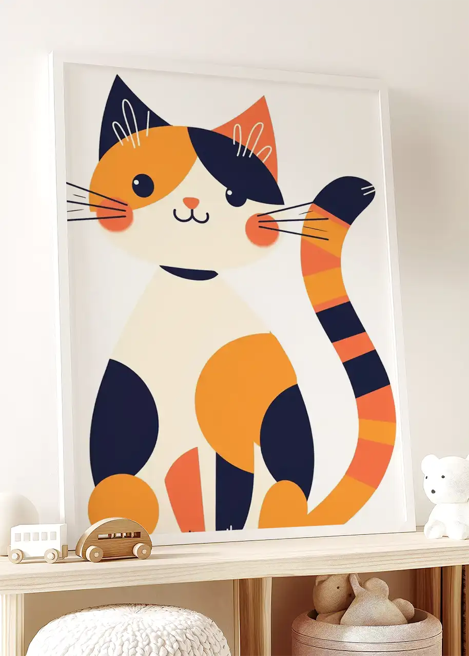 Kontrastowe plamy i pasiaste detale ogona wprowadzają wizualny rytm. Zaokrąglone formy nadają kompozycji miękkość, a intensywne akcenty kolorystyczne ożywiają przestrzeń.