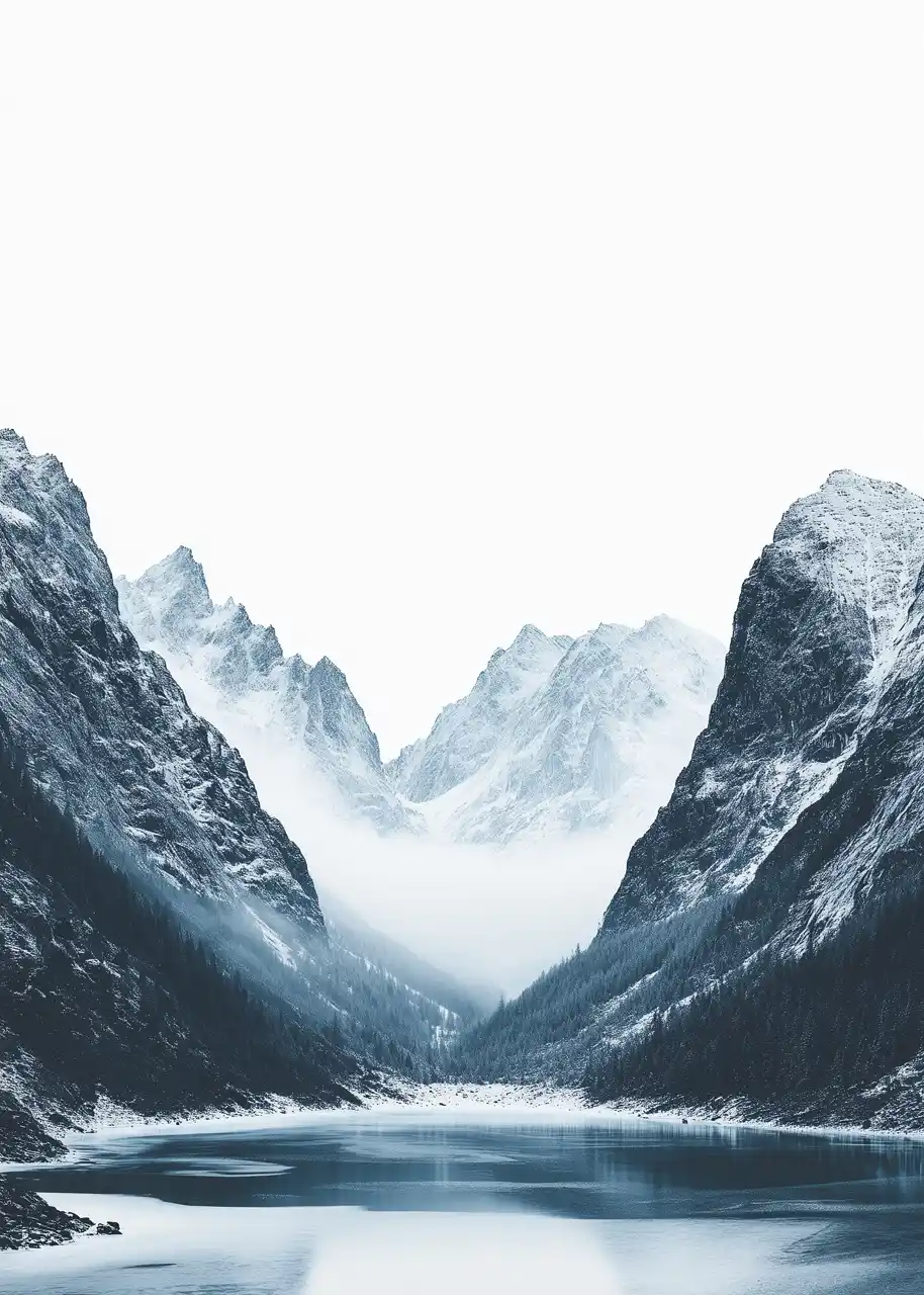 Symetria doliny buduje poczucie stabilności, a odbicie wody wprowadza dodatkową warstwę głębi. Kontrast między śniegiem a ciemnymi zboczami nadaje kompozycji wyrazistość.