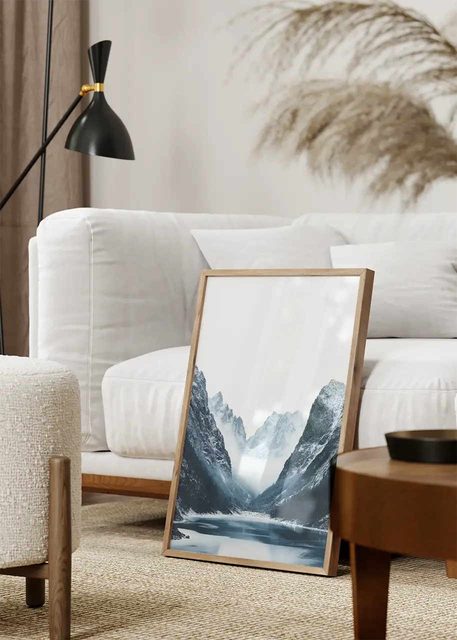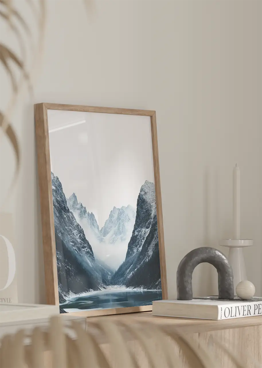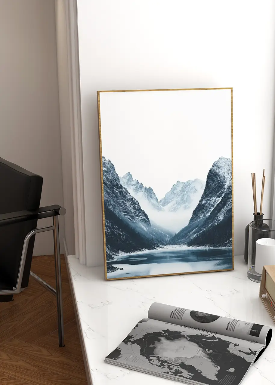 „Plakat Kraina wiecznego chłodu” ukazuje górską dolinę z symetrycznie rozłożonymi zboczami, które prowadzą wzrok ku centralnemu punktowi – zamglonym, ośnieżonym szczytom w tle. U podstawy kompozycji znajduje się spokojne jezioro odbijające fragment krajobrazu.