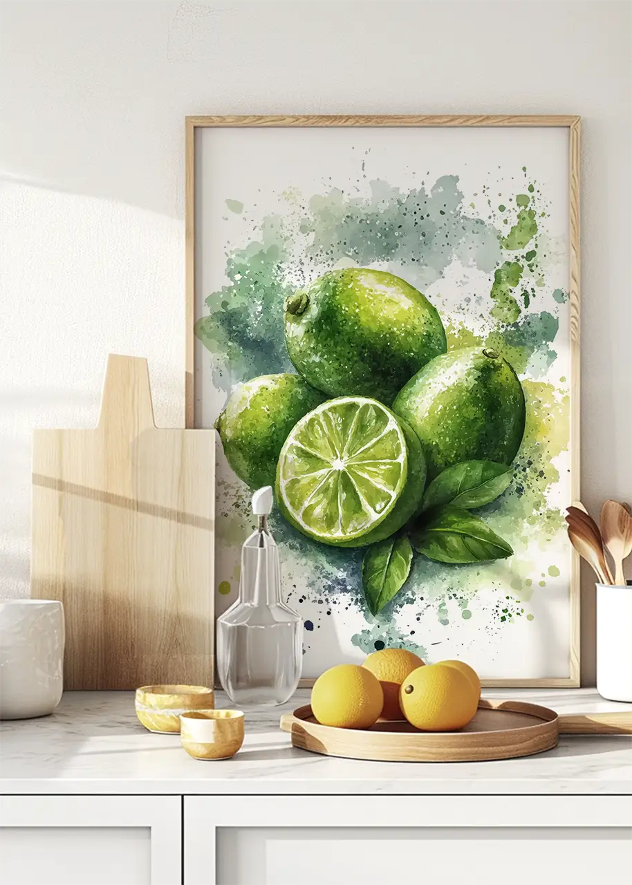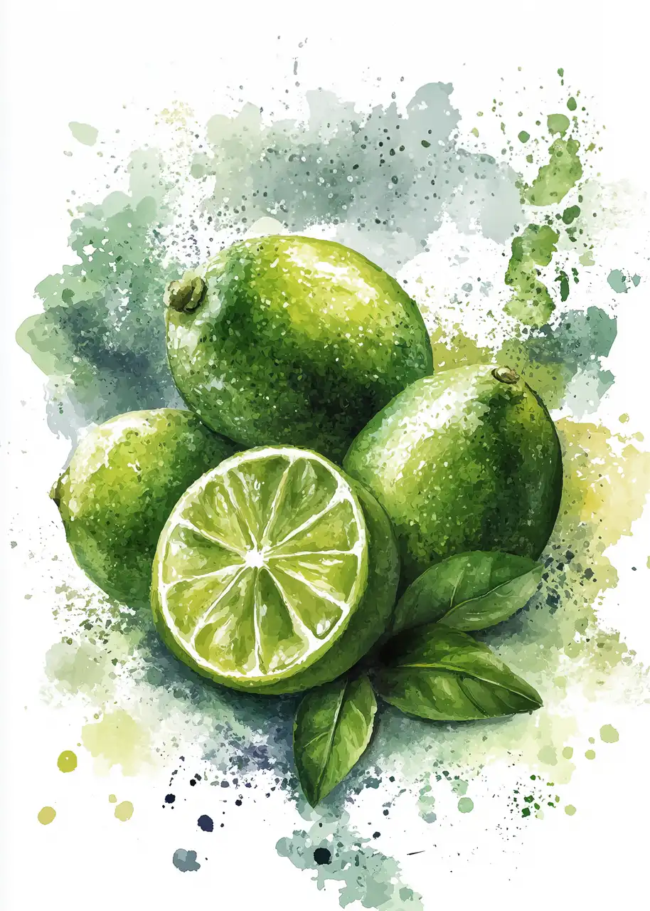 Kompozycja plakatu skupia się na centralnie umieszczonych owocach limonki. Akwarelowe plamy i rozpryski farby w tle nadają ilustracji artystycznej swobody.