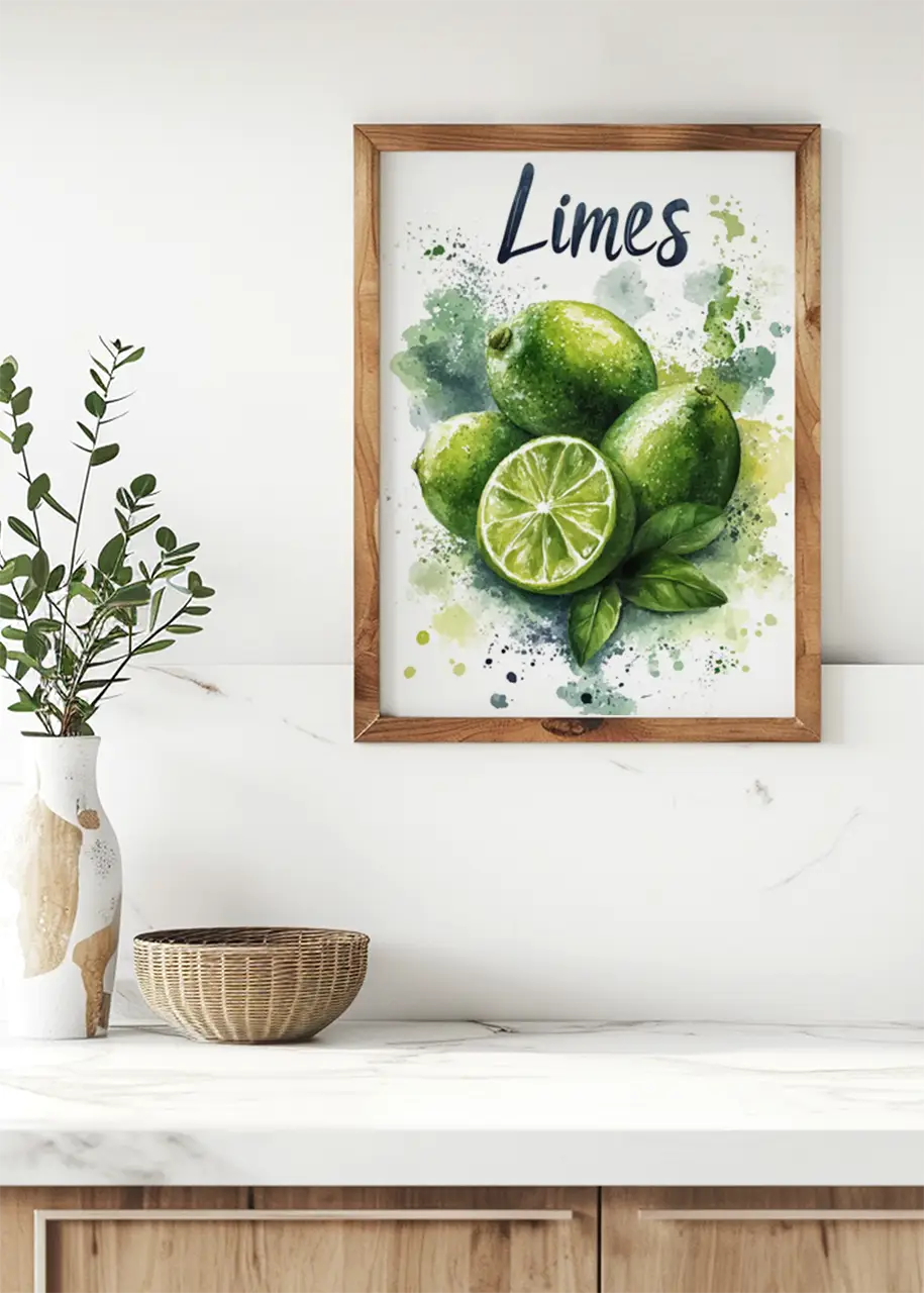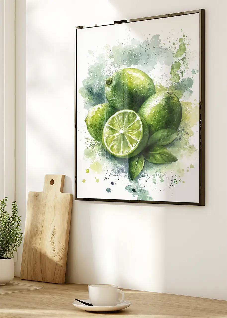 Plakat „Limes I” przedstawia artystyczną ilustrację limonek wykonaną w malarskim stylu akwareli. Kompozycja ukazuje kilka całych owoców oraz jedną przekrojoną limonkę, która odsłania charakterystyczny układ soczystych cząstek.