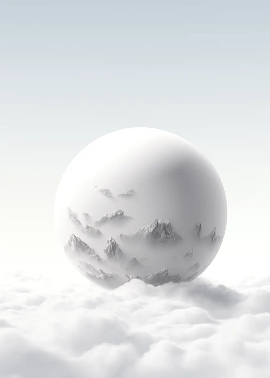 Kompozycja utrzymana jest w monochromatycznej palecie bieli, jasnej szarości i delikatnych cieni. Światło modeluje powierzchnię kuli, podkreślając wypukłości i zagłębienia gór. Tło pozostaje czyste i minimalistyczne, co wzmacnia centralny punkt kompozycji.